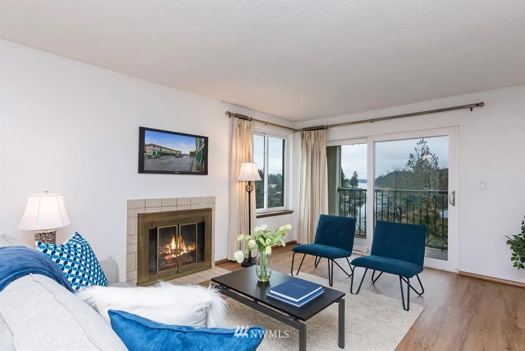 What a great place to call home! This cute, clean, updated condo has all the space you need for less than the cost of rent. The end unit features 2 bedrooms, a master bath, wood burning fireplace, well designed living space, and a wonderful water view. Covered parking is right in front of elevator access to the unit floor for an easy entrance. HOA dues cover water/ sewer/ garbage/ cable/ common area maintenance/ building insurance/ private secure storage area.