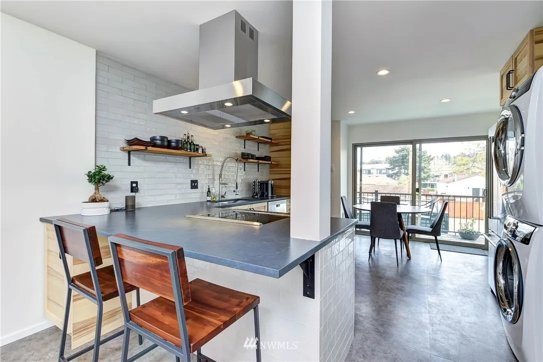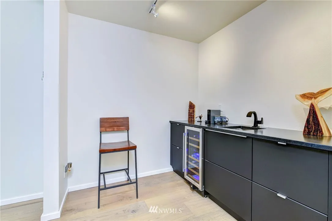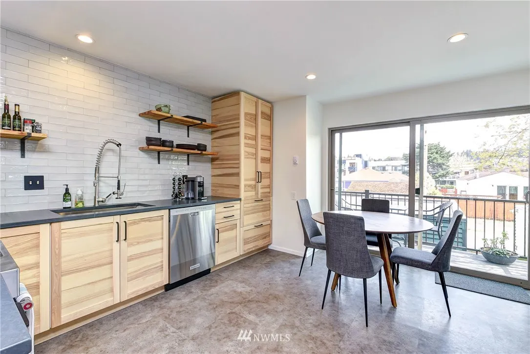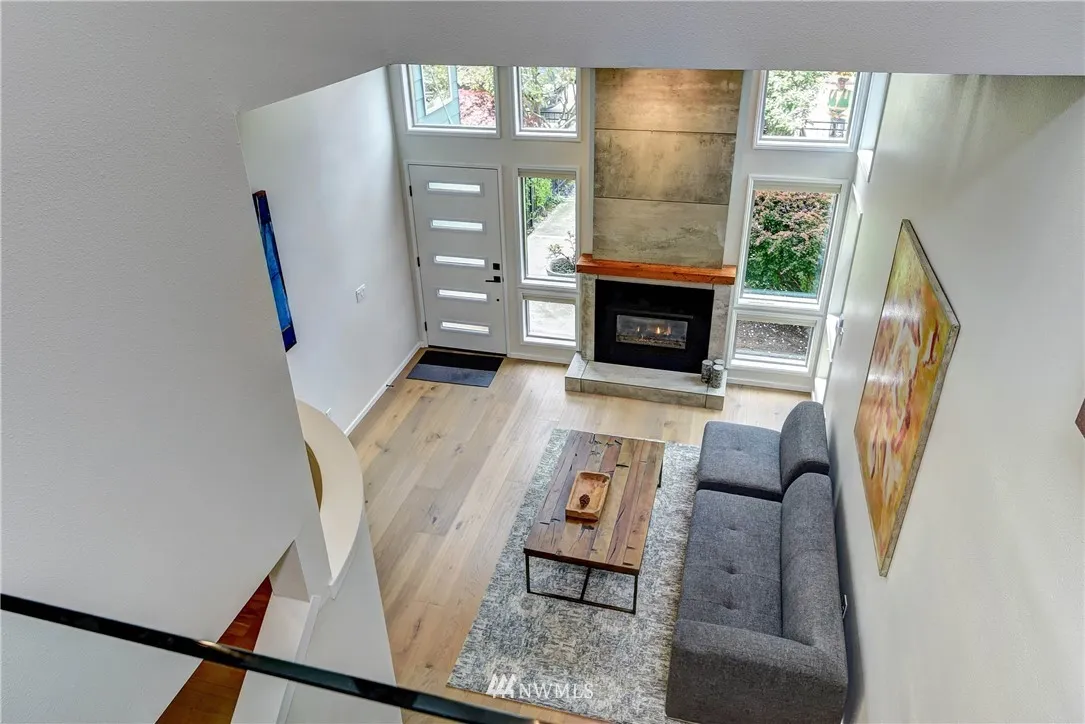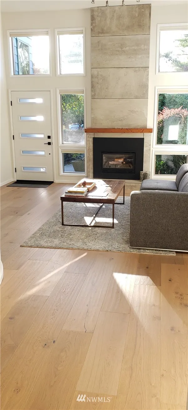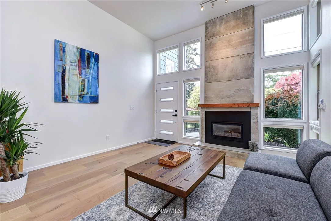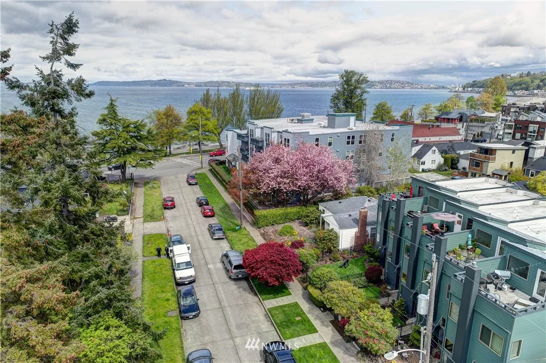 Stunning Alki Beach Townhome steps from the beach! Relax to sound + mountain views or walk along the beach to restaurants and coffee just a block away. Flooded with light this large 3 bdrm/1.75 bath home offers modern design + rare four separate outdoor living spaces. 12 ft gas fireplace, wide plank eng oak flrs open to a soaring central atrium. Updates incl large kitchen w/stone countertops, mini bar w/wine fridge & custom tiled bathrooms. All new siding,windows+doors in 2018. Detached garage.