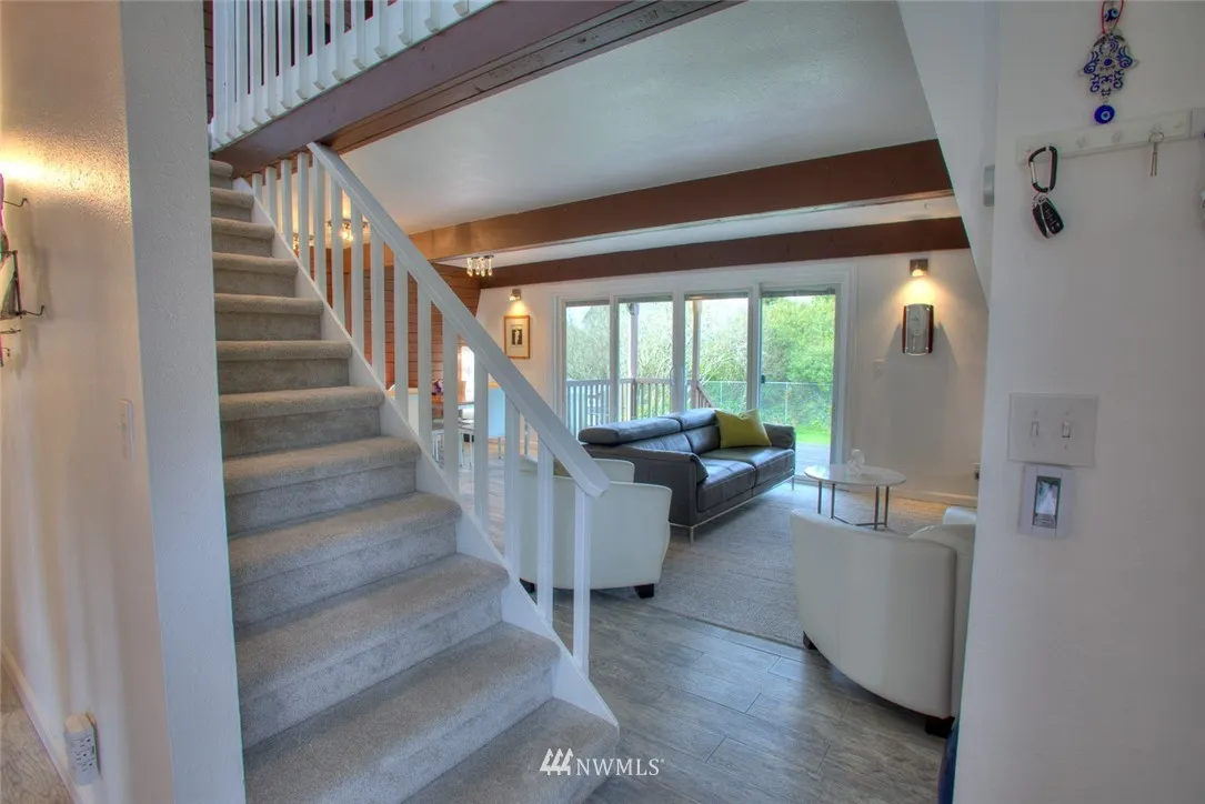 2.5 story beach house on 2 LG lots. Tastefully remodeled, fresh paint, heated plank porcelain tile floor, carpet upper, windows dbl hung, cust blinds, 12’ sliders both levels providing abundance of light. Upgrades inc. lighting, elec, plumb, keyless entry, jetted tub, S/S appliances. 2 LG decks add indoor/out living space. Huge 800sq’ garage w/24 can lights ready to add your touch, shop, rec… Fenced yard - covered pet run, sprinkler syst, LG patio, loads of privacy w/beautiful sunset views.