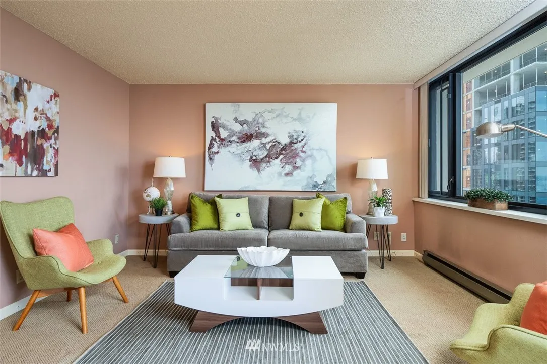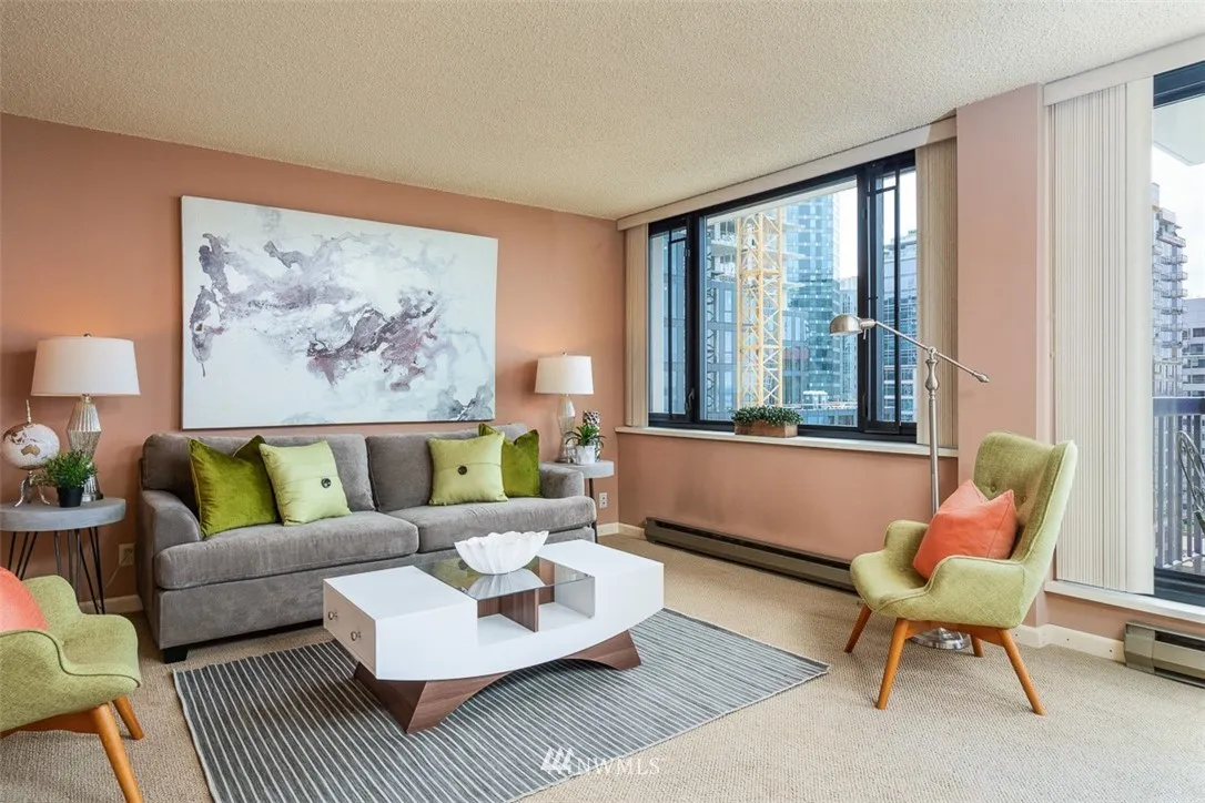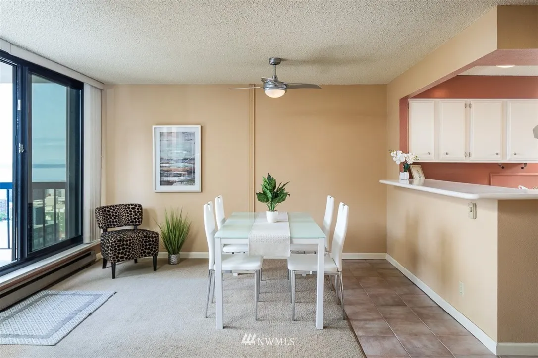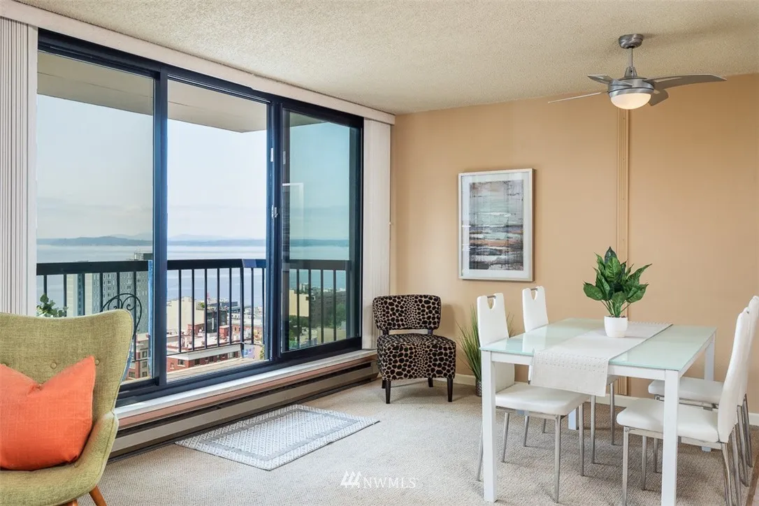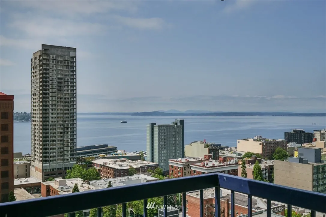 Panoramic 180 degree Views of Downtown, Puget Sound & Olympic Mountains! Stylish 2 bedroom 2 bath condo full with amenities. Sizable living & formal dining room with floor to ceiling windows & adjacent viewing deck! Efficient kitchen with comfortable eating bar & plenty of cabinets.Generous mstr suite,with sitting rm,walkin closet/private 2nd deck.Enjoy gym,heated outdoor pool,veranda for entertainment & BBQ.HOA dues include water/sewer/garbage/electricity/cable/hot water/heat. AC available.
