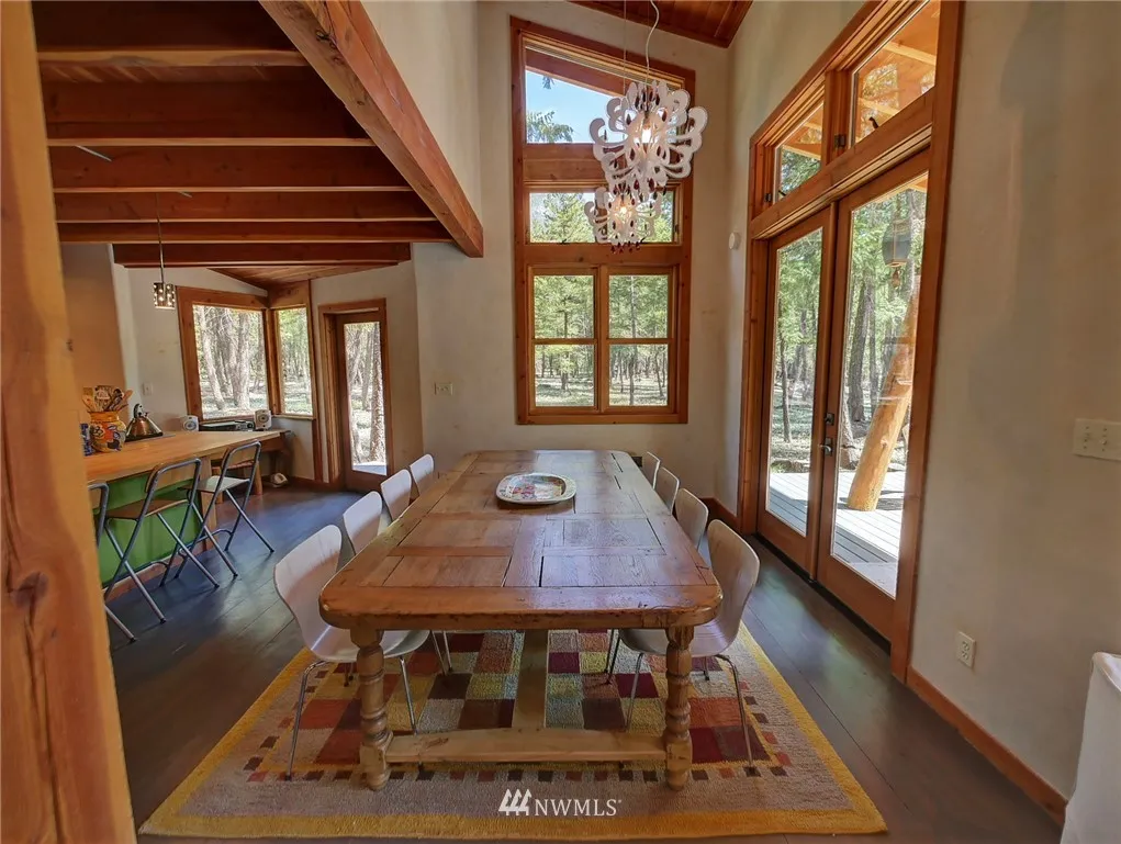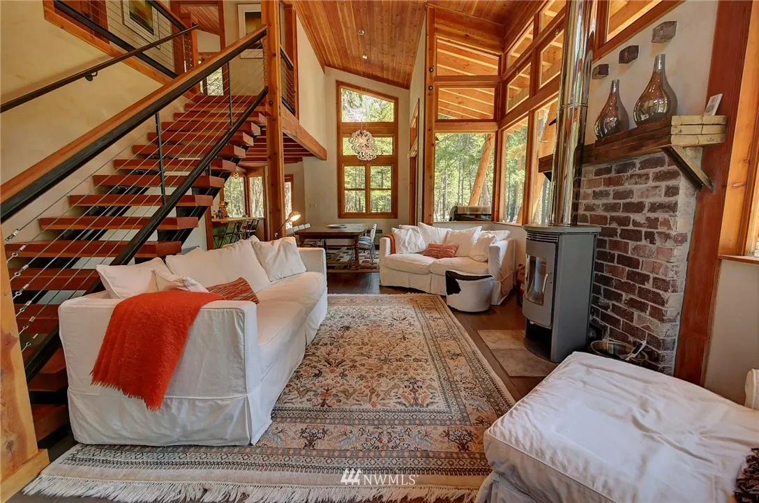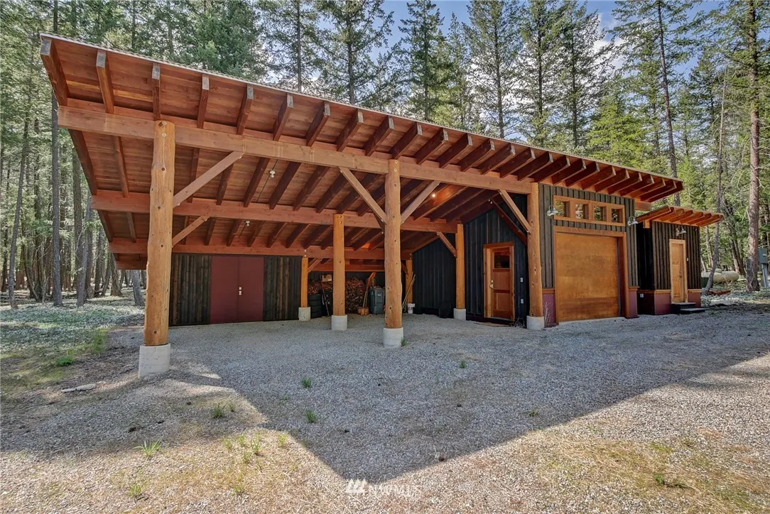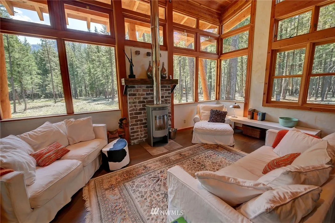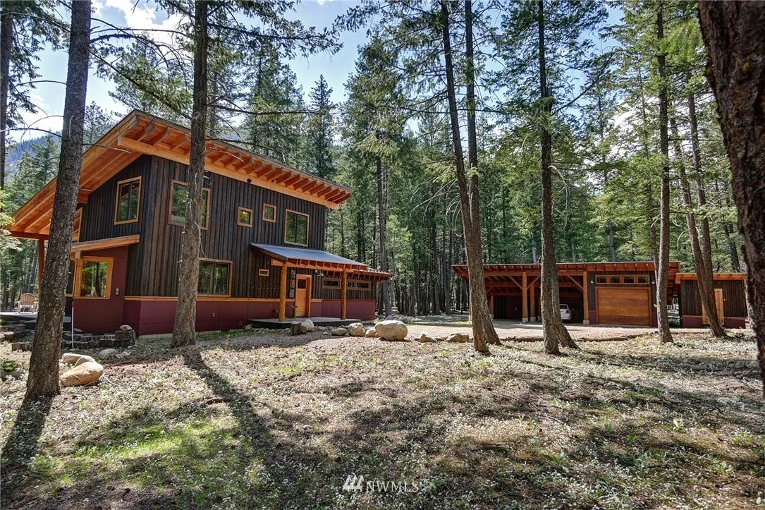 Contemporary Mazama home--the perfect Methow Valley style! Create a view of Goat Wall w/selective tree thinning. Bold lines & creative use of natural materials. Logs from the property milled for beams & flooring. Lots of glass in great room. Butcher block kitchen counters & walk-in pantry. Beautiful stairway w/custom railing--so many unique details. Two upper bedrooms w/wool carpets. Main floor room w/French doors for master bedroom or family room.The perfect 5-acre base camp for your Methow fun