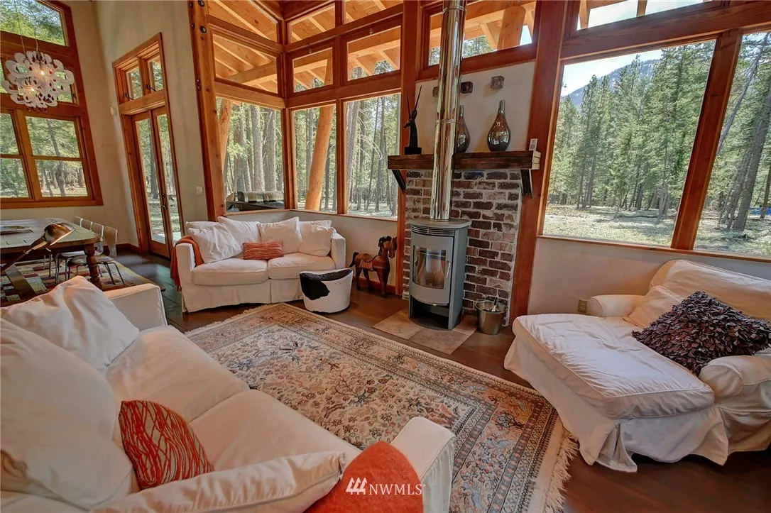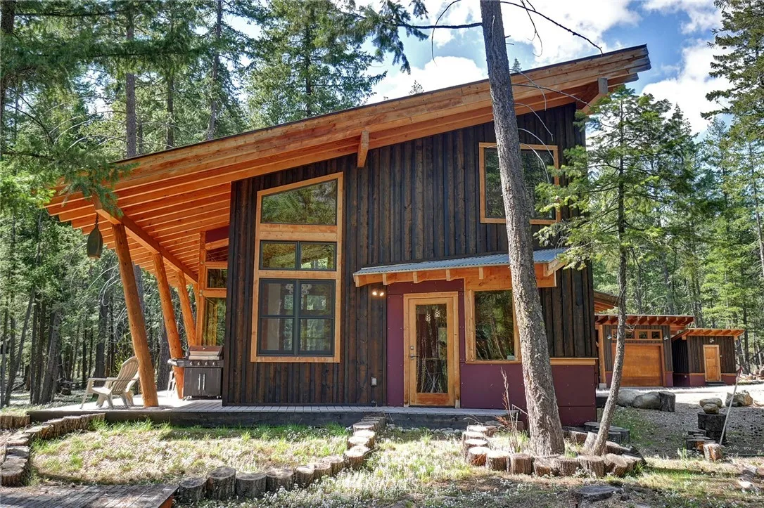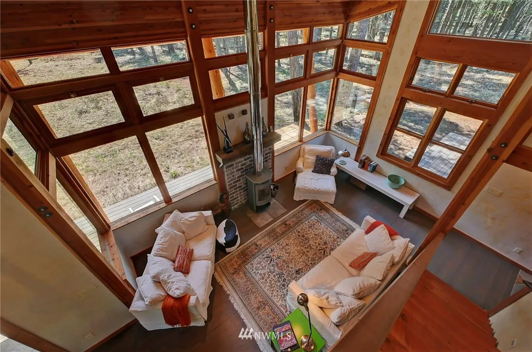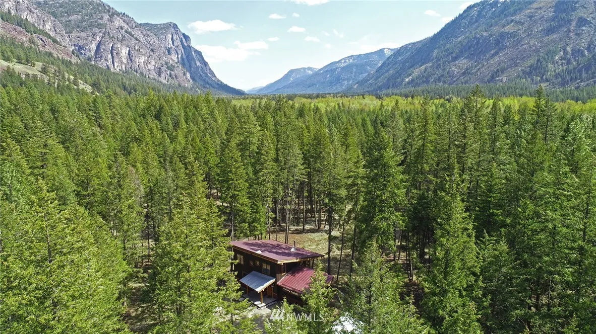 Contemporary Mazama home--the perfect Methow Valley style! Create a view of Goat Wall w/selective tree thinning. Bold lines & creative use of natural materials. Logs from the property milled for beams & flooring. Lots of glass in great room. Butcher block kitchen counters & walk-in pantry. Beautiful stairway w/custom railing--so many unique details. Two upper bedrooms w/wool carpets. Main floor room w/French doors for master bedroom or family room.The perfect 5-acre base camp for your Methow fun