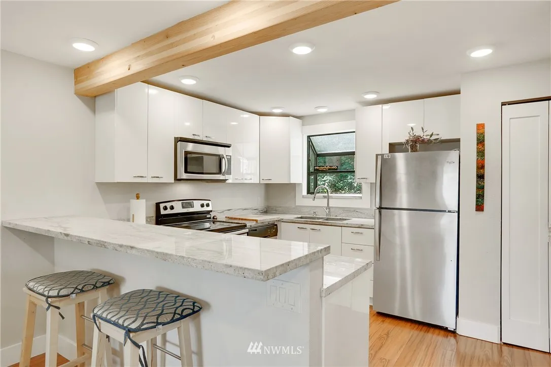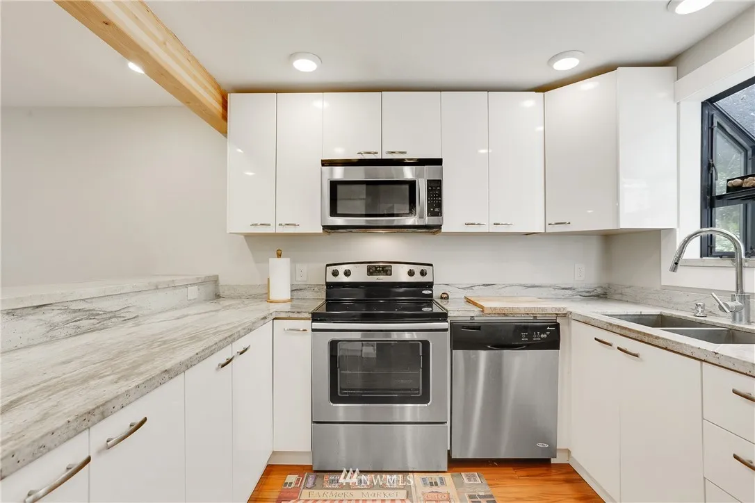 Stunning remodeled turnkey home w/modern design. Great layout w/3rd bedroom/den, 3 levels & large garage w/storage & built-ins. Brand new kitchen w/modern cabinets, SS appliances, granite slab counters & breakfast bar. All 3 bathrooms are brand new w/granite slab counters, modern vanities, tile & fixtures. Brand new wall heaters, flooring, millwork, doors & light fixtures. Sharp 2 tone paint throughout. Master & great room decks. Private setting in corner of property = extra parking & views.