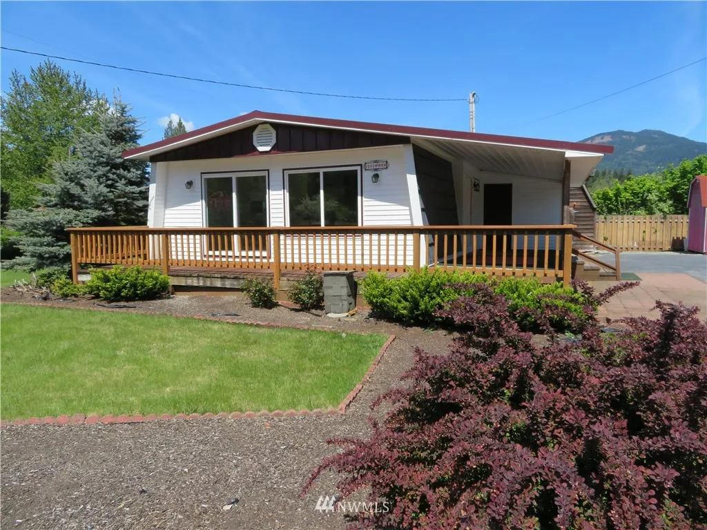 Upgraded inside and out! Great location walking distance into the town of Darrington. Large corner lot with Mountain View and mature landscaping. Wrap around deck. Upgrades includes new flooring, freshly painted, new light fixtures, doors and kitchen sink. All appliances stay including full size washer/dryer. Forced air furnace and A/C. Large double car garage w/shop. Metal roof. Outbuildings with/separate toilet & sink. Plenty of off street parking for RV's or boats. Move in ready!