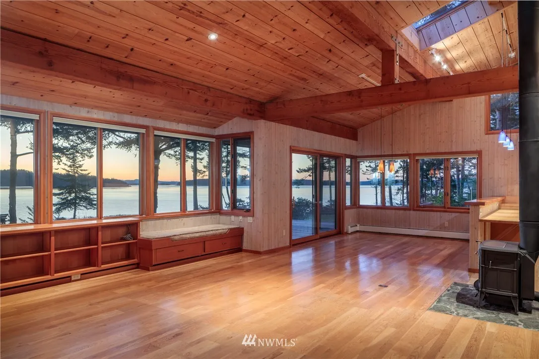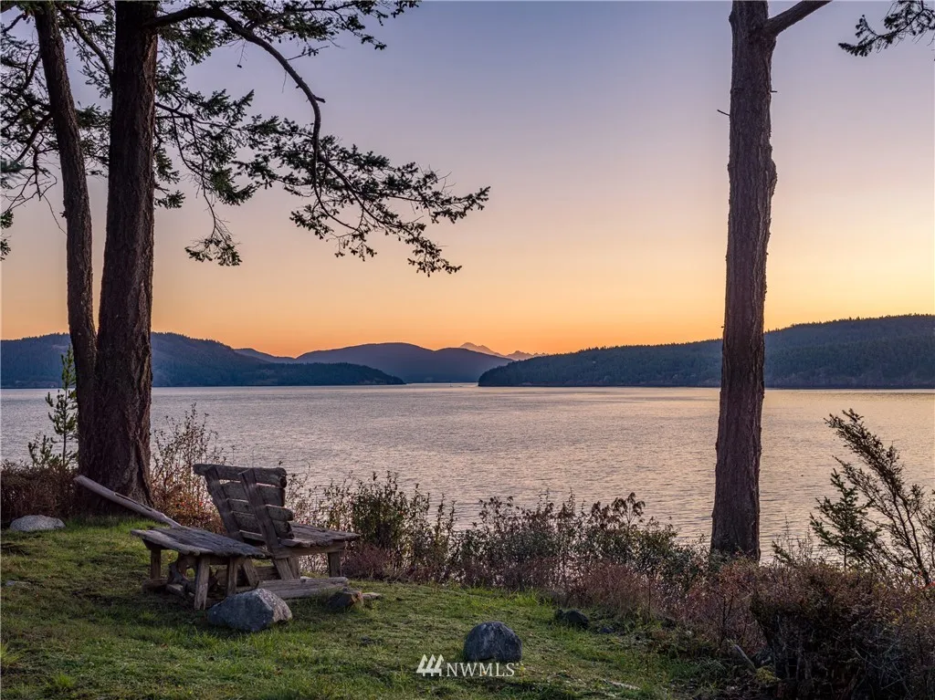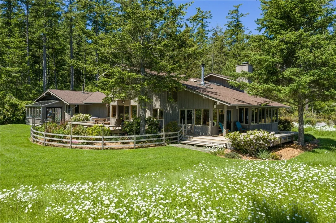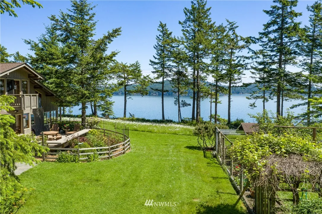 ULTIMATE BAKERVIEW PRIVACY from this custom designed home tastefully sited on nearly 15 ac with 733 ft of frontage. Sweeping marine, mountain & island views from this 4BD, 2.5 BA home incl bonus room. Native stone fireplace, built-in bookcases & window seats, fir cabinets & trim, oak floors, reclaimed flour mill beams are just a few of the special touches. The log guest house tucked into the woods is a special treat. Attached garage & shop, greenhouse & garden, trails & stairs to beach.