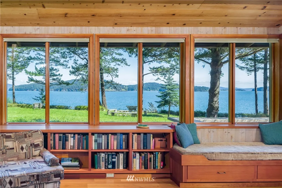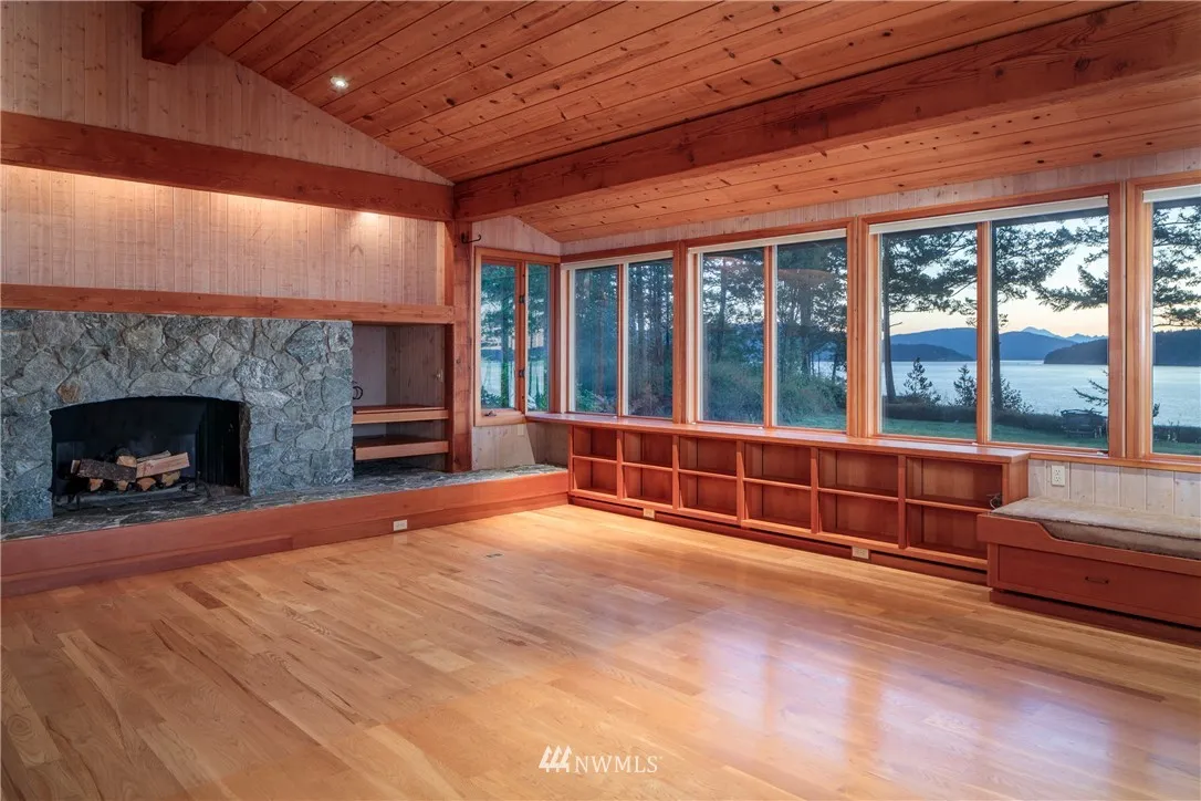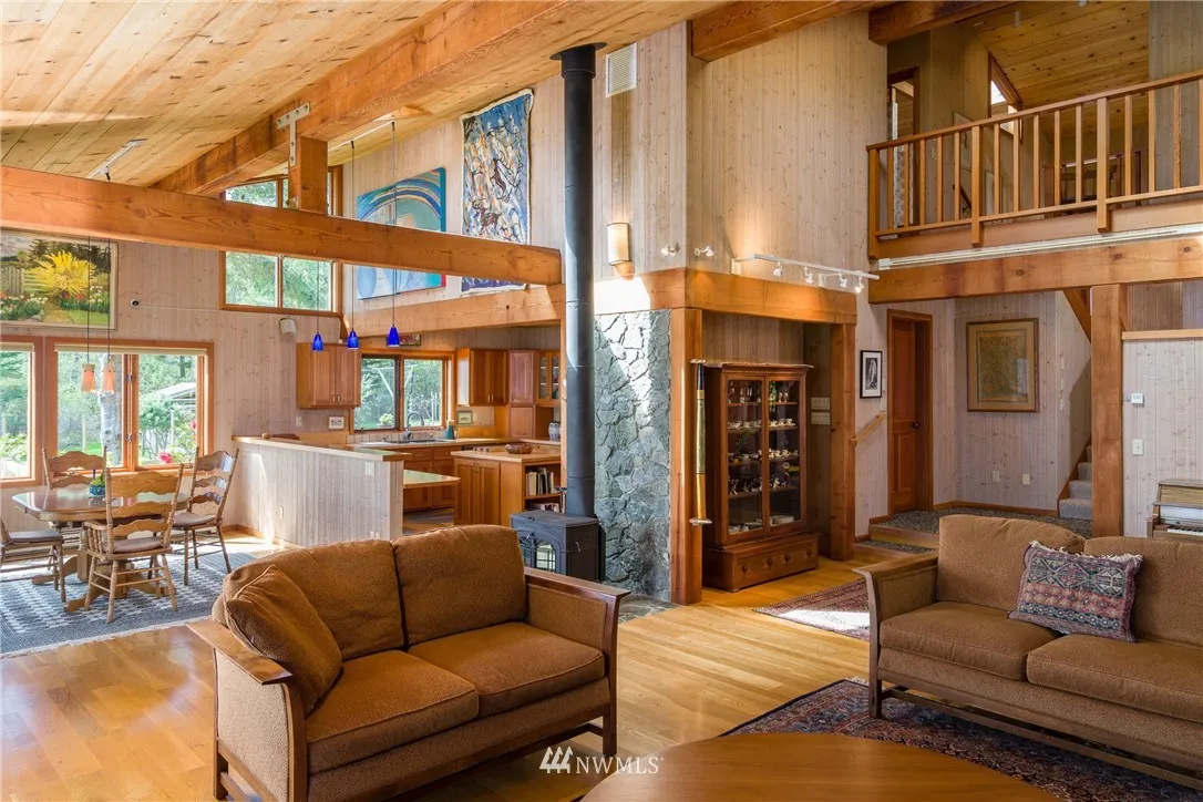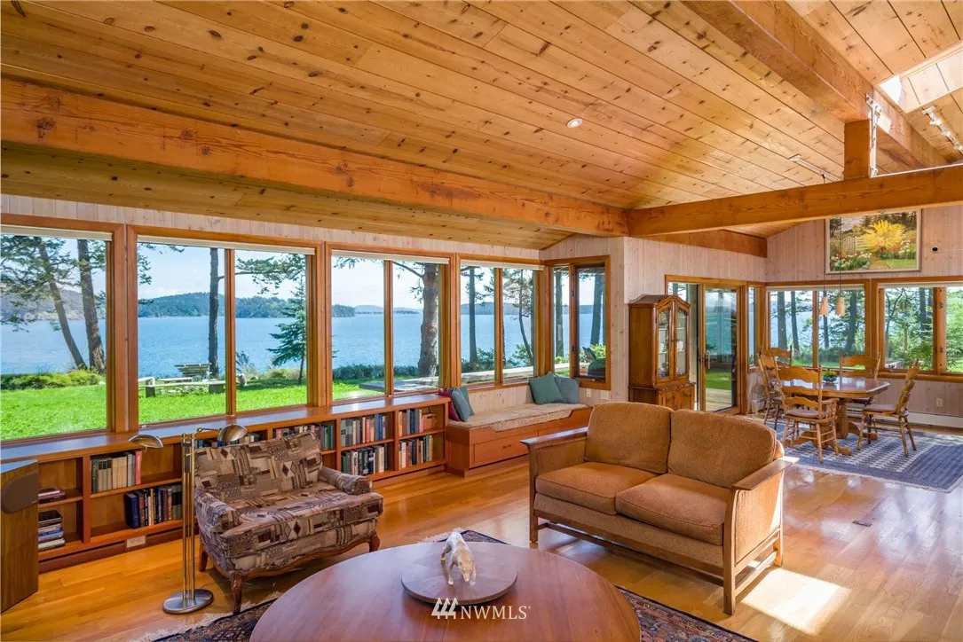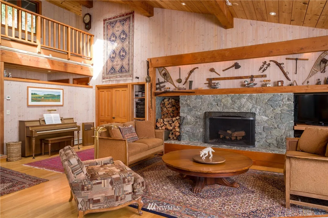 ULTIMATE BAKERVIEW PRIVACY from this custom designed home tastefully sited on nearly 15 ac with 733 ft of frontage. Sweeping marine, mountain & island views from this 4BD, 2.5 BA home incl bonus room. Native stone fireplace, built-in bookcases & window seats, fir cabinets & trim, oak floors, reclaimed flour mill beams are just a few of the special touches. The log guest house tucked into the woods is a special treat. Attached garage & shop, greenhouse & garden, trails & stairs to beach.