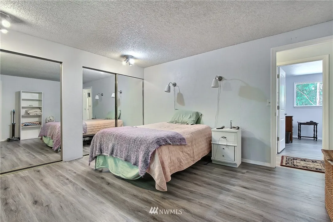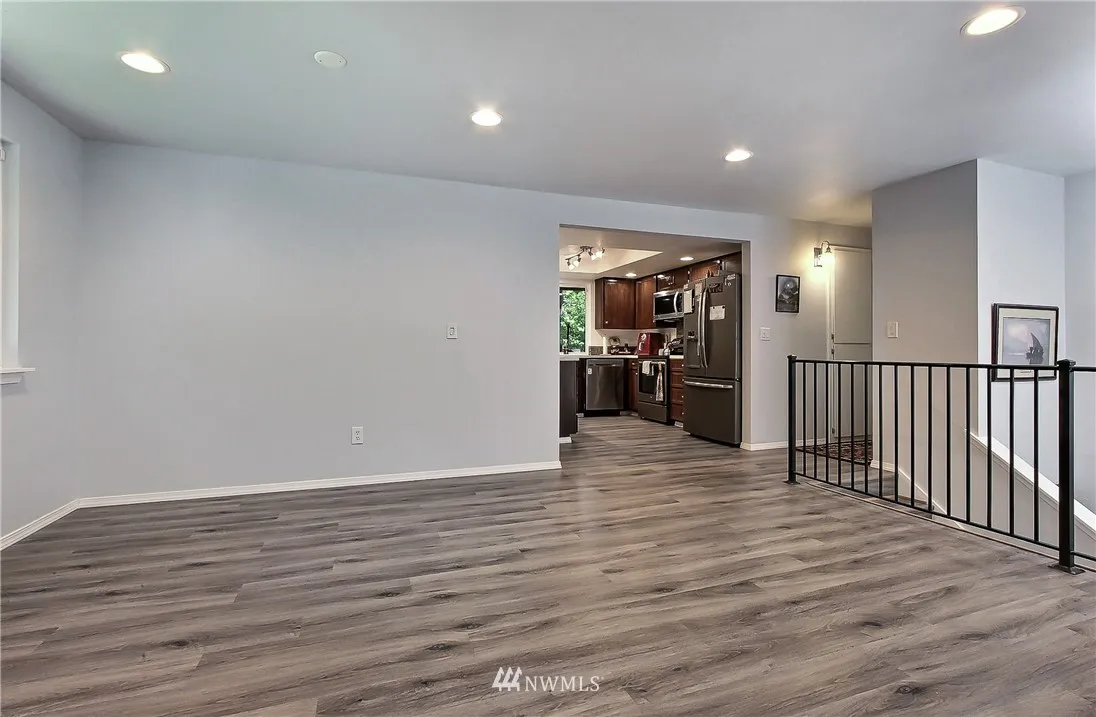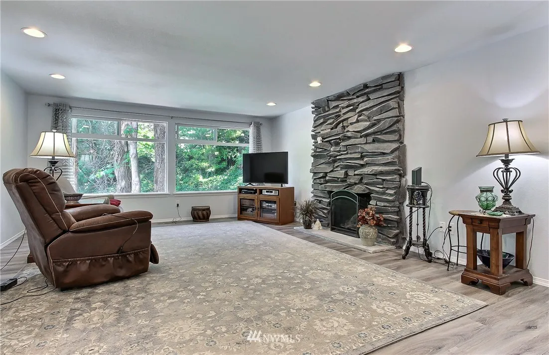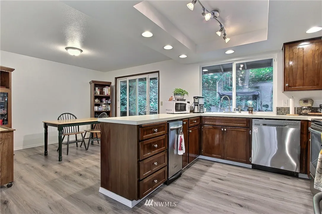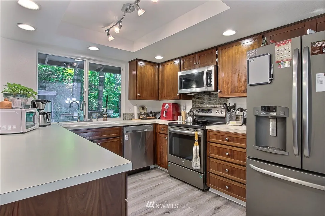2nd buyer financing failed! Your opportunity! Shy 1/2 acre easy care yard near Chambers Cr. 4 bdrms privacy & space, loads of storage! The soothing sound of the creek as it cascades by can be heard from the deck. Features: new quality vinyl floors throughout the home, SS appliances, chandelier at the entry, 3 bdrms upper floor, updated bathrooms w/custom tile work. Lower level features, large family rm, fireplace, bdrm,utility & 3/4 bath. Move in ready, seller adjusted price for quick sale.
