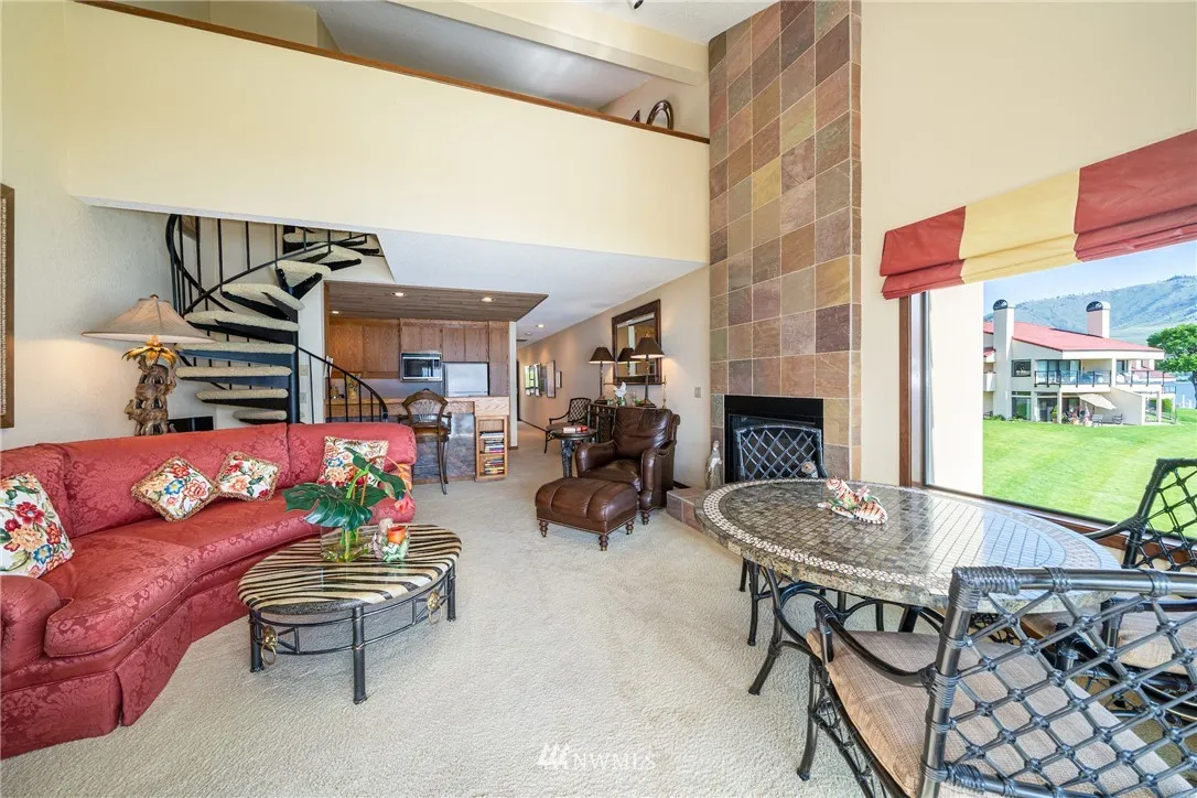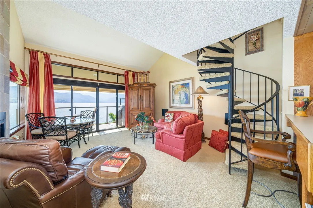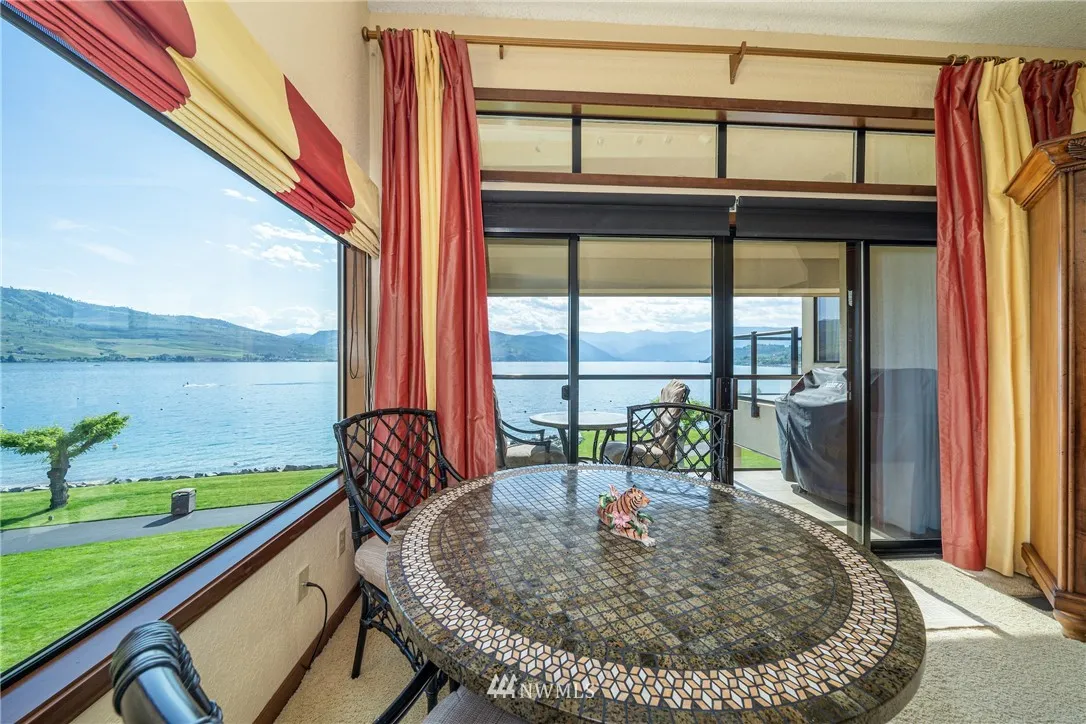 Location, Location - Water's Edge Beach Front Condo at Lake Chelan Shores. Corner unit with 2 bdrms, 1 bath and a full dimension, panoramic, unobstructed view of Lake Chelan & Stormy Mountain. Located in the most desirable building in the complex #11. Open floor plan with fireplace, covered balcony for entertaining and high end decor. Very clean, cozy and meticulously maintained. New hot water tank & air conditioning. This upper floor unit can also be used for income producing property.