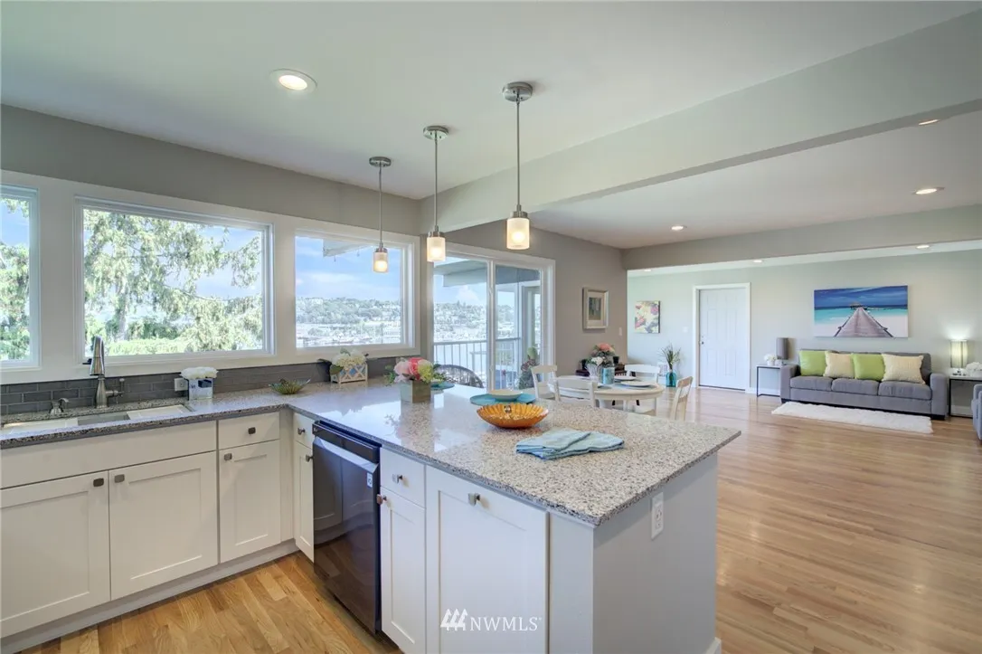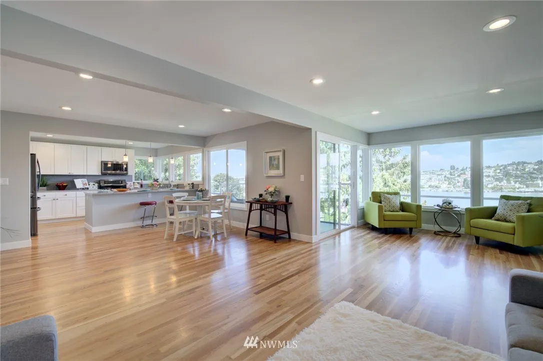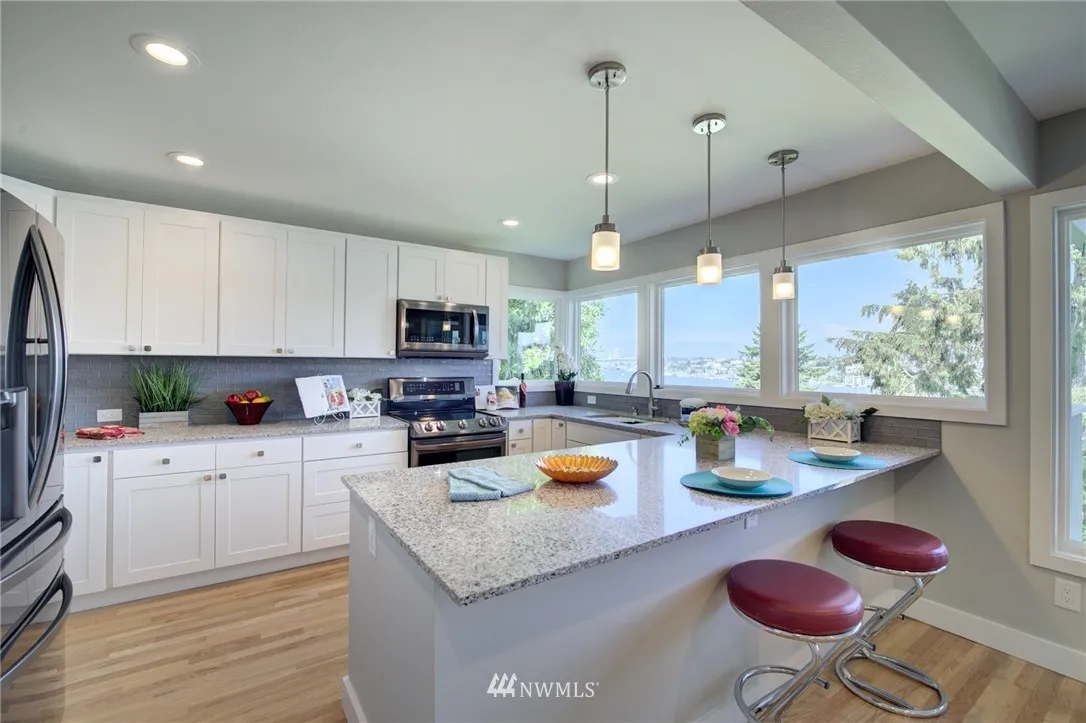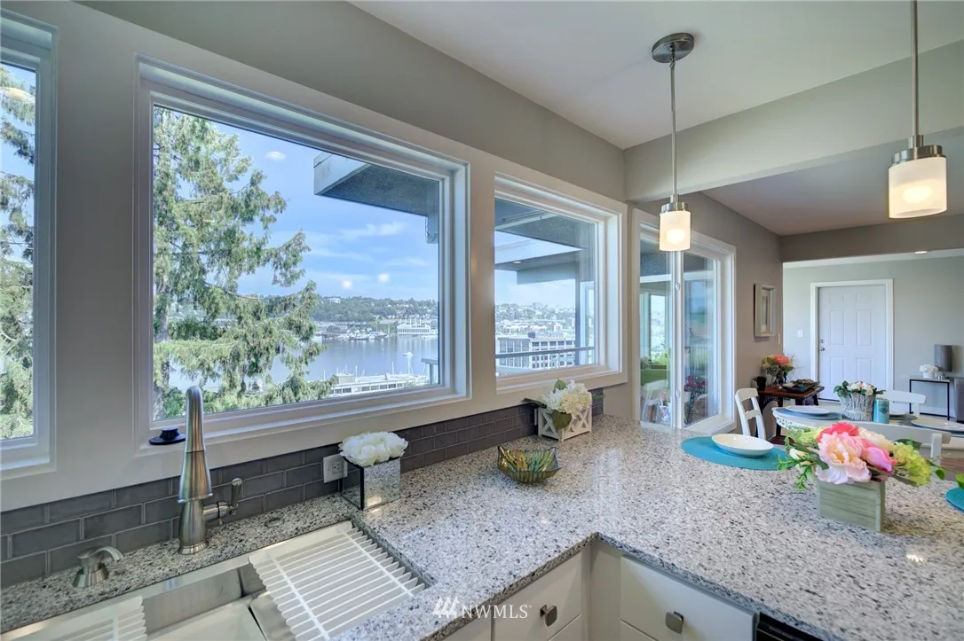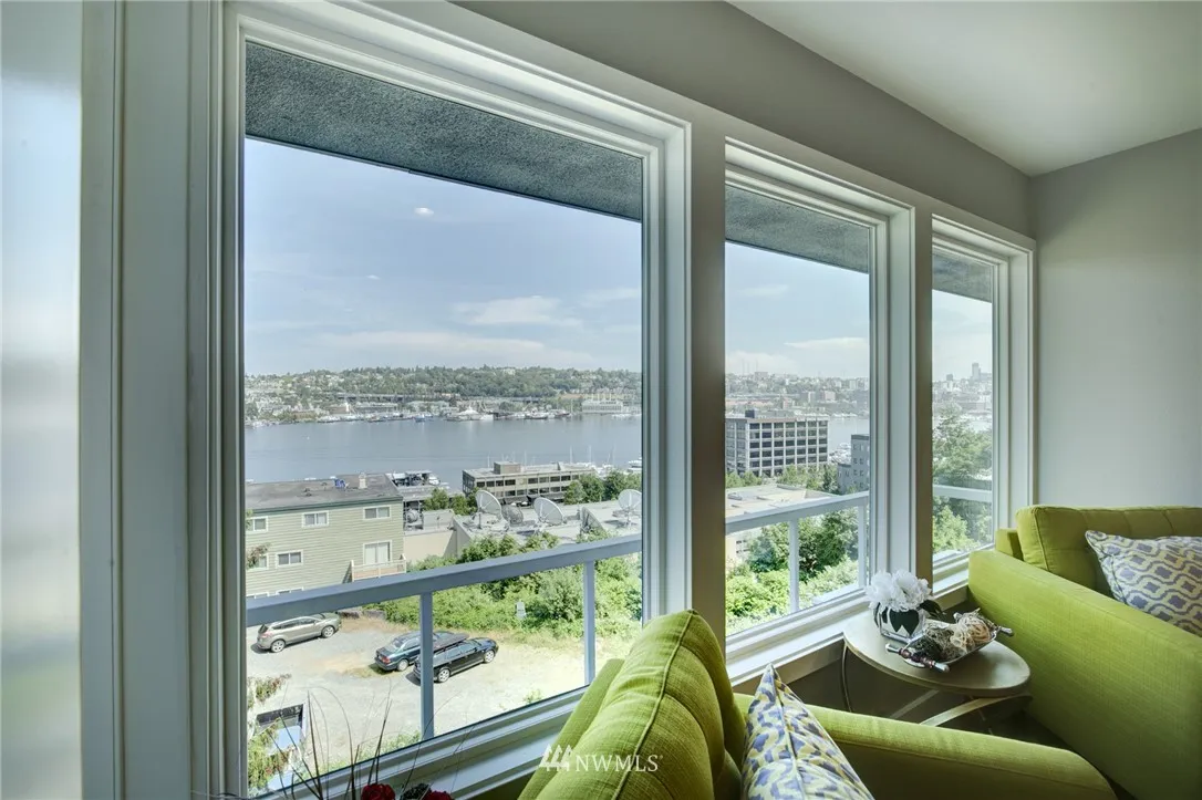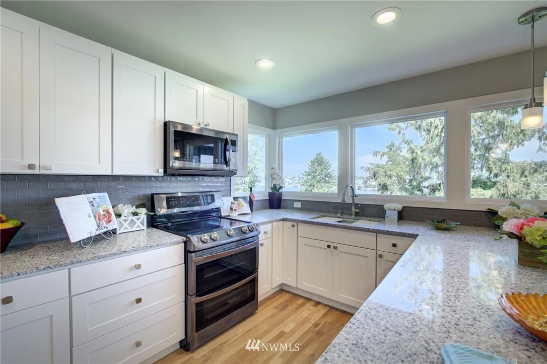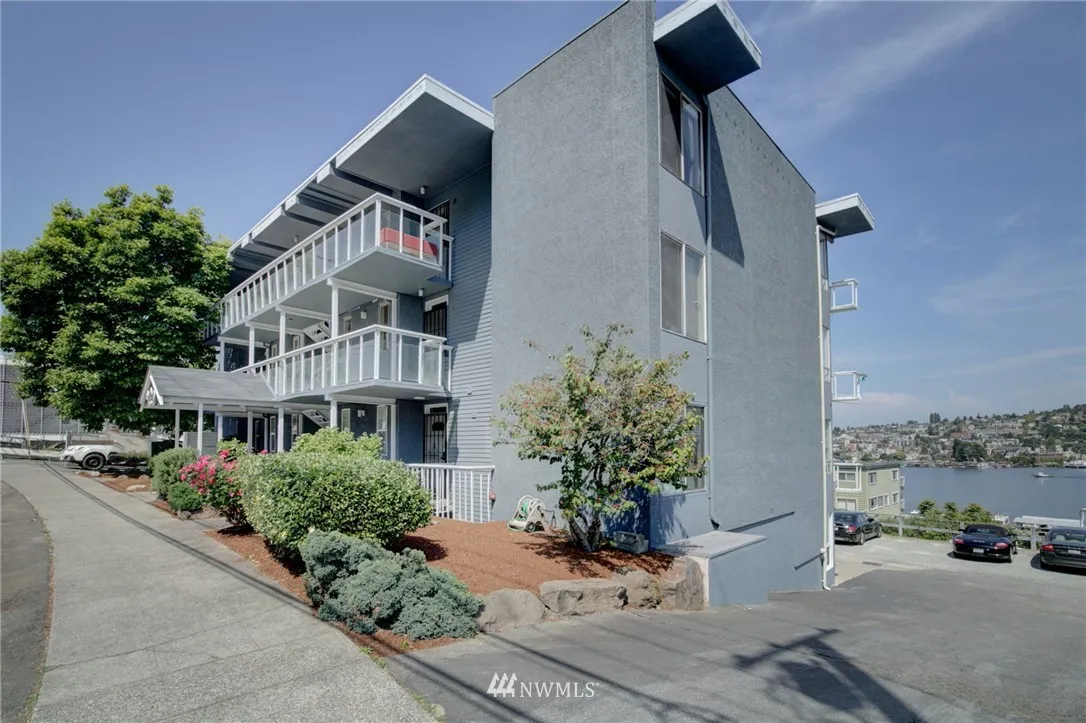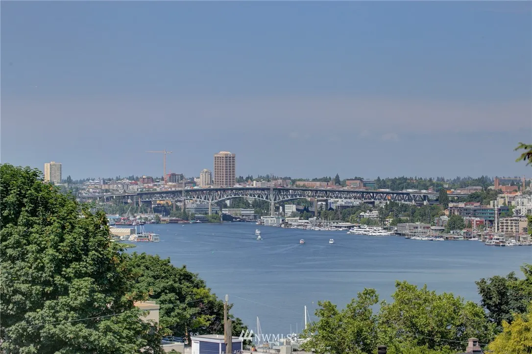 Spectacular sunny sweeping bay, mt, lk views from every kitchen, living area room window. Brand new updates w/top quality appliances, windows, hardwoods, fixtures, paint! Top floor unit w/lg view balcony, peaceful and quiet, no shared walls, so private w/open floor plan, pantry, open kitchen, storage closet. Private parking right in front of building, far left space next to dumpsters. Great location, walk less than 1 mile to Amazon, restaurants, lake and Fremont. Incredible condo and location!