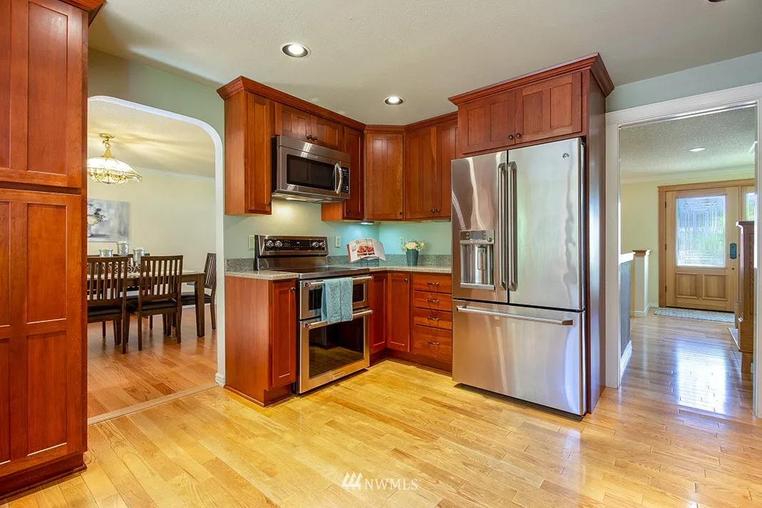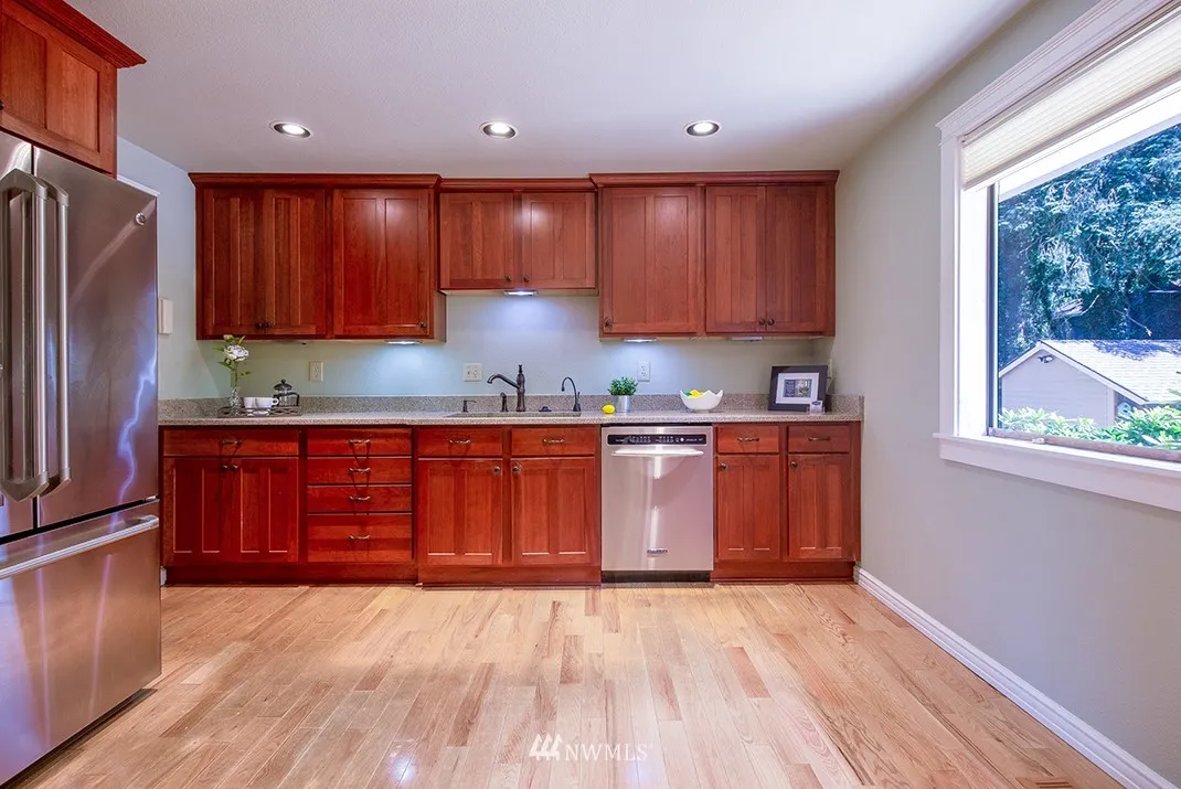 Buyer's Financing Failed! Great inspection and appraisal! Remodeled kitchen has beautiful cabinets, granite counters, and stainless appliances. Hardwood flooring thru-out the main level, stairs up and down, and hallway on upper level. Huge master bedroom and two more large bedrooms upstairs, PLUS lower level has a bonus room and 3/4 bath. Located on quiet street with park-like bkyd, including large deck and pergola draped in grape leaves from spring to fall. Don't miss the 140 sf storage shed!