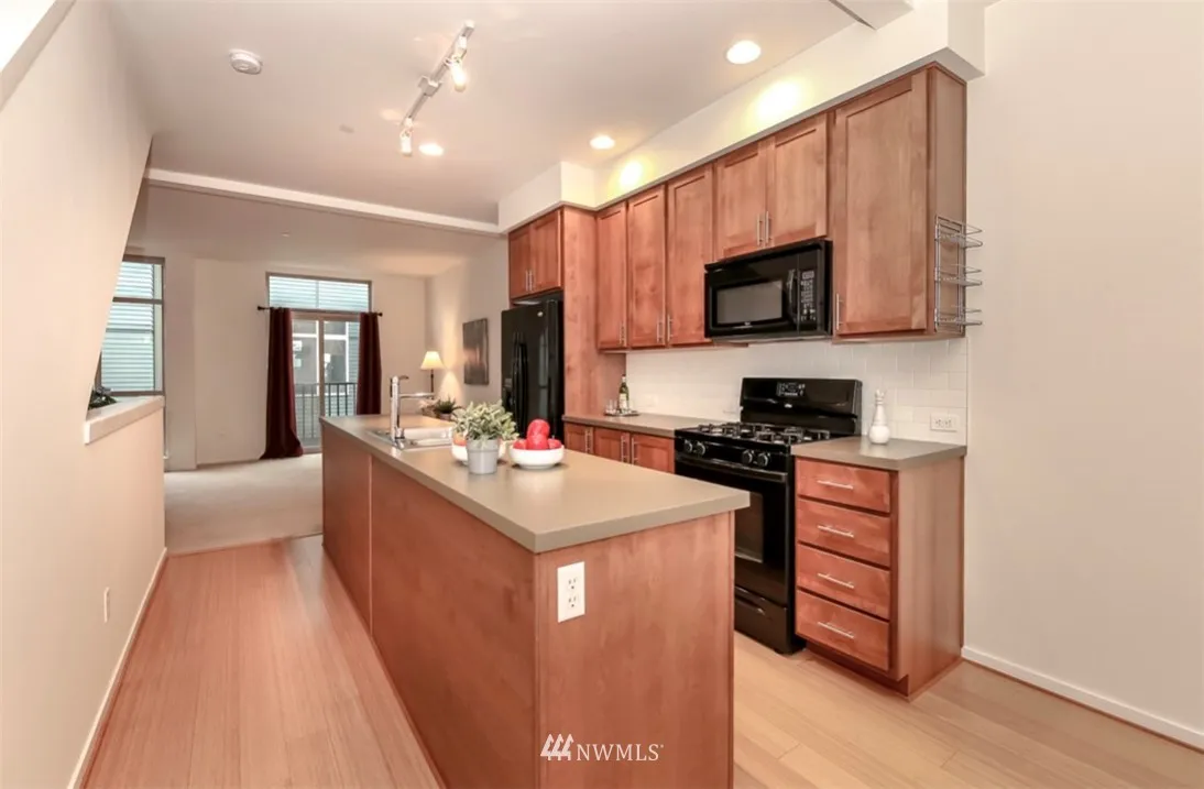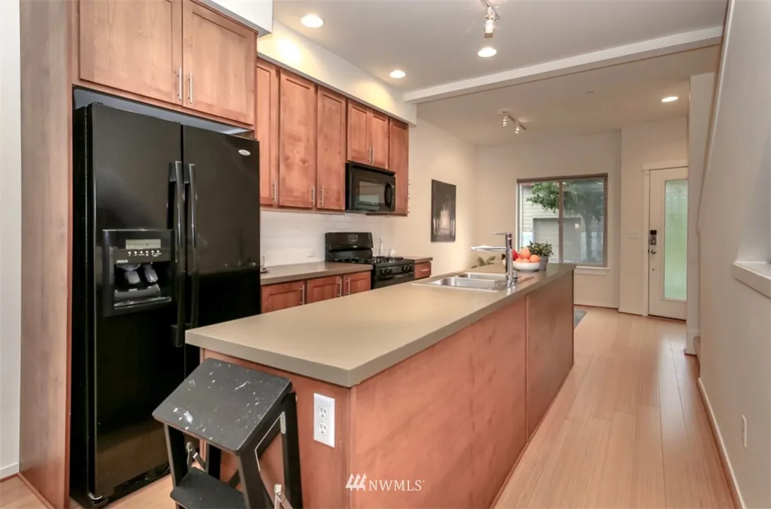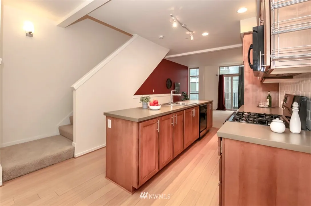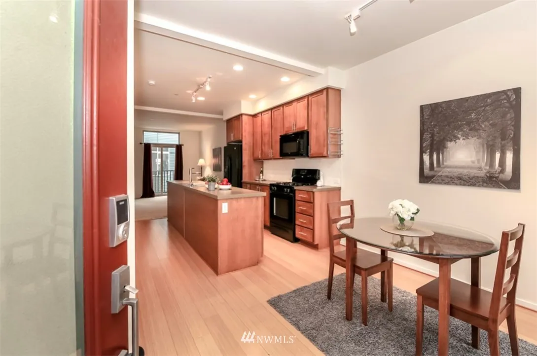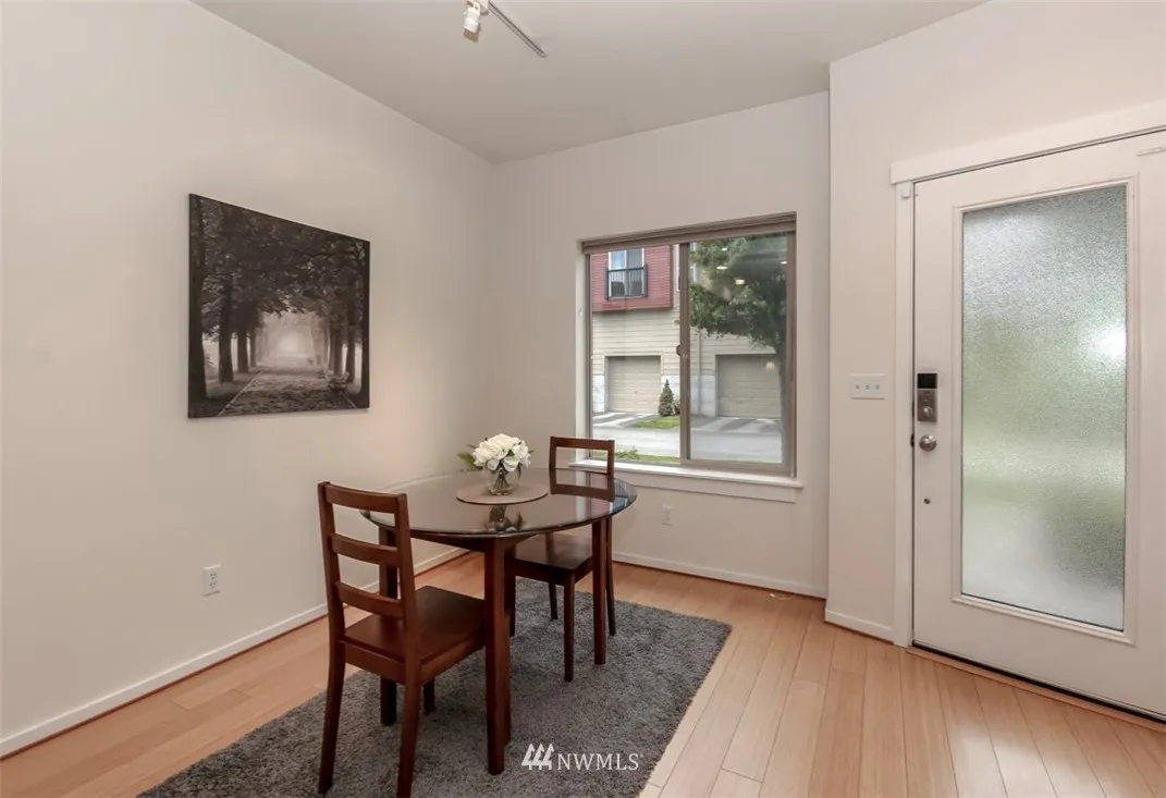 Affordable Urban City life at its best. Adorable Townhouse with bamboo wood floors and radiant heat. High Ceilings, 2 car tandem attached garage with storage shelves. Low taxes and HOA Dues. Great location close to new Town Center and UW, on main bus line, in the heart of all the new development. Chefs kitchen with large island and dining room off kitchen. Good Natural lighting. 2 beds,1.75 bath on upper level. 2 more years left with reduced taxes. Great potential Airbnb or rental.
