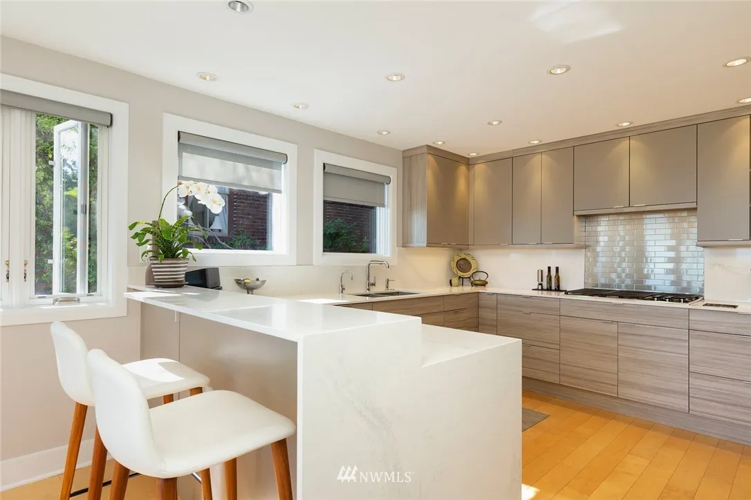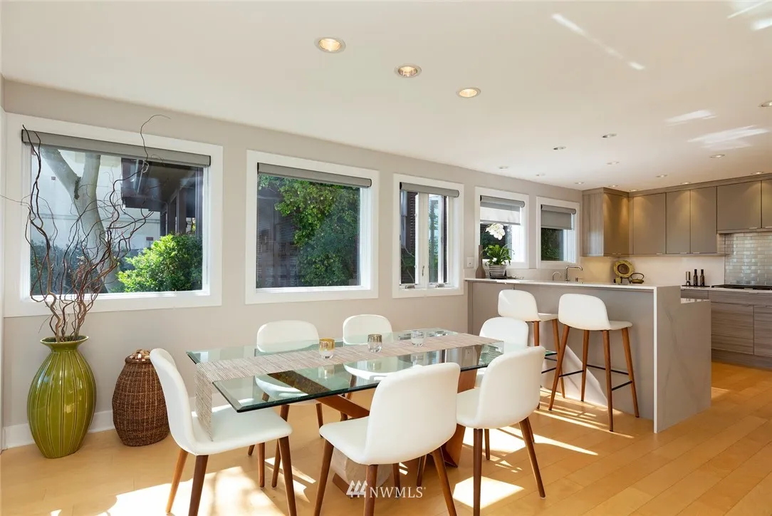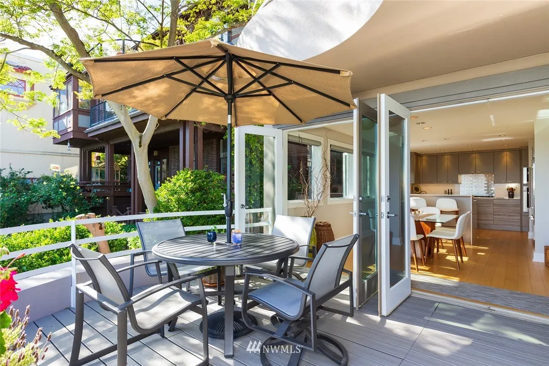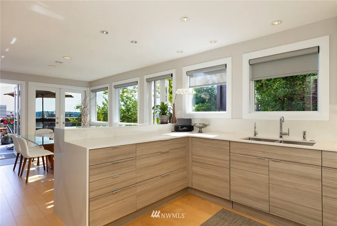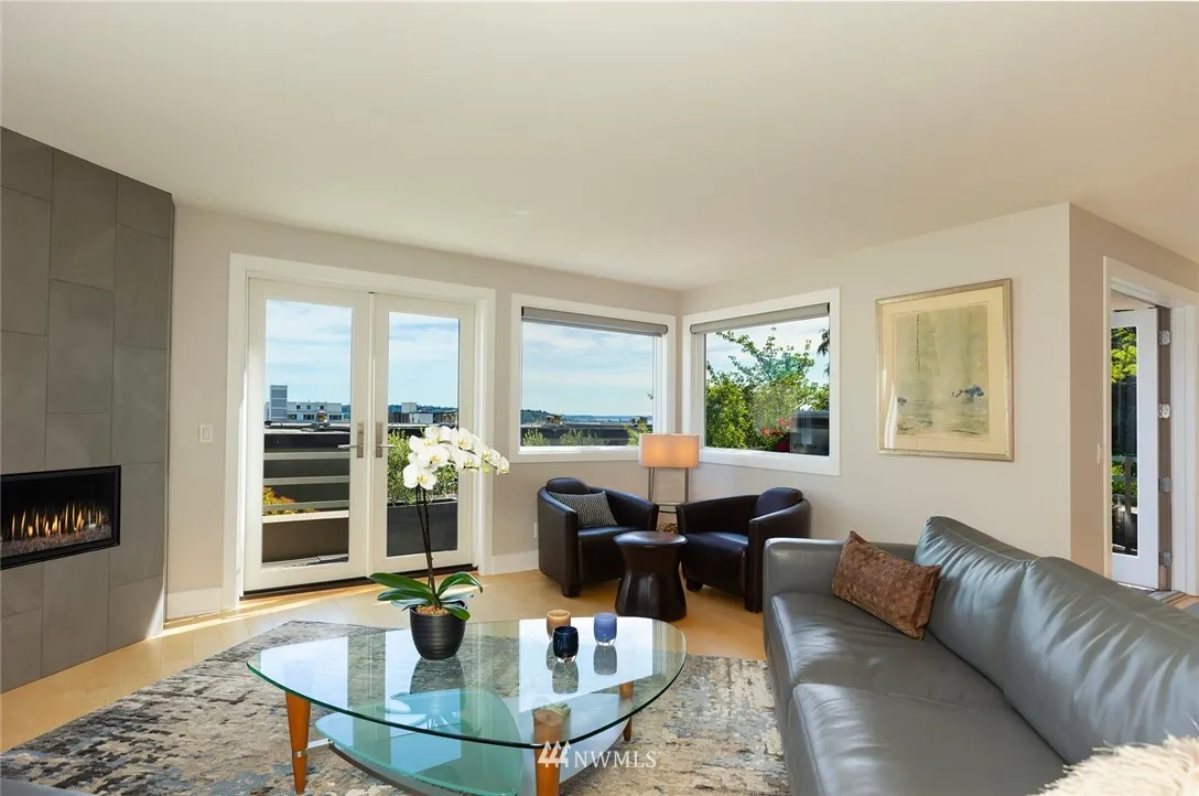 Beautifully designed Queen Anne south slope condo, full of natural light, quiet setting. Single-level open living plan with LR, DR & kit views of Elliott Bay, downtown, West Seattle & Puget Sound. 2 bedroom+ den, attached 110 sf storage room, 2 dedicated parking spaces in secure garage w/ additional storage. Large chef's kitchen features Miele, Wolf, & SubZero appliances. En suite master bath with large shower, separate tub, Robern slide-up mirrored cabinets, heated floor. Private elevator.