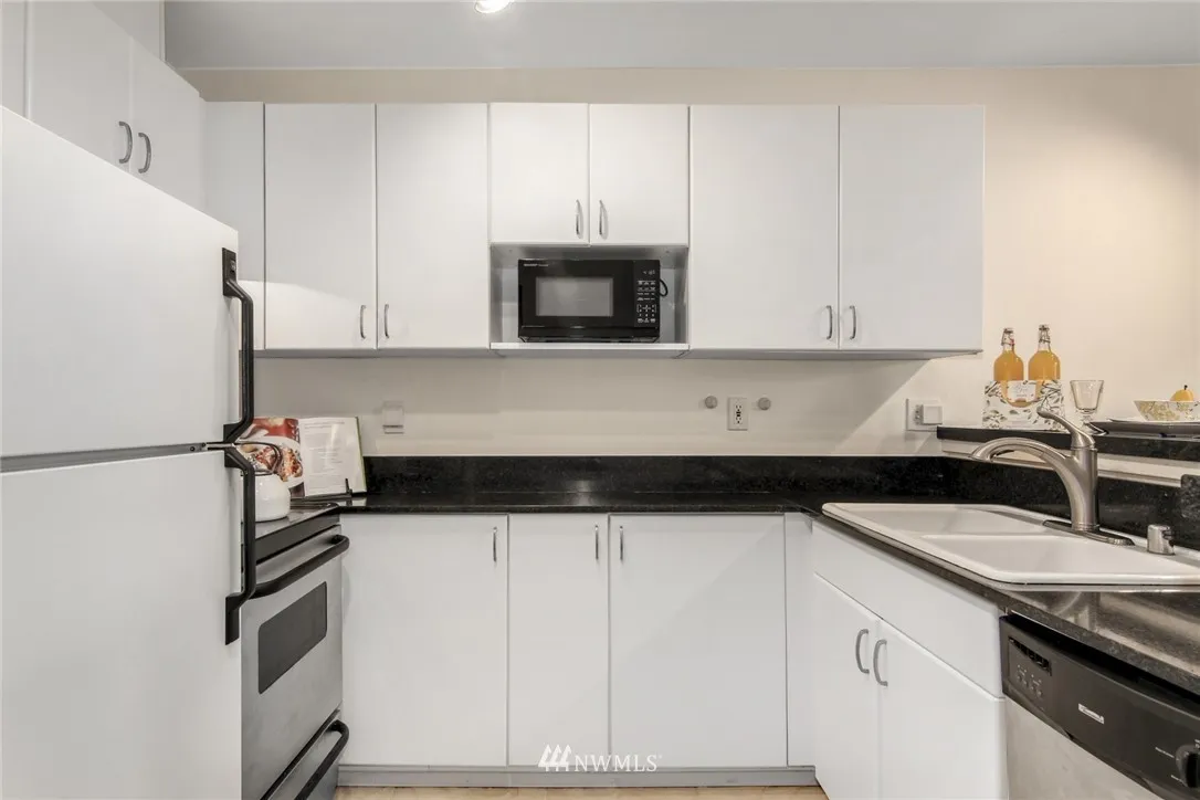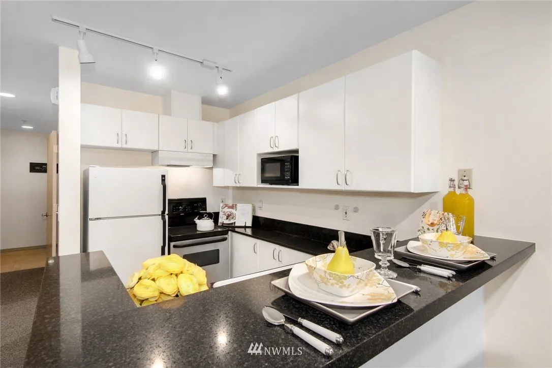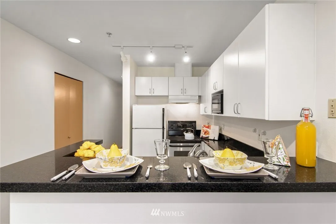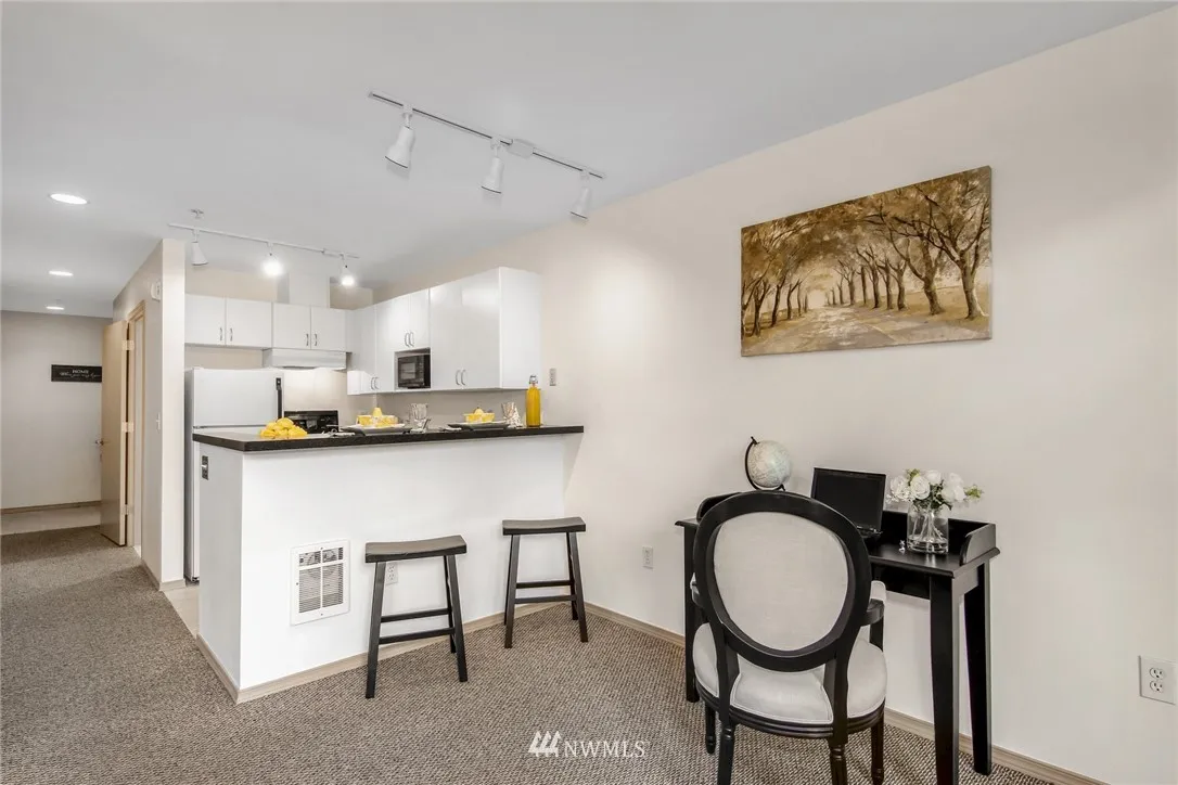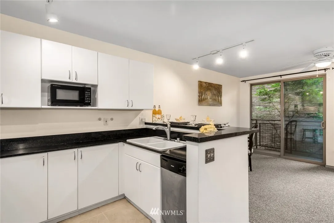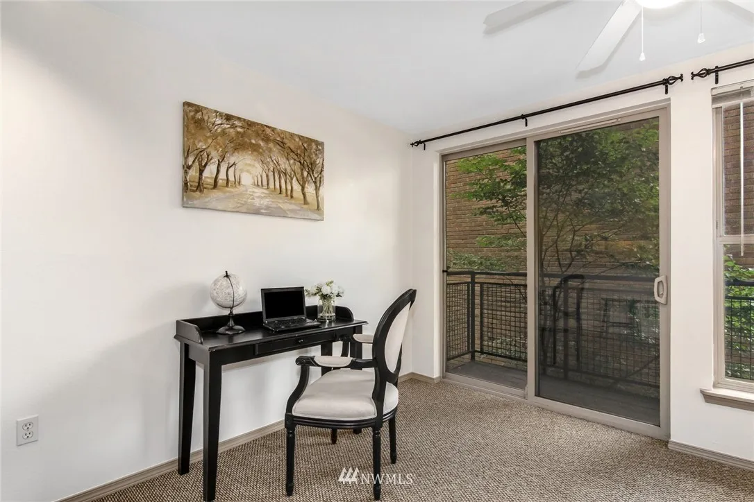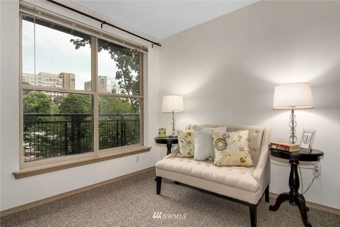 South facing immaculate First Hill studio features generous kitchen, spacious bath, entry separation from living space, 3 closets,blacony, ceiling fan, in-unit washer/dryer, garage parking space & plenty of lighting. Wide windows look out at tree canopy & city view. Dues include: high speed internet, fitness center, owner's loung, water/sewer/garbage, insurance, & professional management. Easy walk to downtown, Capitol Hill/Broadway, groceries, restaurants; around the corner from Virginia Mason.