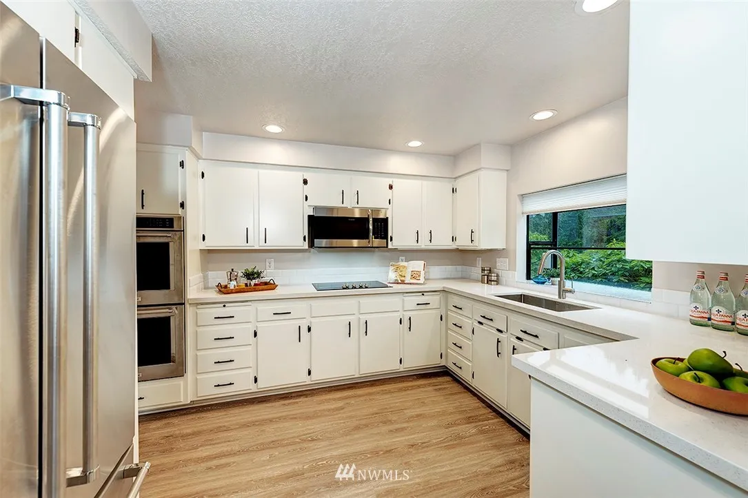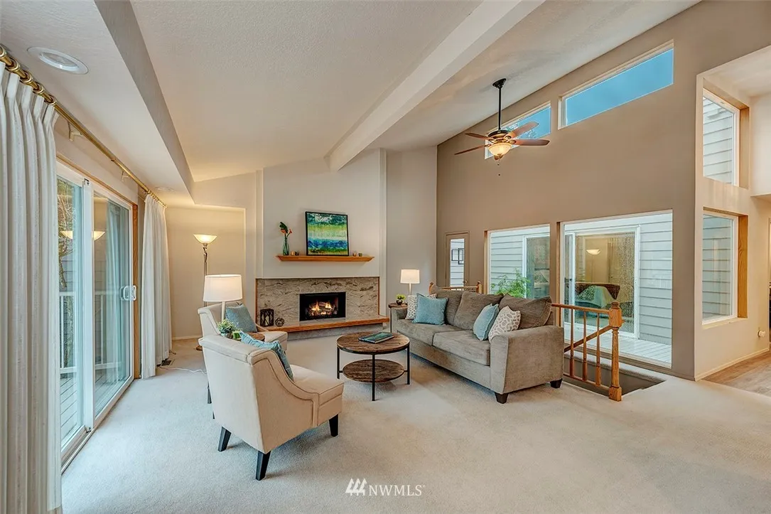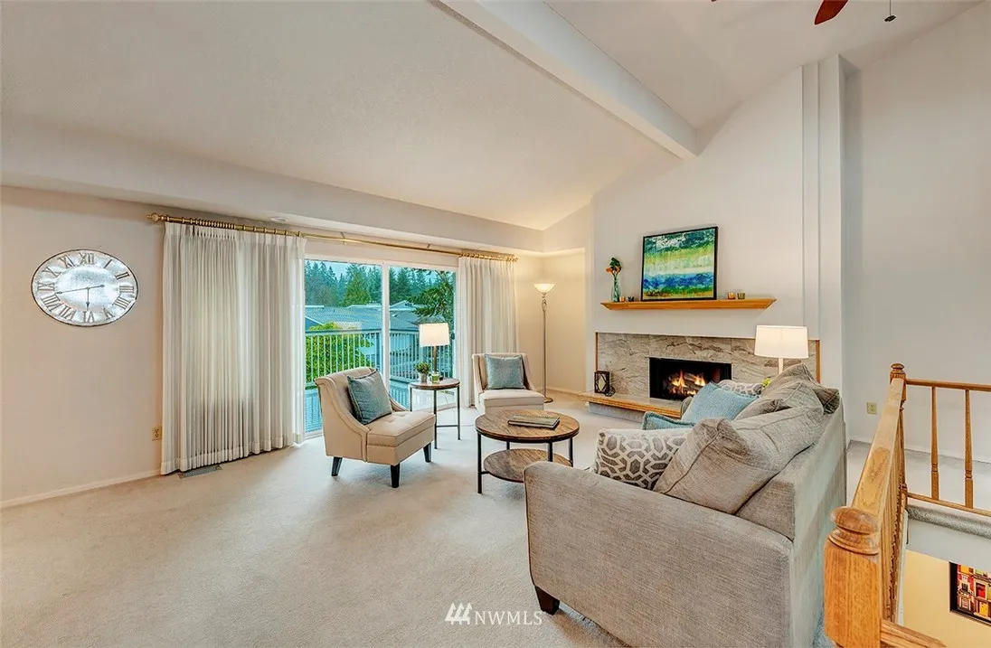 Beautiful Fairway Village condo w/remod kitchen-quartz counters, SS appliances, white cabs & new floors. Open flrplan w/vaulted ceilings, skylights & atrium. Spacious living w/fireplace. Dining extends to wide deck w/pleasant views. Master w/walk-in closet & bath w/double sinks + lrg shower. 2 add’l bdrms, full bath & laundry on main floor. Lwr level has huge family rm w/wet bar, fireplace, 3/4 bth, patio access & lots of possibilities. Roomy 2+ car garage w/storage. Newer windows+heat pump