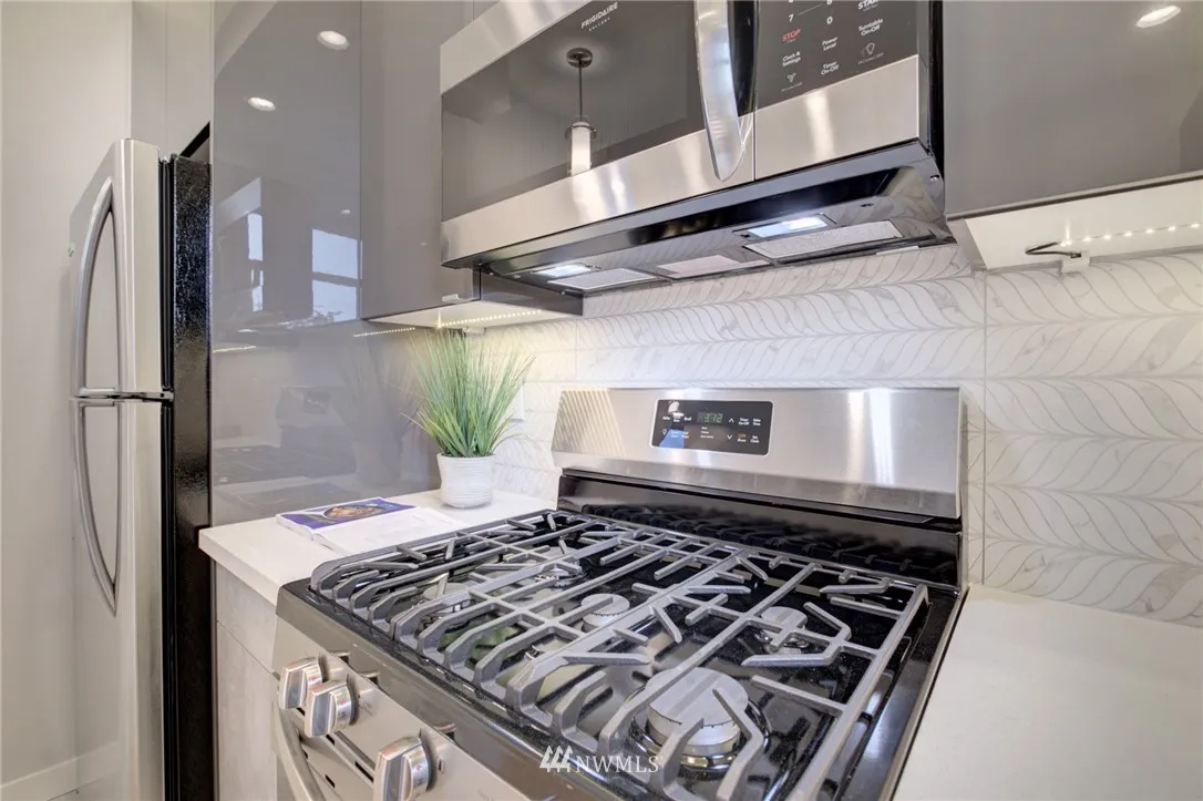 Sophisticated, light filled and it definitely has the cool factor. Two amazing entertainment view rooftop decks. Gorgeous master suite with king size bedroom, Minisplit, walk-in closet, double shower w/rain shower, heated floors & double vanity. Chef's kitchen w/gas stove and stainless appliances & rear door to off street parking. The entry level features tile floors, dining rm and kitchen. The second level has a family/tv room, bedroom and full bath. No home owner dues!