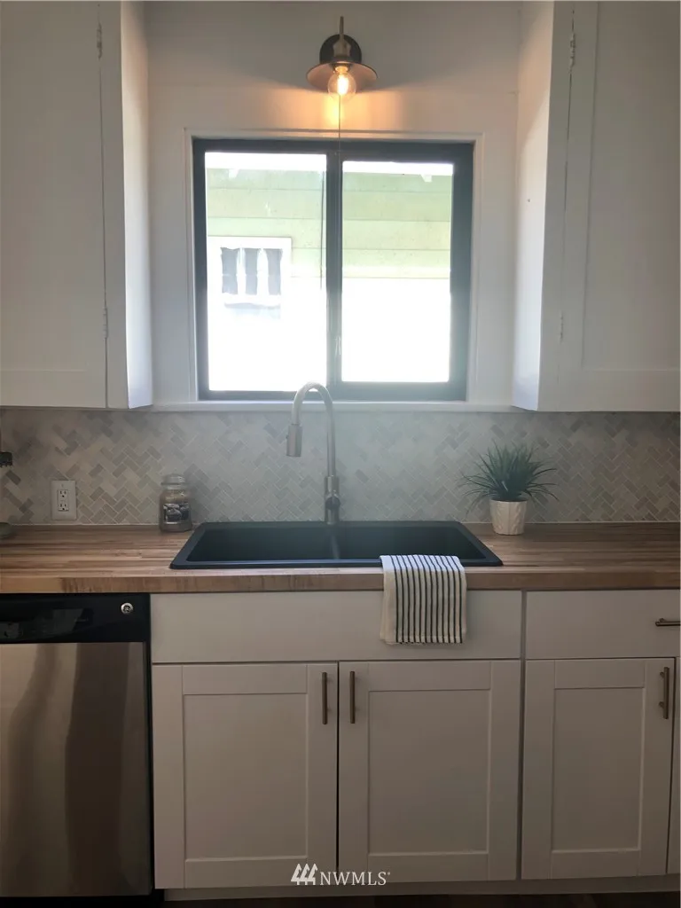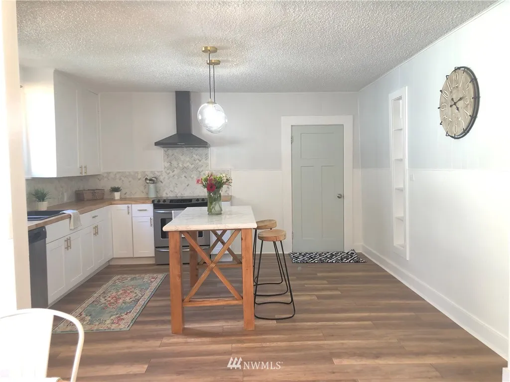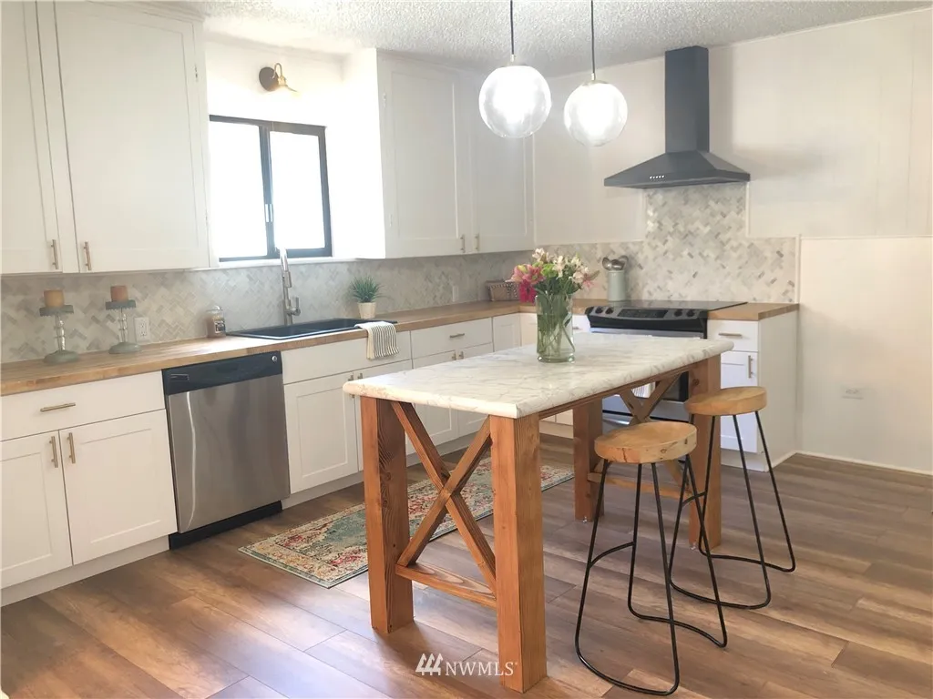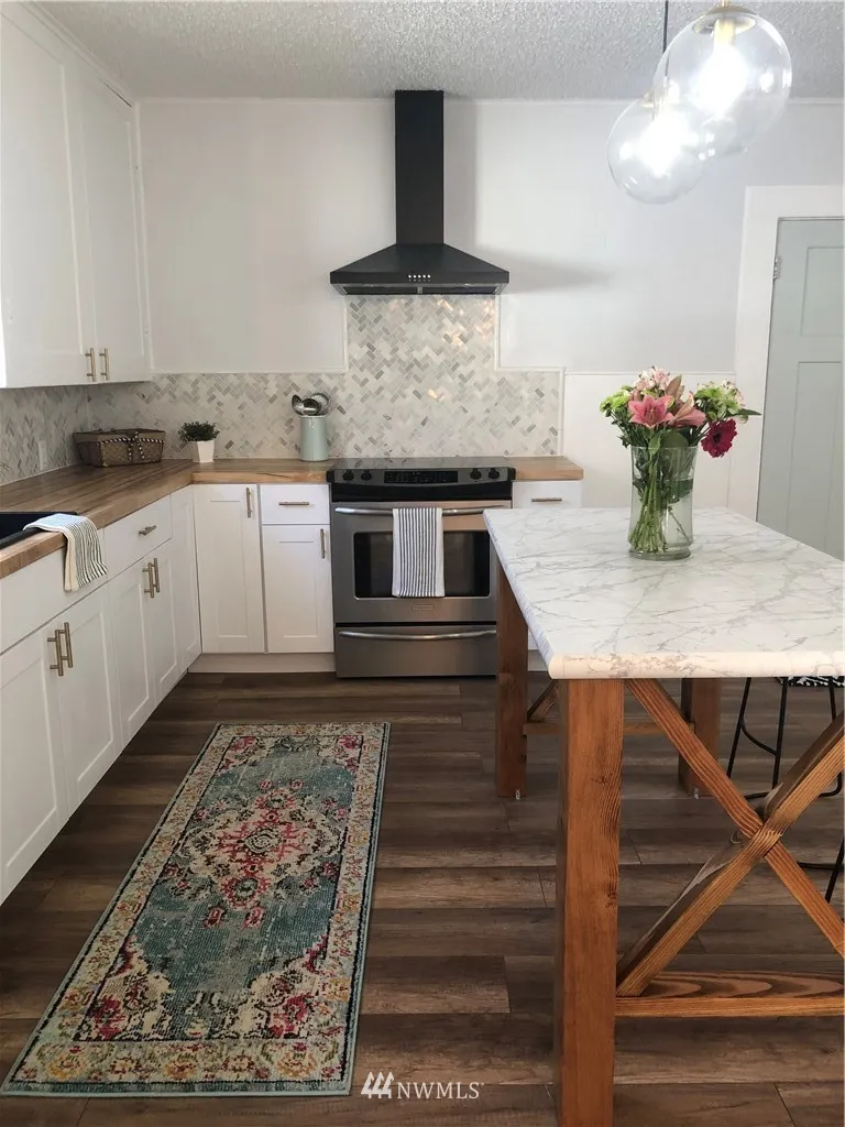 This immaculate kitchen is the highlight of the home! It offers real wood butcher block counter tops, new cabinets, a gorgeous handmade island, and to finish it off, a beautiful mosaic marble backslash. Now tell me that isn't everything you've ever wanted in a gourmet kitchen? In addition this home has a beautiful bright covered porch for those crisp mornings. A newly remodeled bathroom and a fresh coat of paint inside and out.