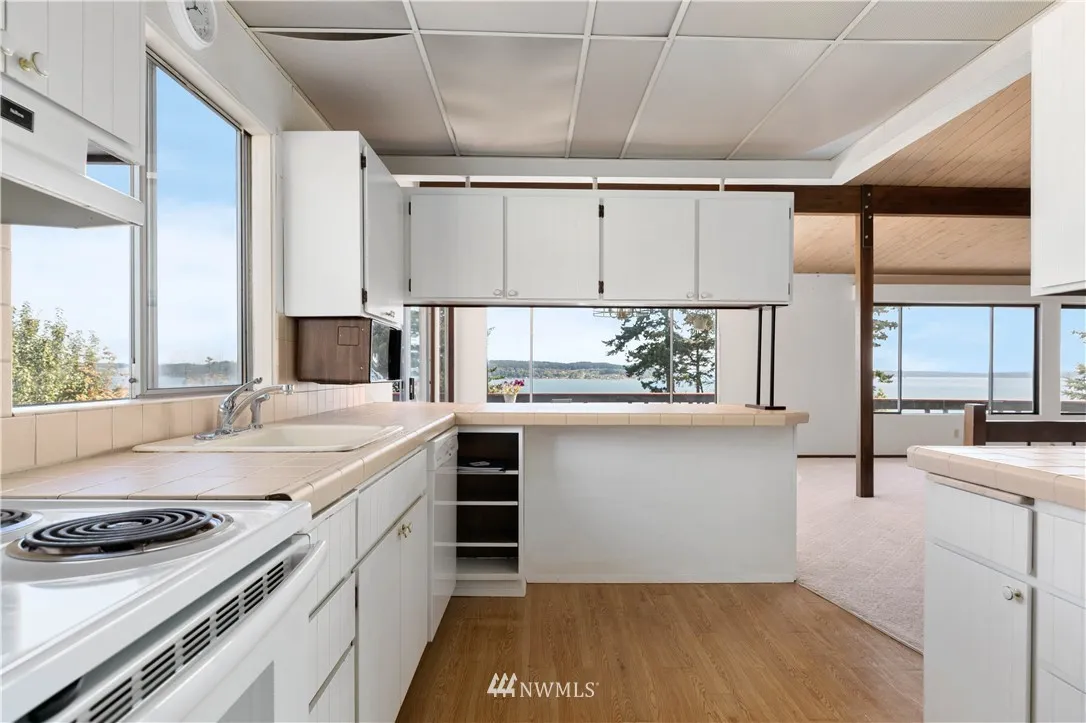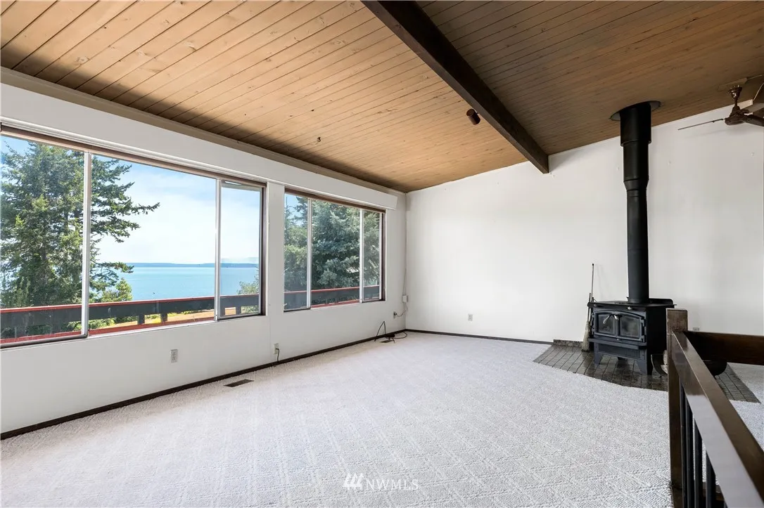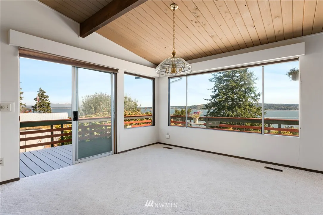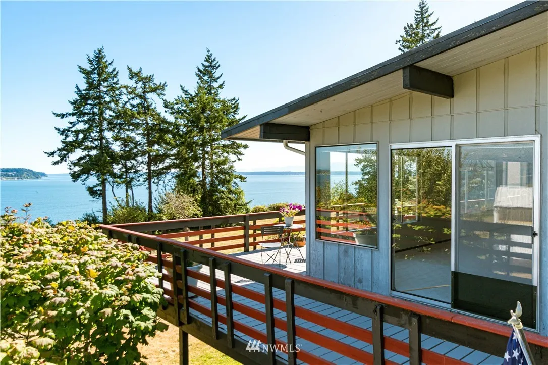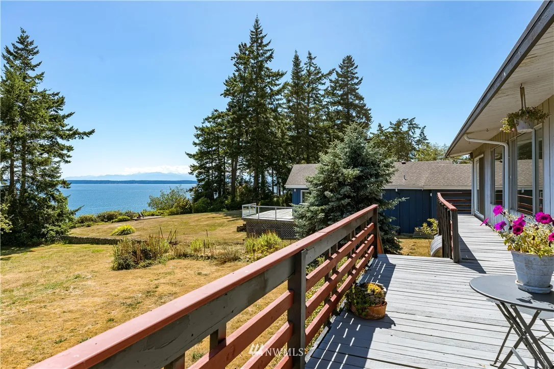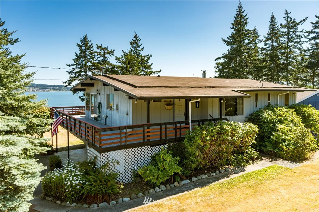 Opportunity knocks! Affordably priced high bank waterfront home with 2200+/- square feet of living space located in peaceful neighborhood. Enjoy the fabulous views from the great rooms wall of windows allowing plenty of natural light or hang out on the deck and watch the eagles soar overhead. Views of Saratoga Passage, Skagit Bay, Camano Island, Sunrises, the Cascades, and Sunsets over the Olympics. Home sits comfortably away from bluff with room for garden and outdoor games. So much potential.