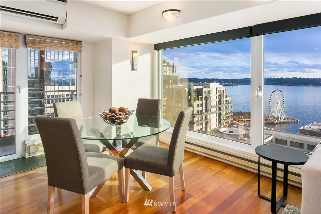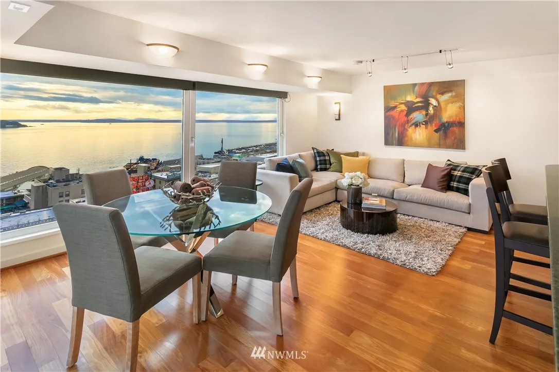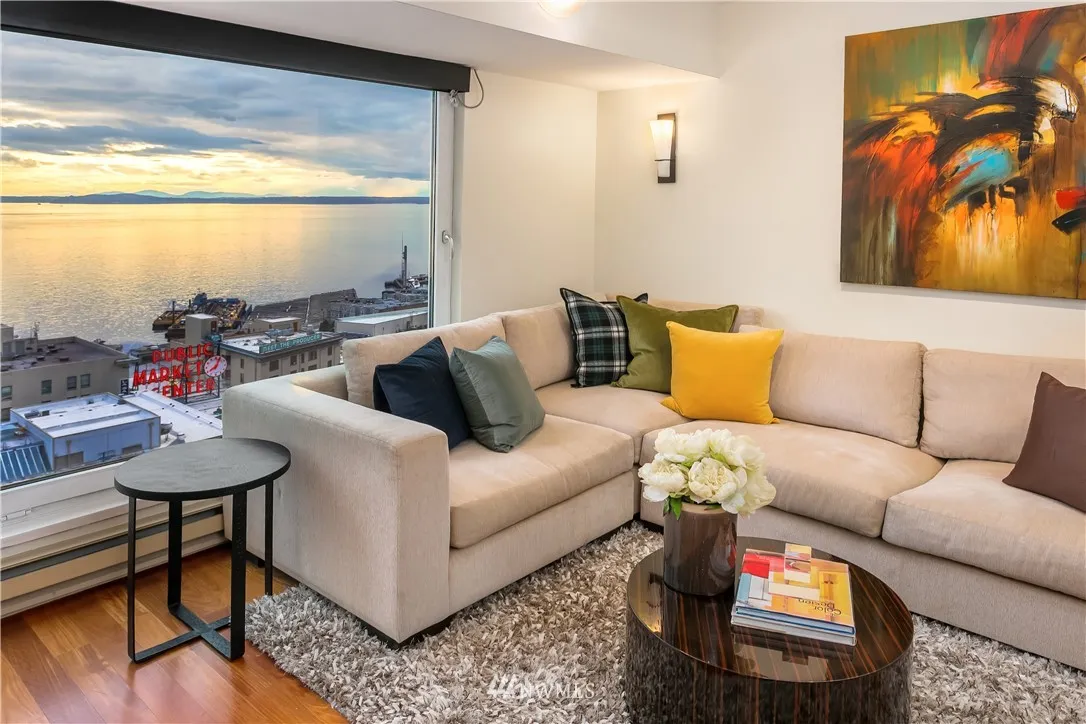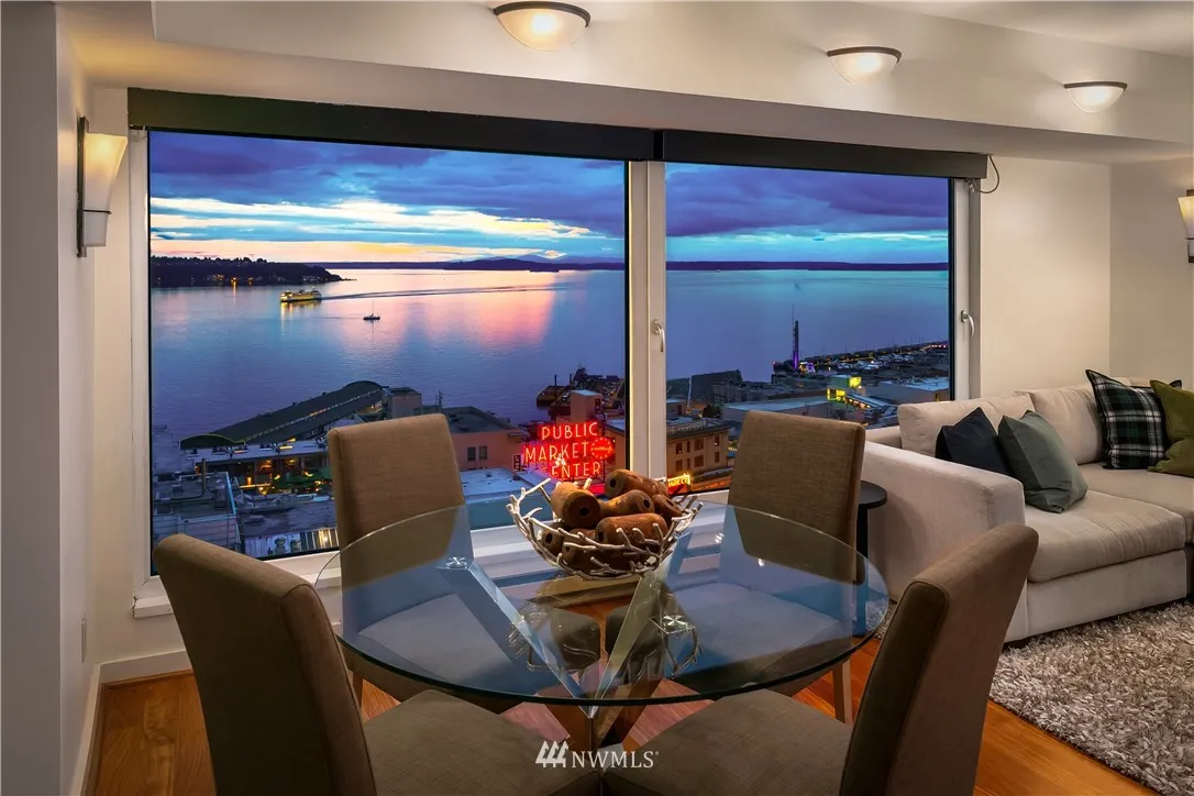 New Price adjustment! Stunning sunrise to sunsets from this lovely 2 bedroom, views of Elliott Bay, Pike Place Market, Olympic Mnts & dtwn. Just steps from Pike Place Market, it's your local neighborhood grocery store. Lge private terrace off guest/office & living rm. AC in this home! Restaurants, theater, SAM, Benaroya Hall, Mariners, Seahawks & light rail. Short term rentals- OK! 24hr concierge, gym, pool, jacuzzi, sauna, business & event room, rooftop lounge with BBQ's. Parking & storage.