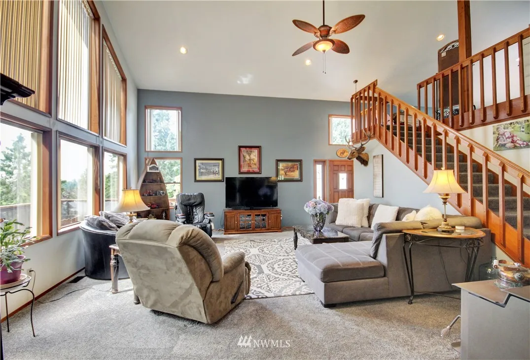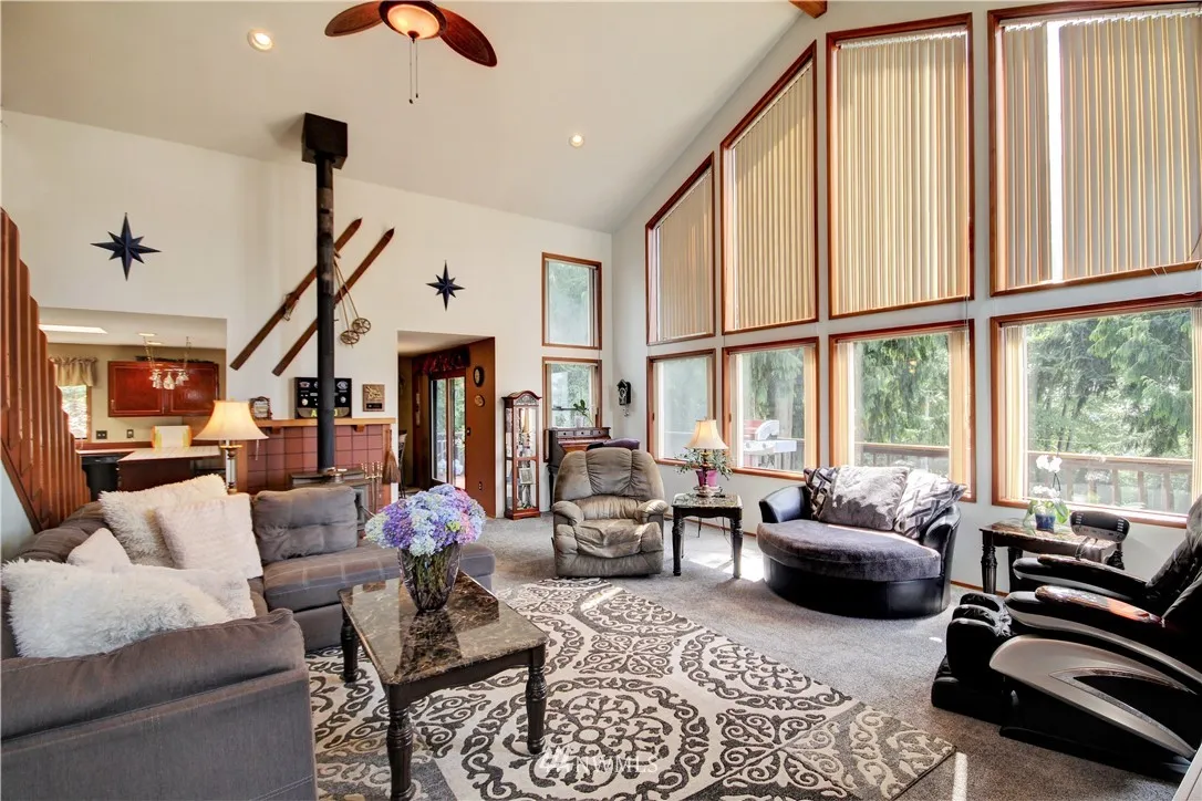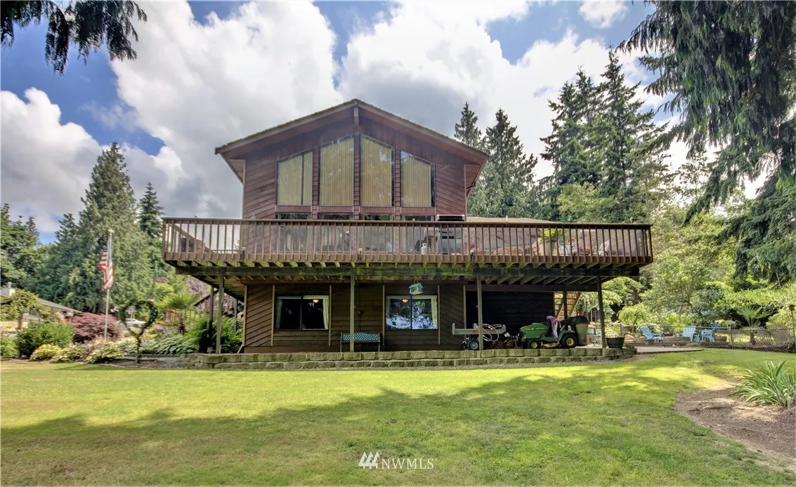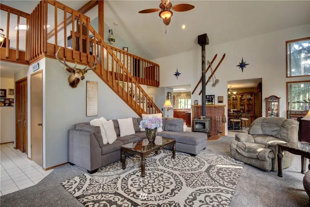 Spacious home full of natural light on a park-like corner lot! Grand living rm w/vaulted ceilings, 2-story windows & wood stove. Great spaces for entertaining (inside & out), plus a functional floorplan! Numerous skylights, kitchen w/dining rm, big family rm, Master loft w/walk-in closet & ensuite bath. You'll love the wraparound deck & brick patio w/built-in firepit! Beautifully landscaped grounds w/flowers, fruit trees & ample yard space. 2-car garage w/workspace & storage rm. Easy I-5 access!