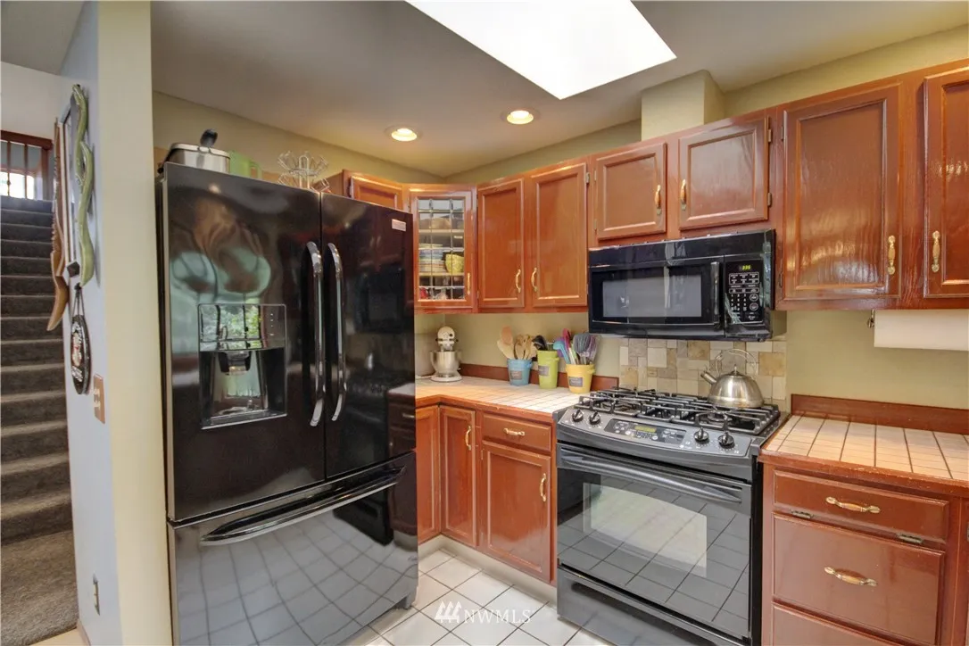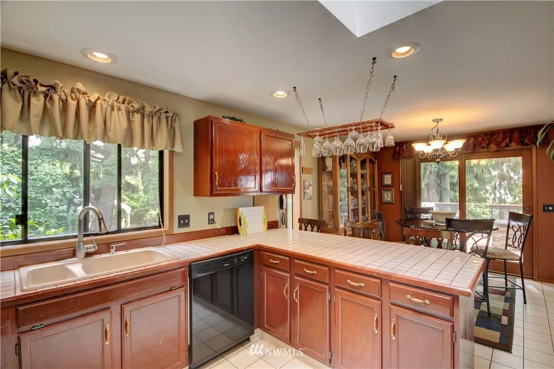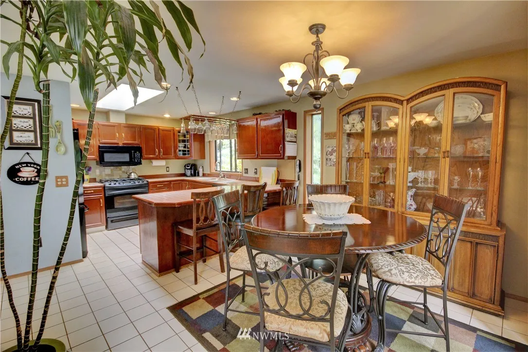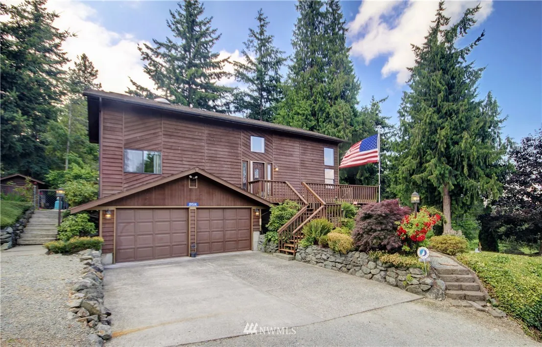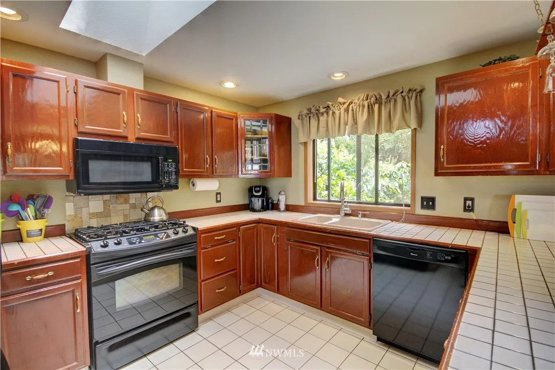 Spacious home full of natural light on a park-like corner lot! Grand living rm w/vaulted ceilings, 2-story windows & wood stove. Great spaces for entertaining (inside & out), plus a functional floorplan! Numerous skylights, kitchen w/dining rm, big family rm, Master loft w/walk-in closet & ensuite bath. You'll love the wraparound deck & brick patio w/built-in firepit! Beautifully landscaped grounds w/flowers, fruit trees & ample yard space. 2-car garage w/workspace & storage rm. Easy I-5 access!