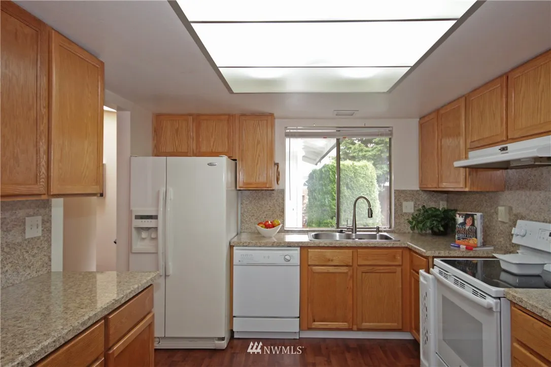Beautiful 55+ community! Updated rambler with large bedrooms,master suite w/remodeled bathroom and walk-in shower. Great light from skylights in entry and guest bath newer laminate floors throughout entry kitchen and dining room. Large kitchen lots of storage and slider to patio Oversized 2 car garage w/one door shelving and pantry space. Great community clubhouse pool, front yard mowing included in $115 HOA. Move in ready