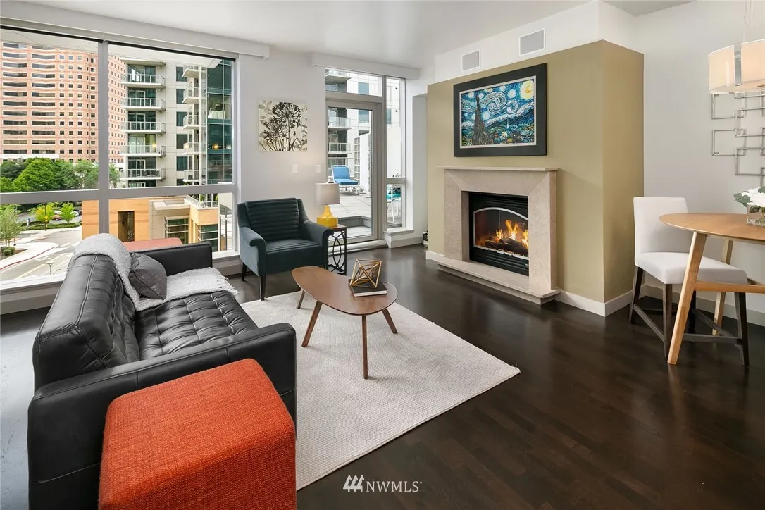 Stylish living in the heart of Downtown Bellevue! HIP. LIFESTYLE. Beautiful hardwood floors and high end touches throughout. Spacious 1 bedroom + den. Oversized patio for when you need your outdoor space! Spend lazy weekends w/ your coffee admiring the city views! Fireplace + A/C. Flawlessly maintained. Community amenities include secure garage parking, concierge, owners’ lounge, work out room, hot tub + sauna! Steps to shopping, dining, entertainment, parks + your new future office space!