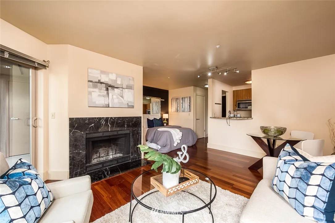 Cleverly designed, feature-rich studio in quiet space 2-blocks off Broadway and 3-blocks from Pike/Pine. They didn’t miss a thing designing this attractive unit: sleep alcove & spacious walk-in closet, entertainers LR/DR complete w/ wood fireplace & balcony, generous kitchen w/ eating bar & in-unit laundry w/ full-size W/D, & ample storage. With 98 walk, 94 transit, & 81 bike scores, you might choose the urban lifestyle & keep your secure parking space open for your guests! No rental cap.
