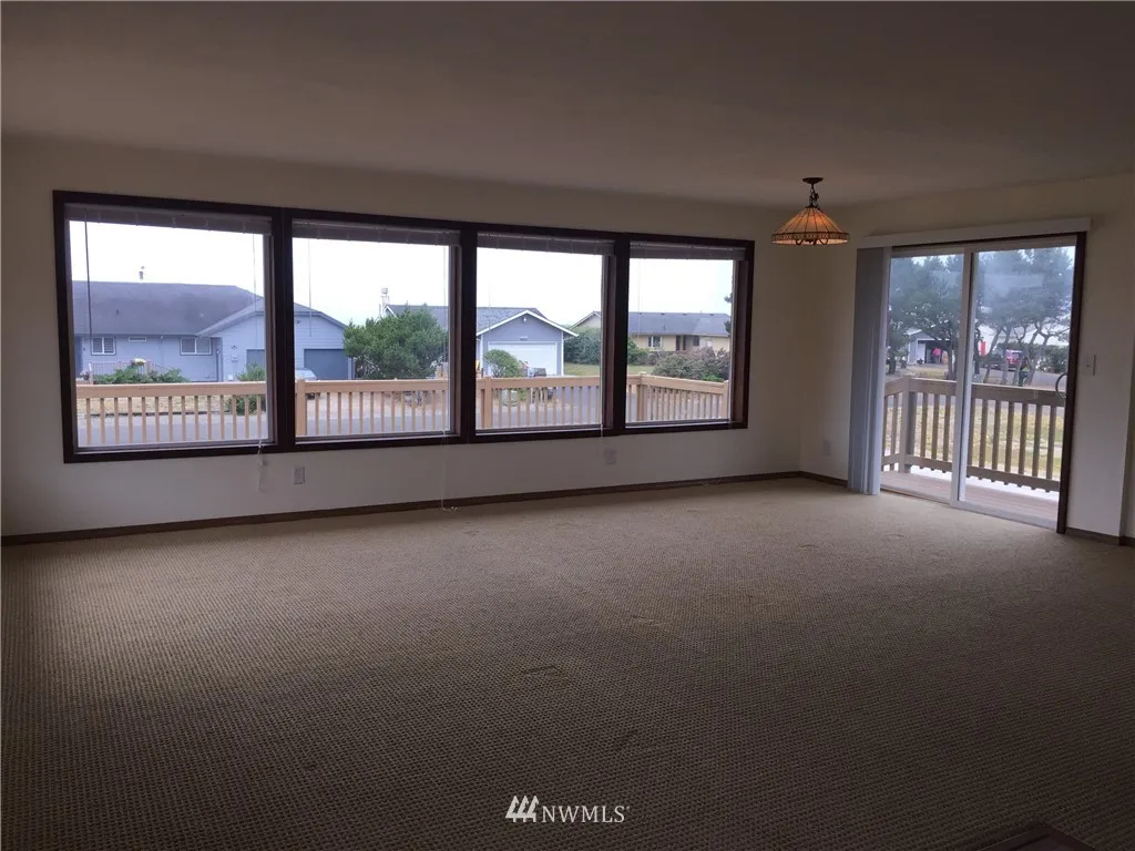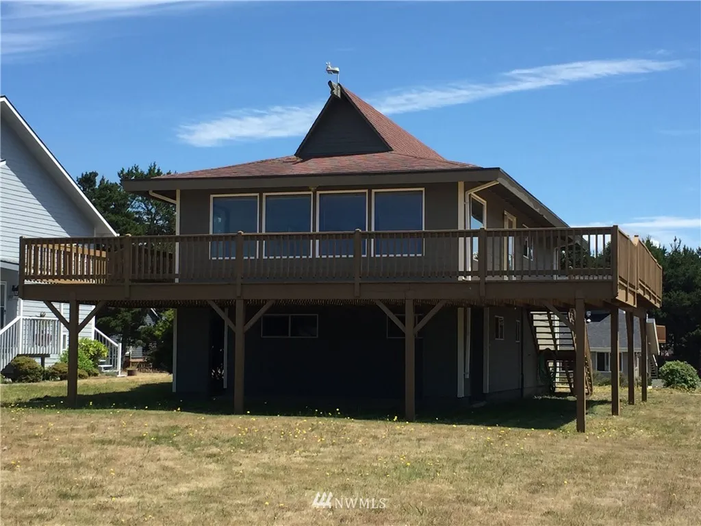 Great Tides West location with Pacific Ocean views. Large 60 x 150 corner lot with easy care yard. Main living area and master bedroom are on the upper level for lovely ocean and neighborhood views. Large entry deck, open great room concept with plenty of windows, lp gas stove for additional heat and ambiance. Kitchen with eating counter and pantry. Large master bedroom with en suite bathroom and jetted tub, large double closets. 2 guest bedrooms, office/den, guest bath and laundry downstairs.