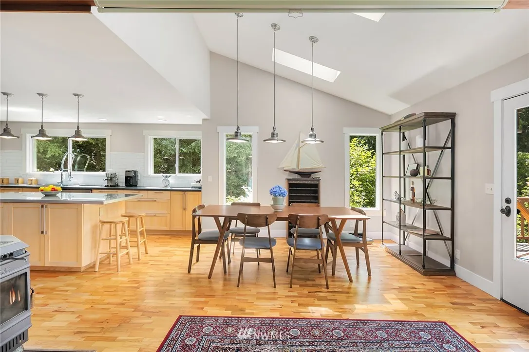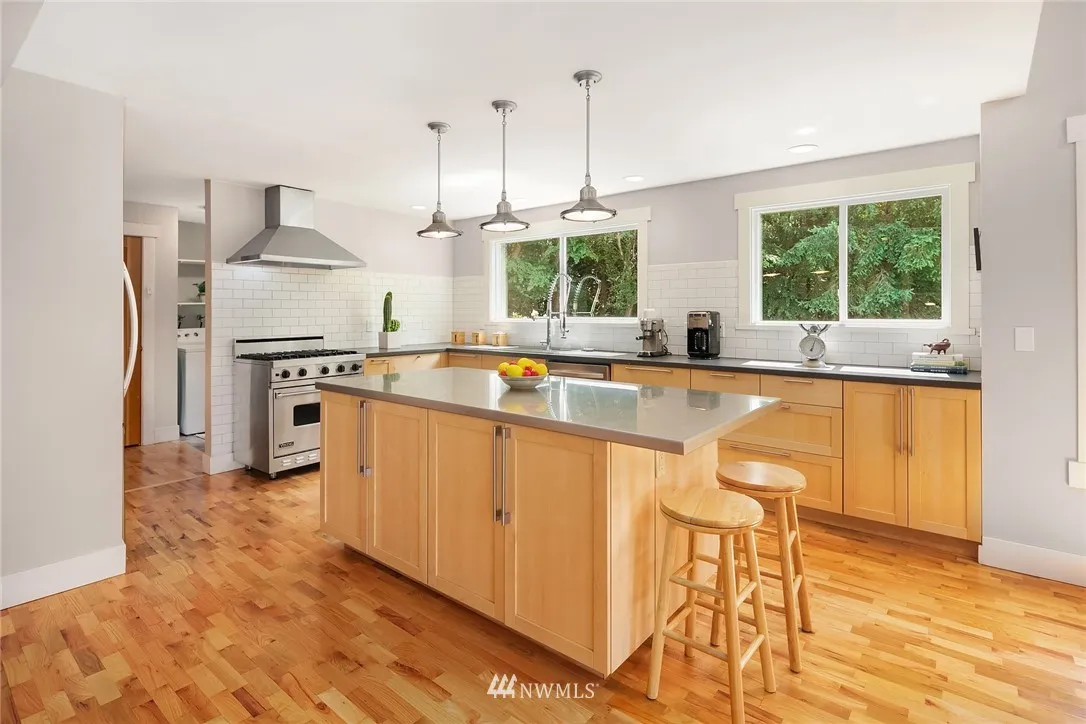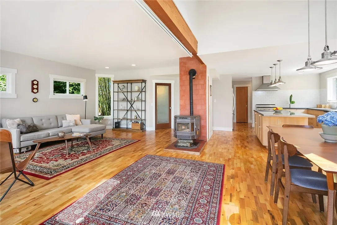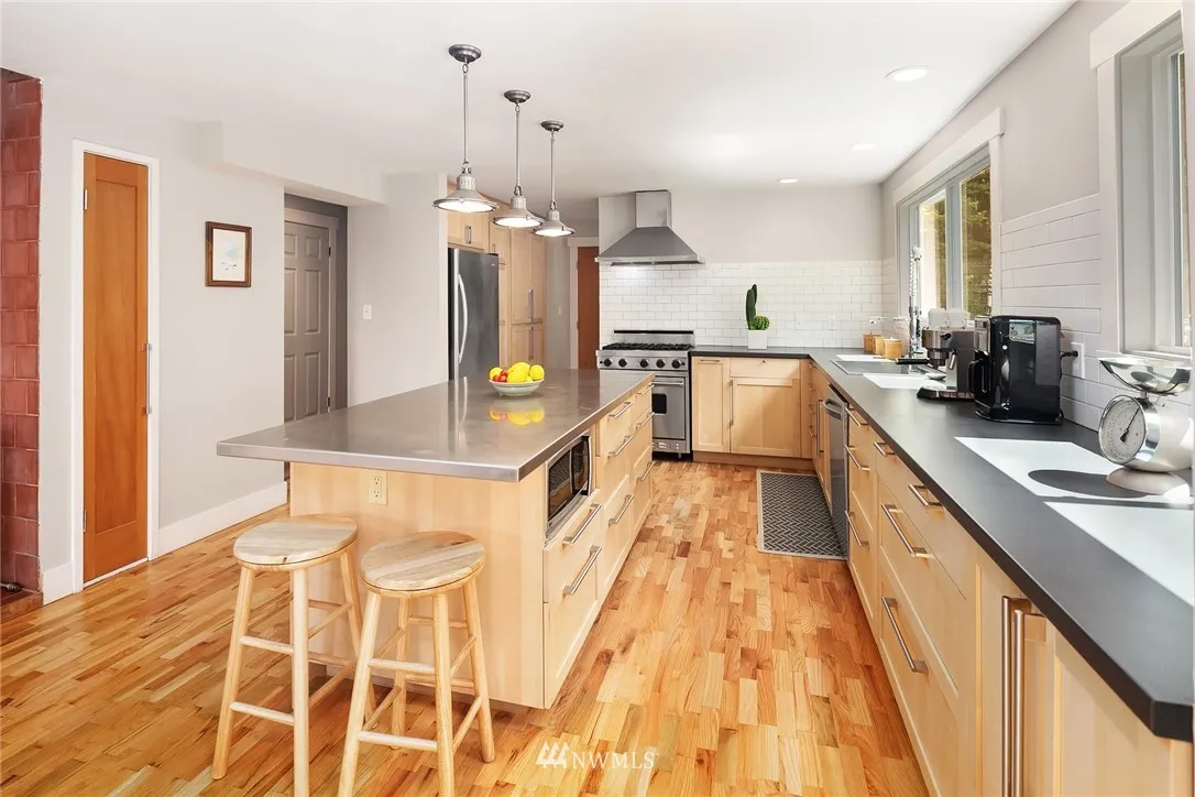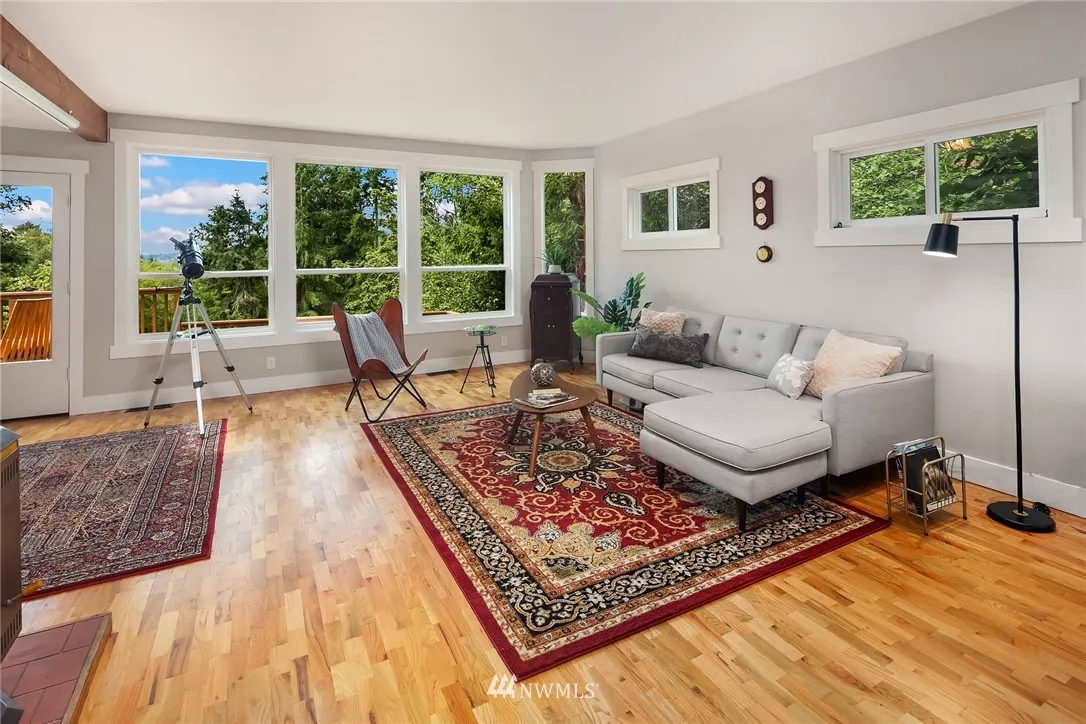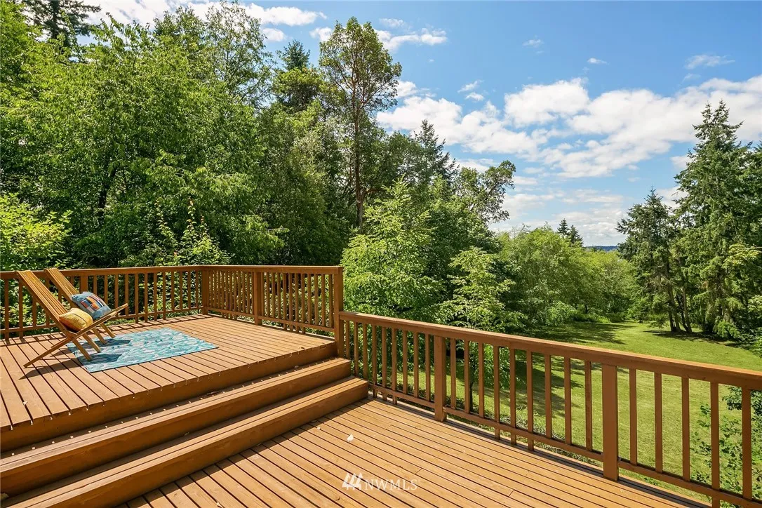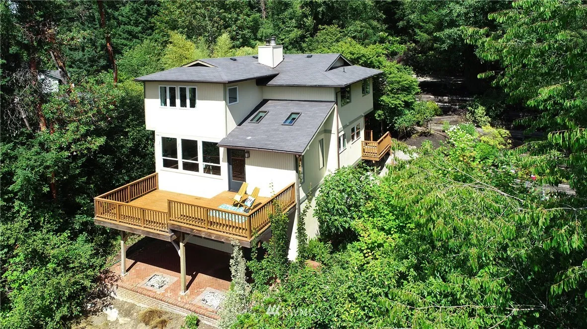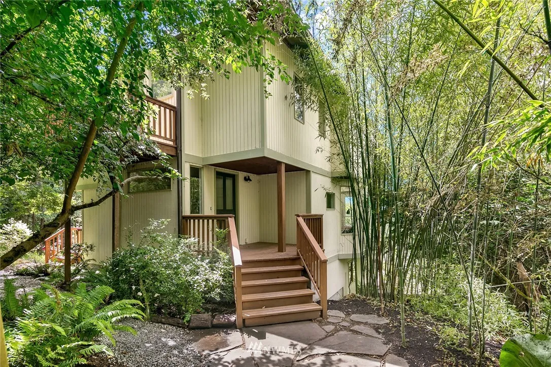Sophisticated NW contemporary on acreage perfect for commuting, gardening, entertaining, filled with light. Soaring windows in updated great room open to a lovely deck. Gourmet open kitchen is perfect for large or intimate dinners. Serene Master suite upstairs and 2 add'l bedrooms. Lower level family room, bedroom, 3/4 bath. Unfinished space for wine cellar. Artist studio/shop. Established artistic terraced landscaping, open field and sheltering woods. Open space preserves privacy.
