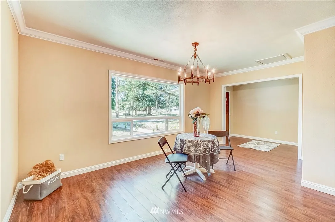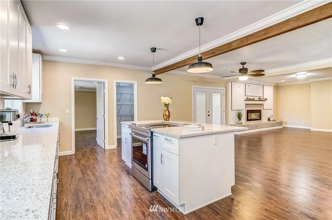 Renovated open style ranch house on 5 sub-dividable acres w/barn, staple, outbuildings, orchard, fenced pasture. 5 min. to I-5/Gt Wolf Lodge. Int: New kitchen, white cabinets, quartz counters & Island, Jenn-Air range, baths-surround shower-tub, laminate flrs, drywall/texture, crown molding, trim, doors, texture, paint. All new electrical/panel/rewired, new PEX plumbing, electric FP. Ext: Cedar clear coat siding, new roof 9-19, gutters, windows, furnace, well pump, attic insulation, septic tank.