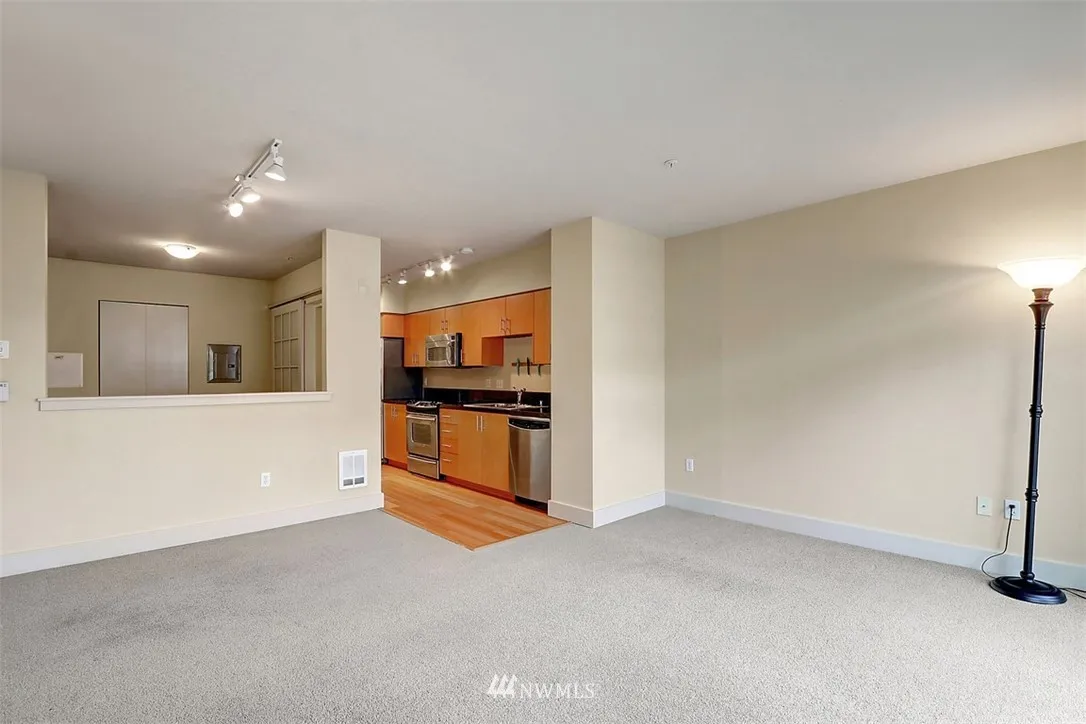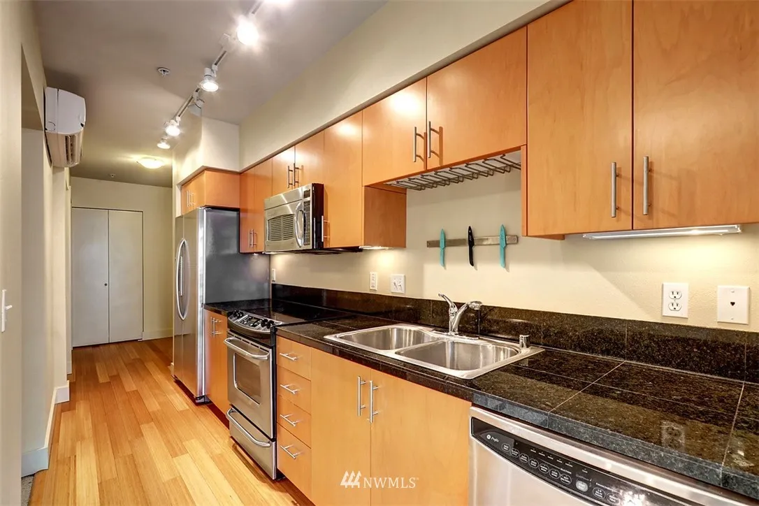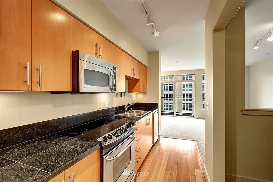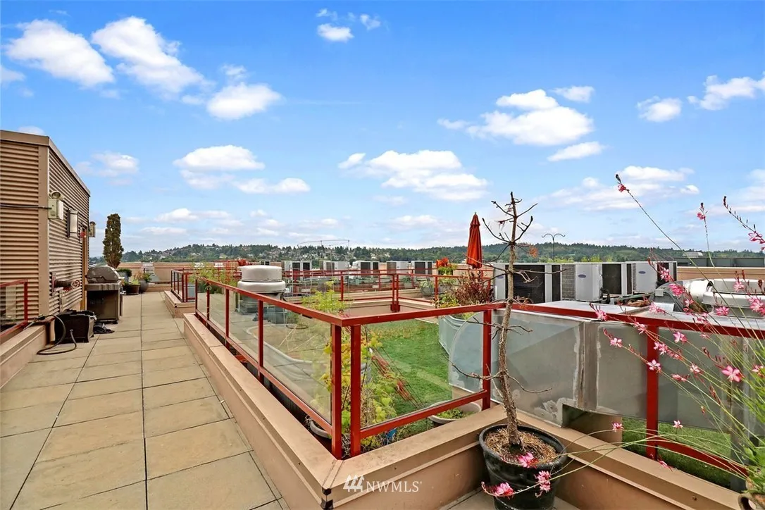 Highly desired Condo in the hub of Downtown Ballard! Experience territorial & Canal views from private deck. Central A/C. Kitchen features bamboo floors, stain/steel appliances, granite countertop, glass cooktop range. Lrg walkin closet. Bthrm in granite and both floor & shower custom tile. Assigned secure garage - parking spot+bike rack+storage unit. Amenities include lounge, fitness center, rooftop deck wth planters. Close to downtown, shopping, dining, music and night life. Walk score of 96!