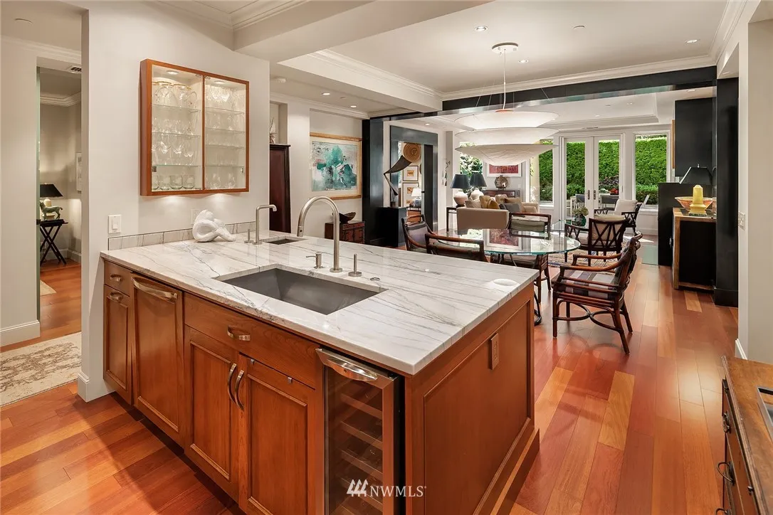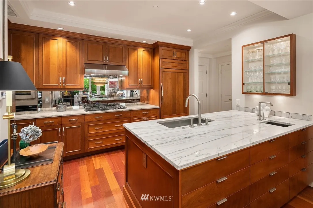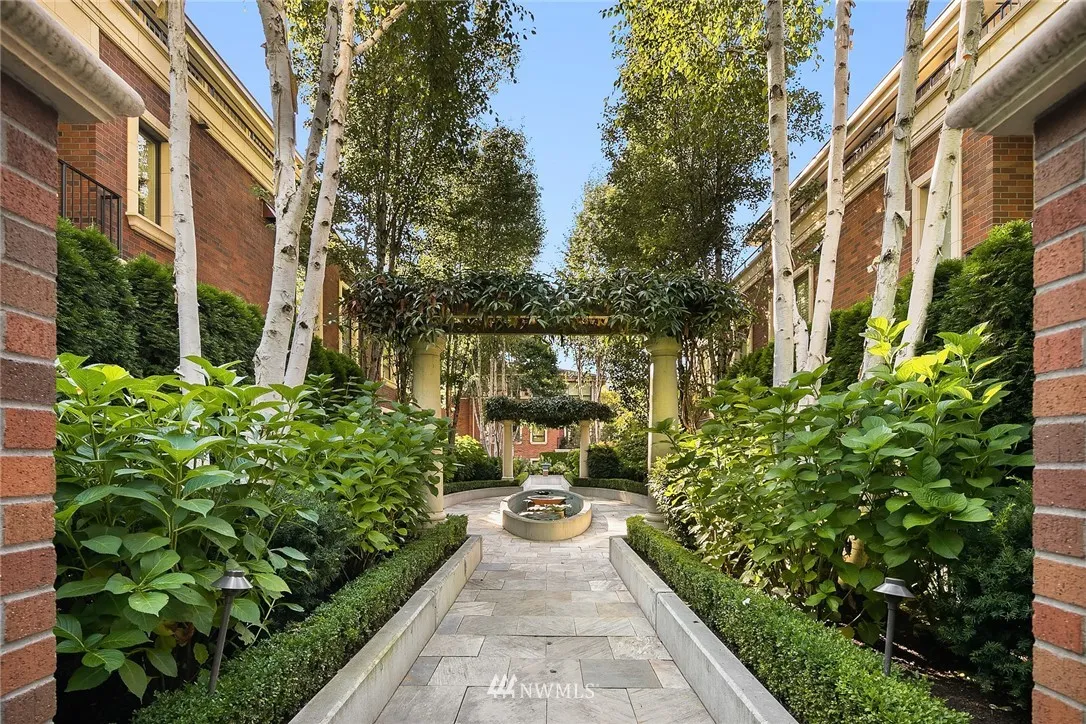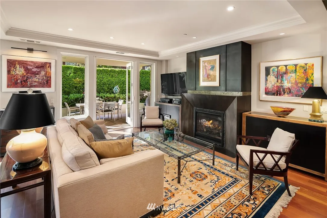Elegant West Facing garden level open floor plan with 2 beds + den & large private patio. Exquisite designer renovations: Art lighting, cold rolled steel accents & fireplace, built-in book shelves & custom glass doors are a perfect backdrop for art & entertaining. Luxurious master w/2 walk-in closets. A/C, Gourmet chef’s kitchen w/Quartzite counters, Ann Sacks tile, Wolf, Sub Zero, & Asko appls. Gym a floor away. 2 secure garage spaces & large storage room.