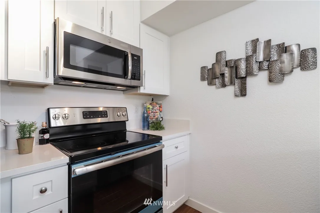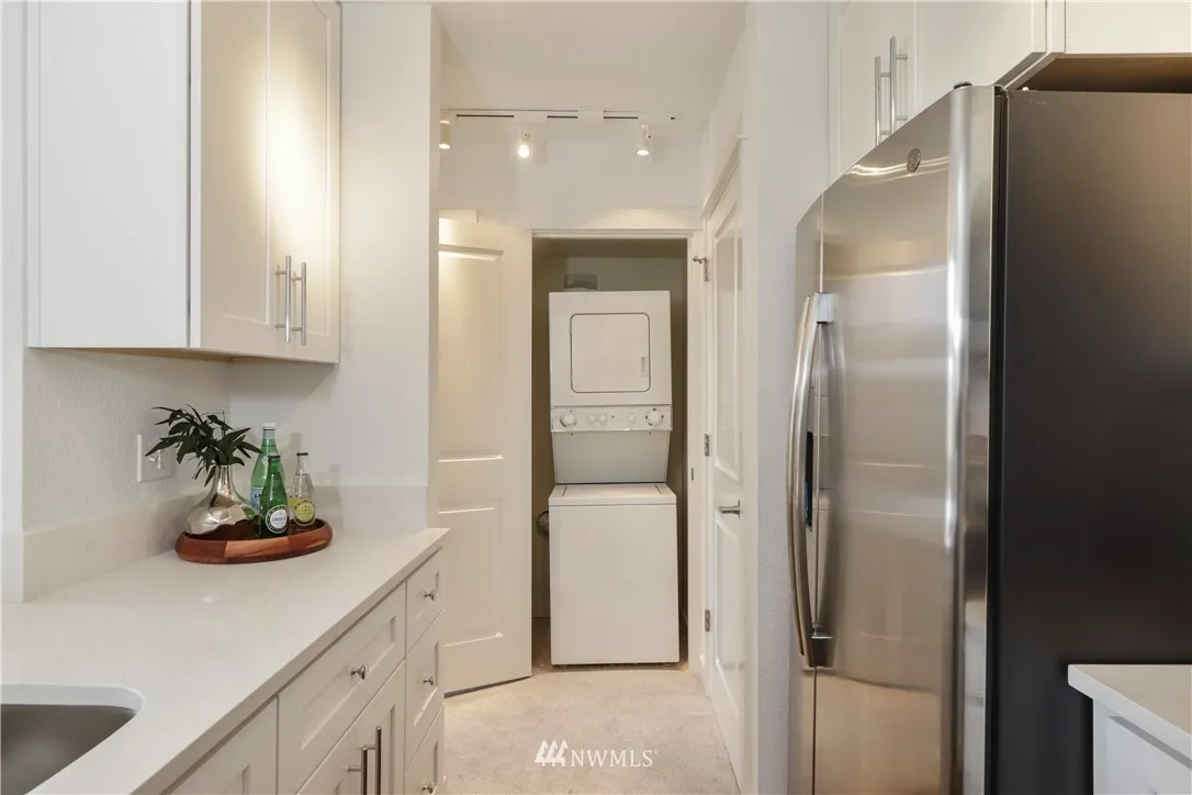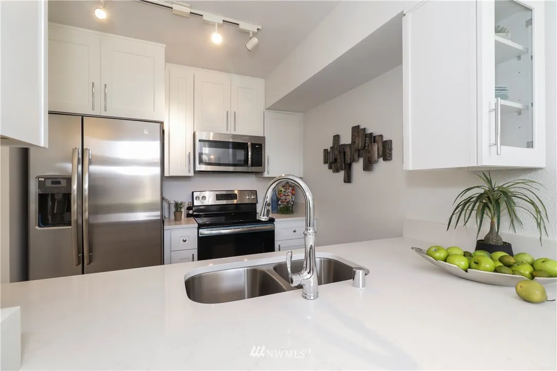 Wall of windows & soaring ceiling offers spacious 2 story floor plan at Magnuson Pointe. Entire unit completely upgraded by $50,000. New kitchen appliances, counter tops, cabinets, light fixtures & 50 gal. hot water tank. New carpet, hardwood & tile flooring. Upgraded bathroom vanity, toilet & bath surround. Stack Washer/Dryer! Entire unit painted & move-in ready. Walking distance to Magnuson Park, Lake Washington & Burke Gilman Trail. No rental cap, pet friendly & low HOA fees. Close to UW!