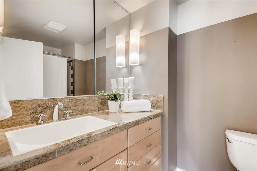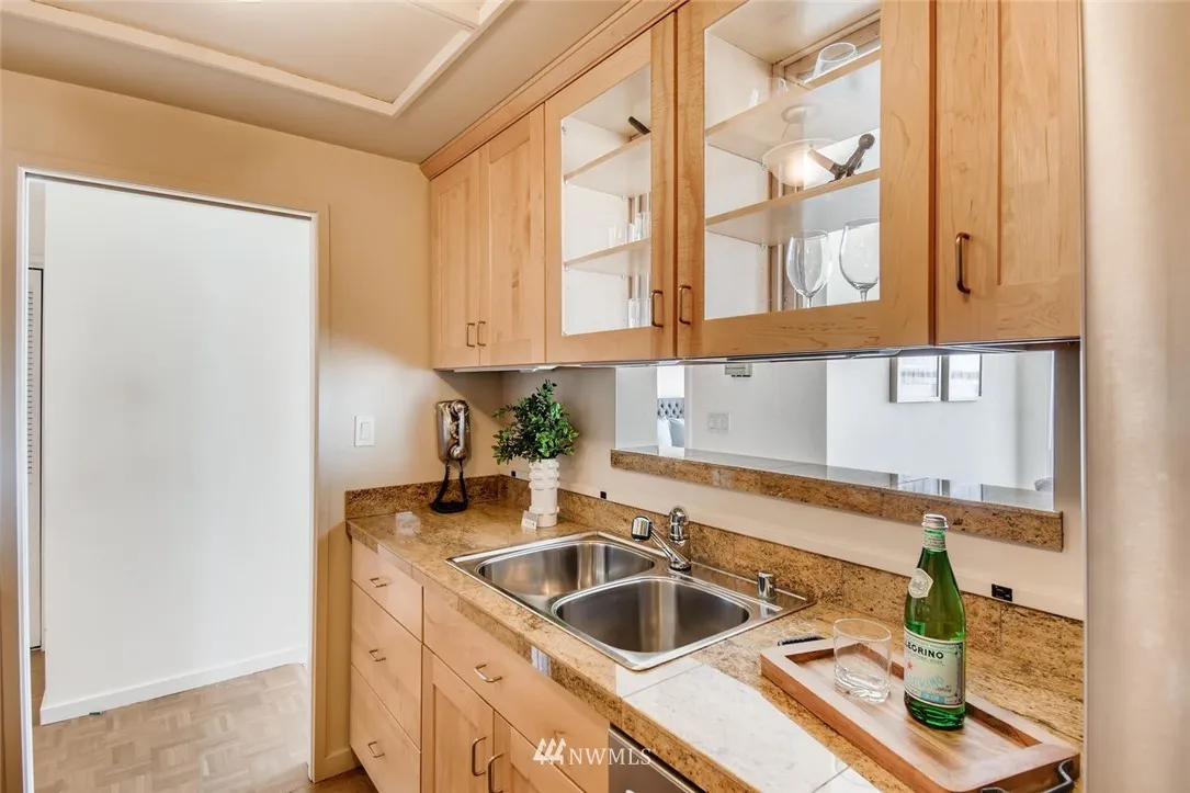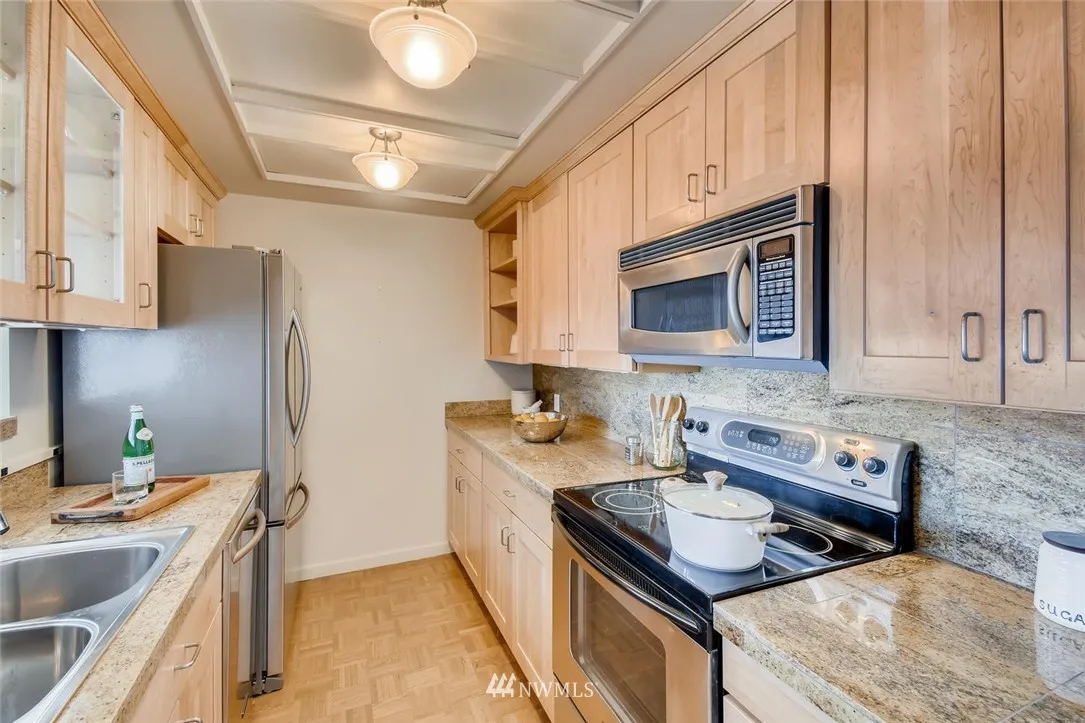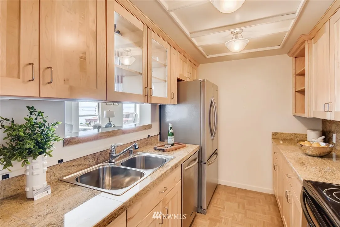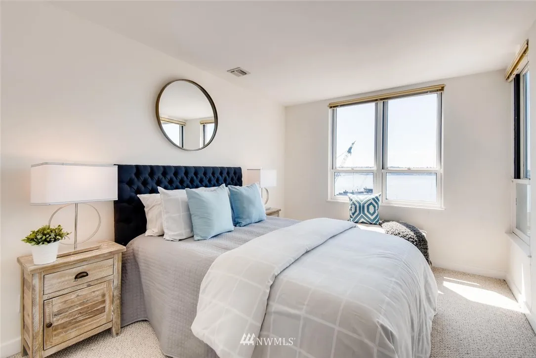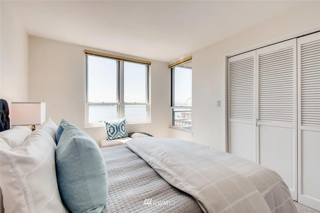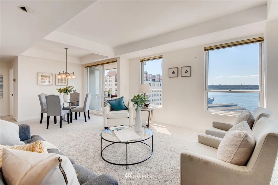 Choice Downtown Location! Classic contemporary bldg, western exposure, end unit with Elliot Bay/Puget Sound,city views. This 1bed,1ba home offers 712 sq ft of natural light filled living space, dining room, updated galley style kitchen,stainless steel appliances & granite tile countertops. Parquet hardwood floor in entry/kitchen, lge bathroom, laundry in unit, private balcony, prkg, storage, strong HOA,18 mo ownership req'd to rent.Fitness Rm, Resident Lounge, 6th floor terrace plus rooftop deck