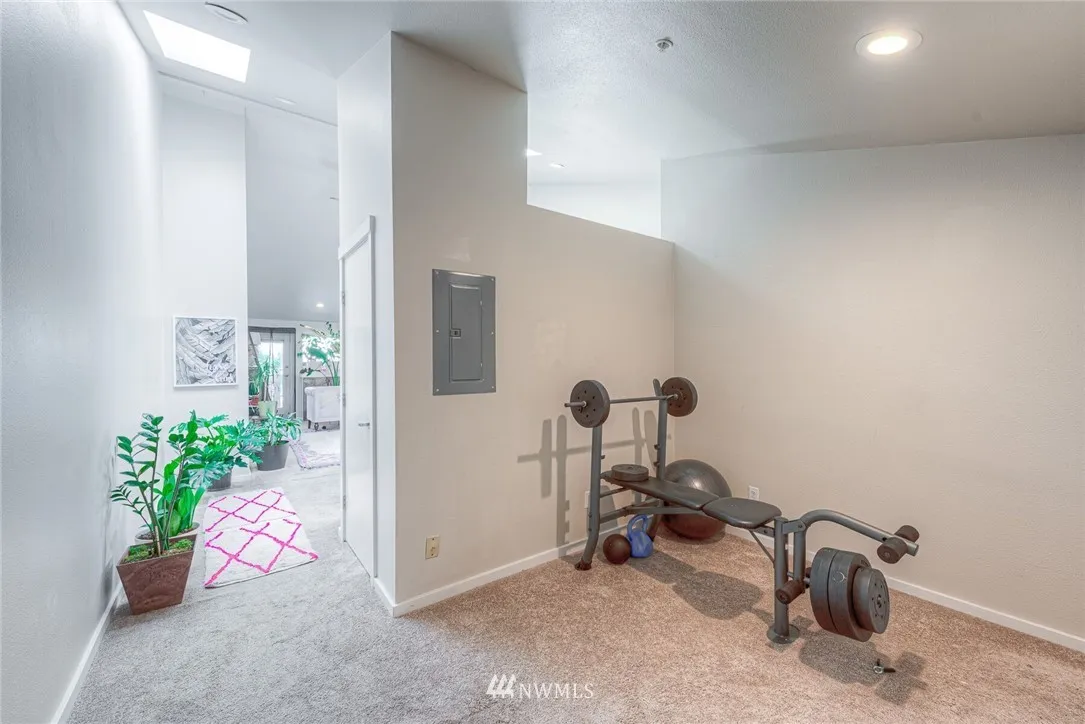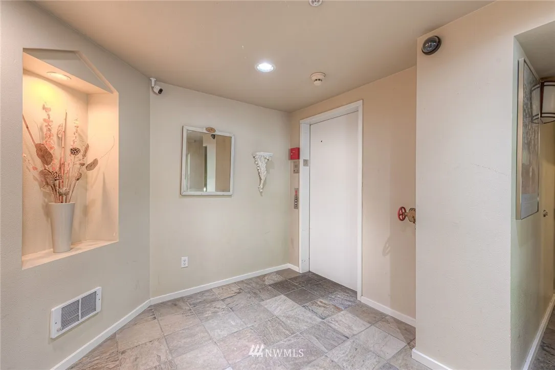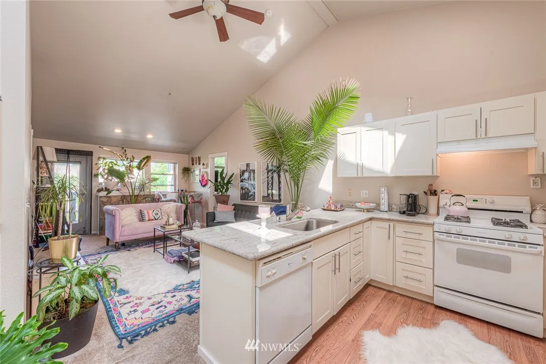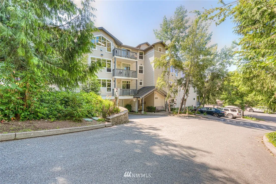 Light & bright 3rd floor one level condo. Open floor plan, large entry, U-shaped kitchen that flows to living/dining area. Gas log fireplace,access to west facing deck. Bedrooms on either side of the living room, each w/their own bath. Stack washer, dryer in unit. Parking in common garage w/storage. Public transportation at end of block, close to North Seattle Comm. College and future light rail. Gas is included in the HOA dues.