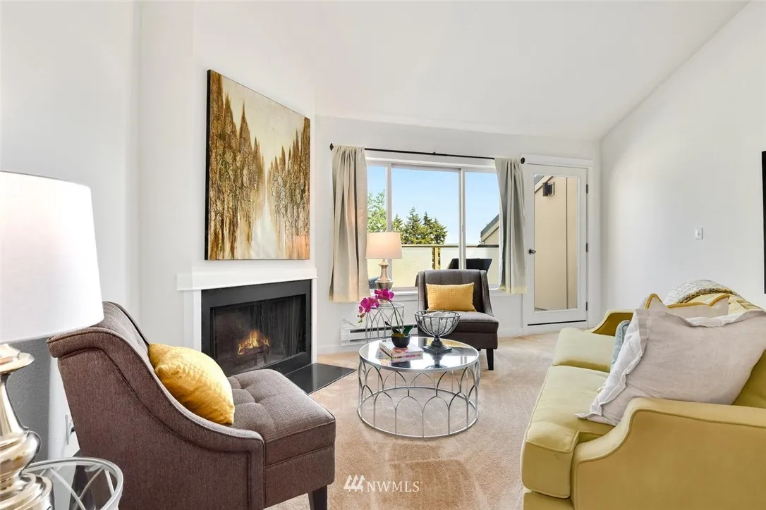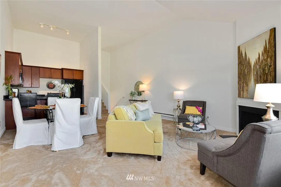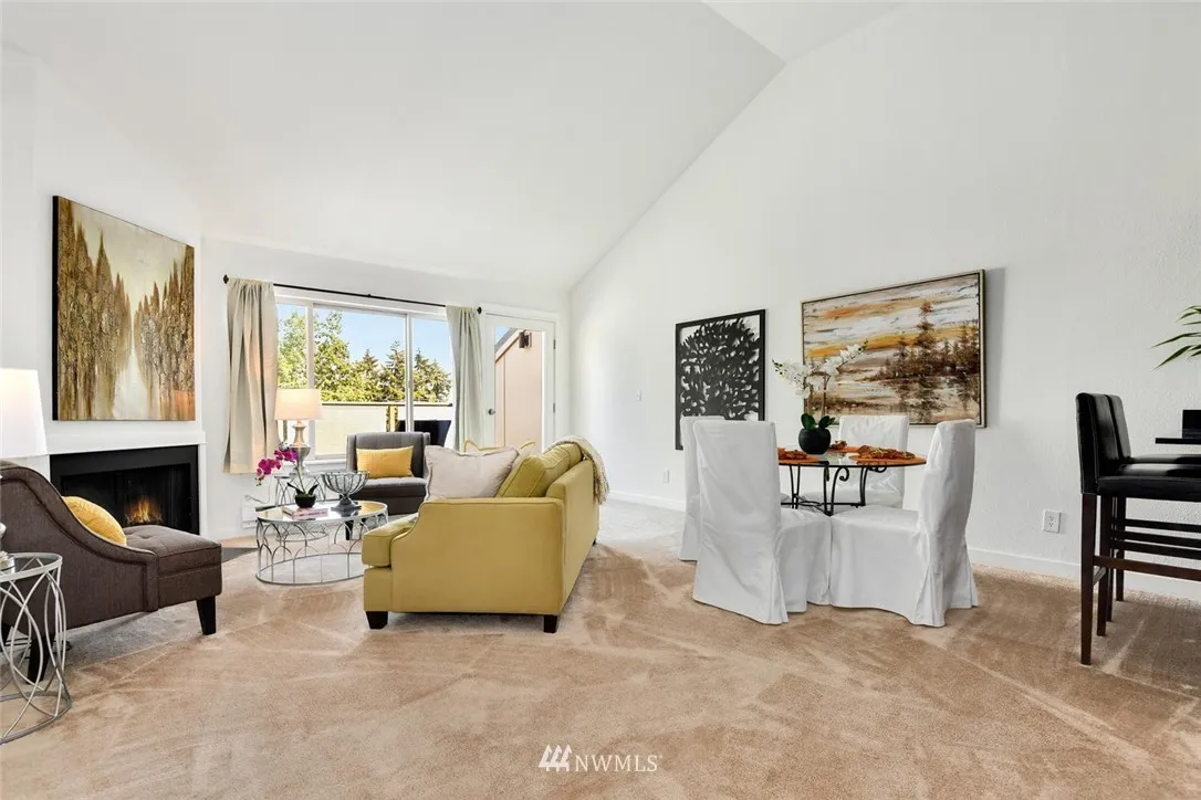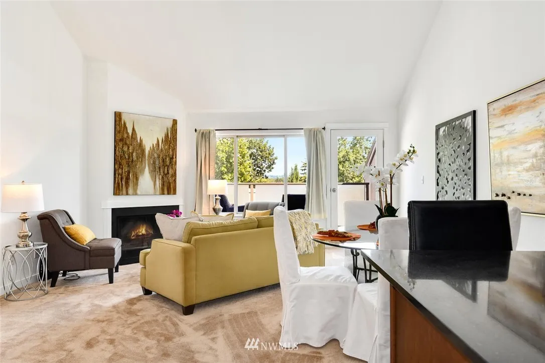 Top floor, corner unit townhome- best location in complex. Light filled open floor plan w/spacious rooms & soaring ceilings. Updated & move-in ready w/new paint & carpet. Master can accommodate king size bed; lots of closet space. 2nd bedroom has walk-in closet & 1/2 bath en-suite - room for shower addition. Large view deck. Fantastic location by Magnuson Park- acres of trails, lakefront, sport fields, dog park & dining. Near U-Village, UW, transit & light rail. Low dues- $285/mo, no assessment.