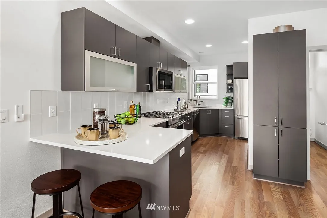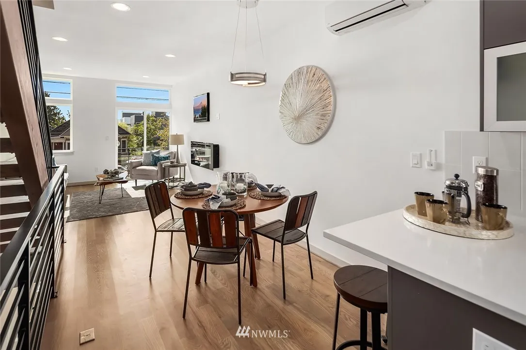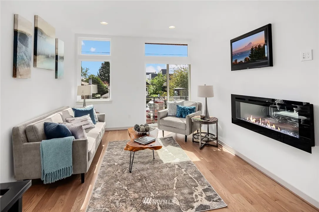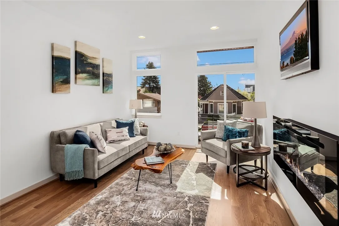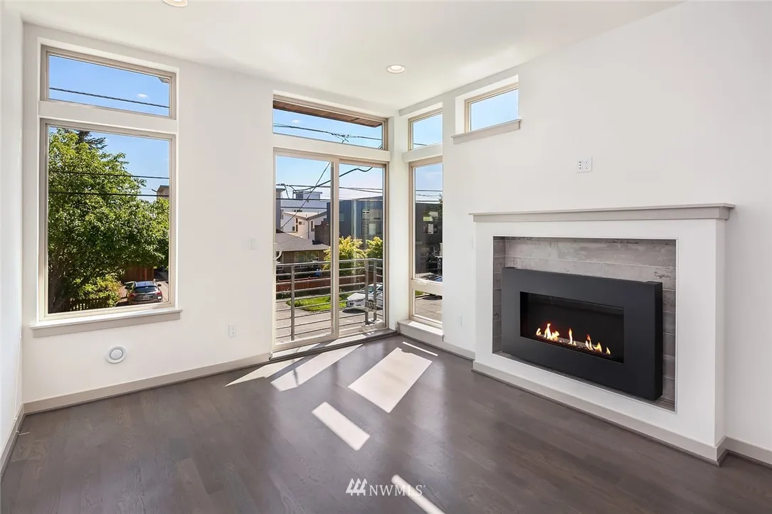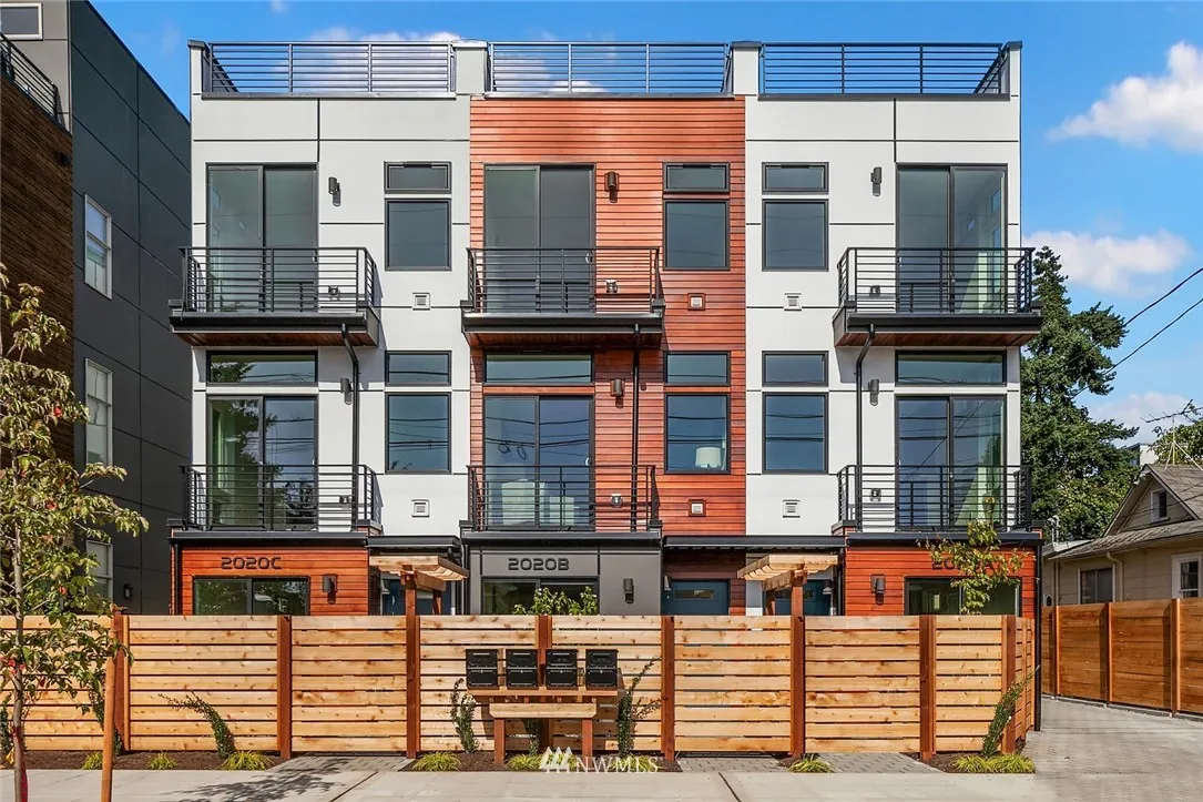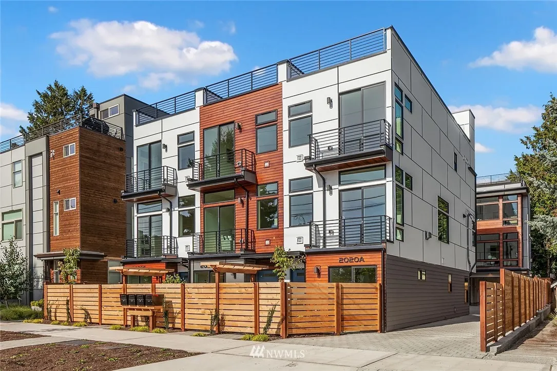 Tastefully designed corner home by MRN Homes in excellent Ballard location.Featuring a desirable open floor plan with top of the line finishes, tons of natural light, chef's kitchen w/SS appliances, modern fireplace, sleek hardwood floors and A/C. Spacious top floor master bedroom with 5-piece deluxe bath, soaking tub, and large walk-in closet. Entertain on the huge roof top deck with nice views. Close to local shops and restaurants. Off street reserved parking space included.4 Star Built Green.