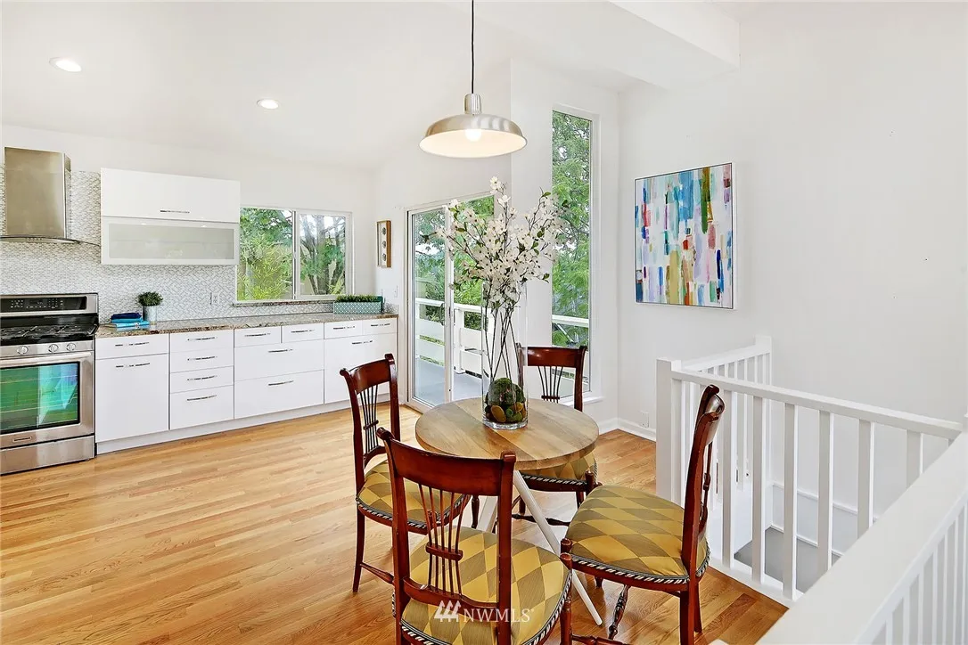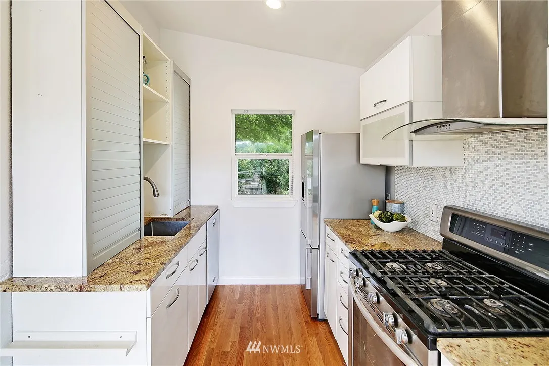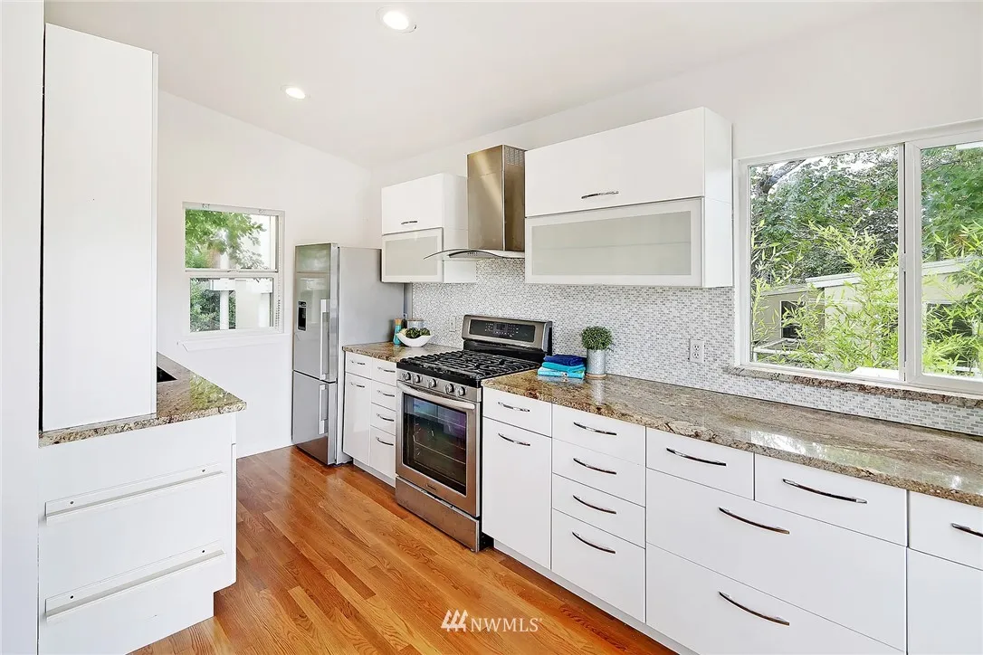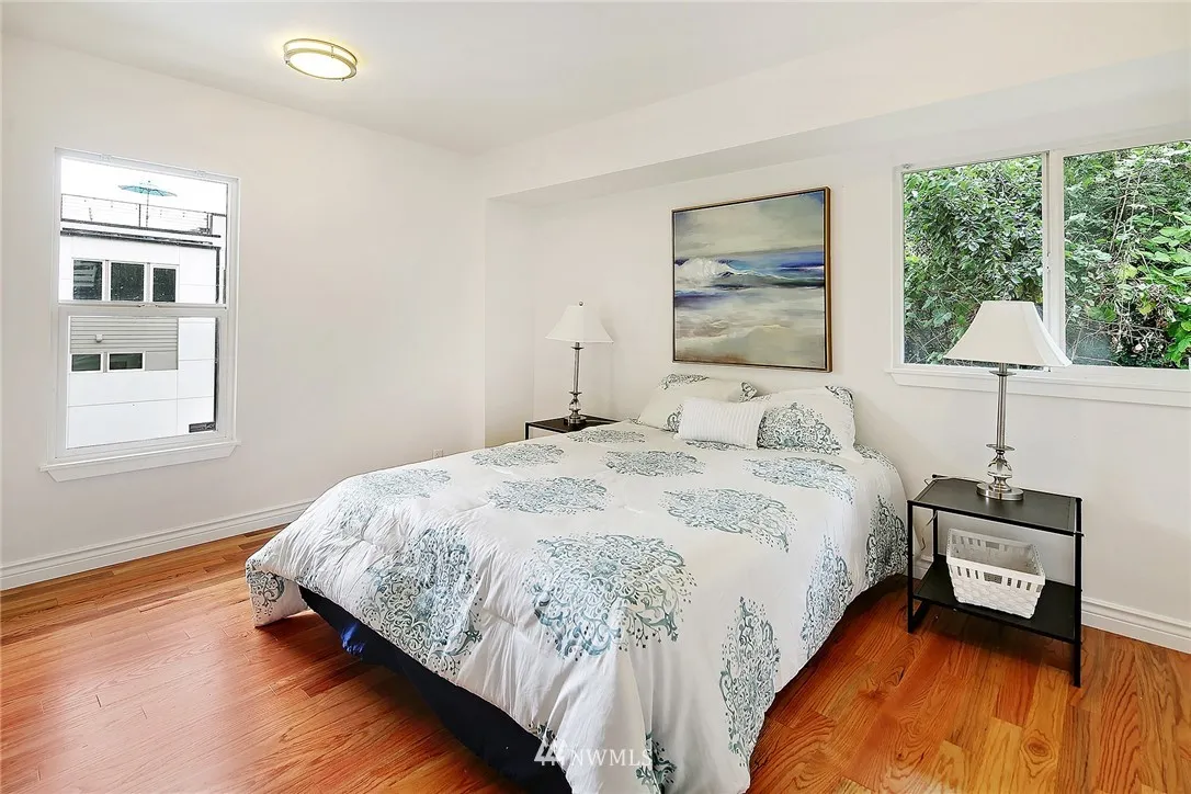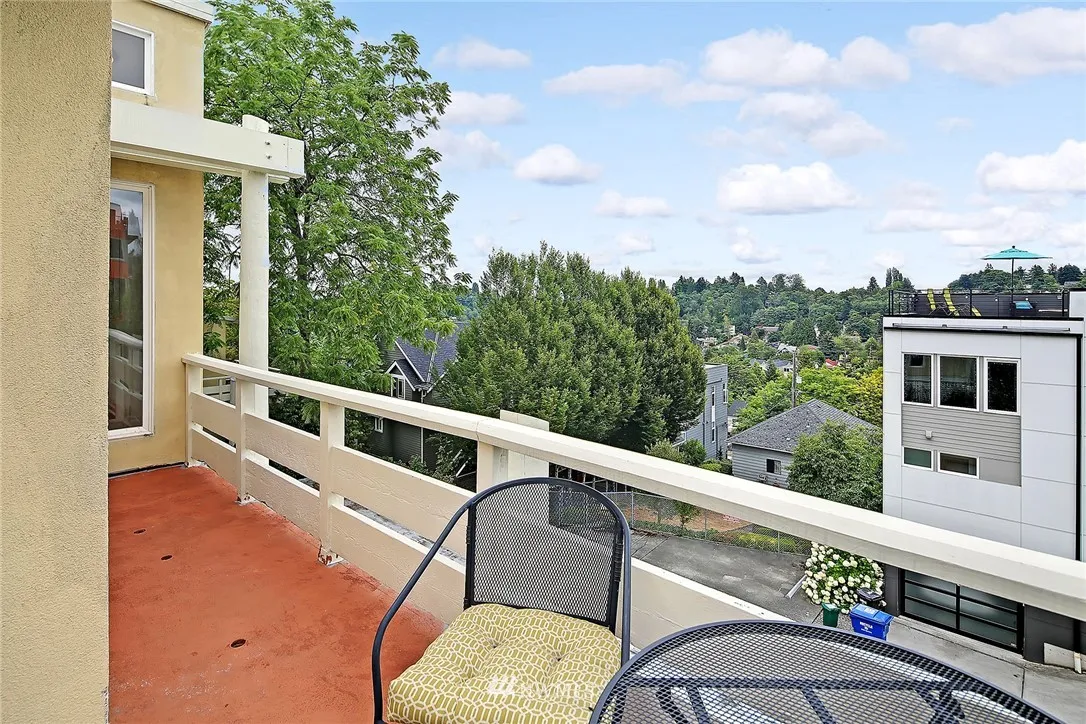 Two level townhome located in a small enclave of homes, surrounded by community gardens. The open kitchen looks onto the living space with cathedral ceilings, hardwoods & fireplace. Take in the territorial views from one of two private decks, brilliant for entertaining! 2 bdrms, 1.5 baths, room to add a shower in the half bath. Close to parks, shops restaurants, bars, coffee houses and groceries. An easy bike or transit ride to downtown and a convenient commute to the Eastside. Garage parking.