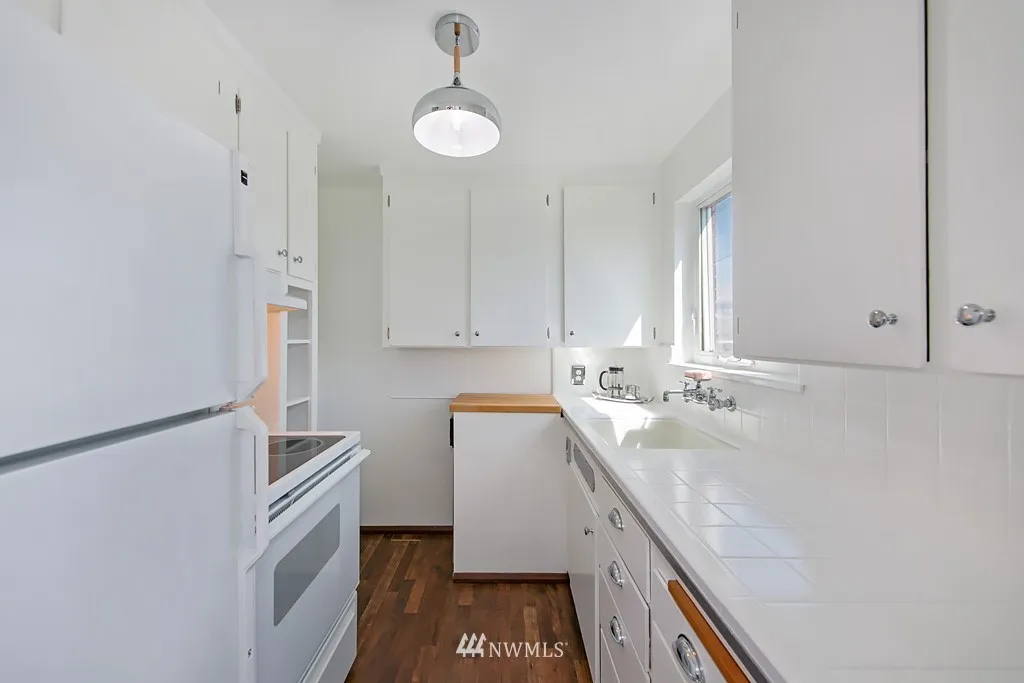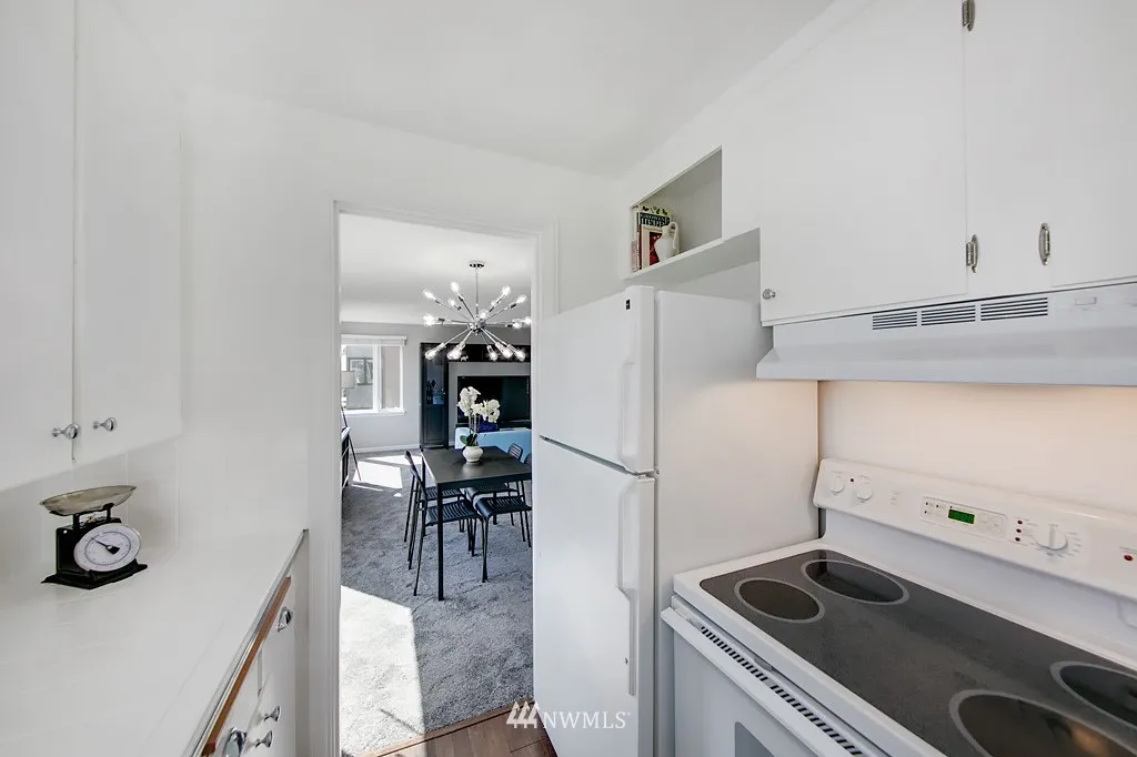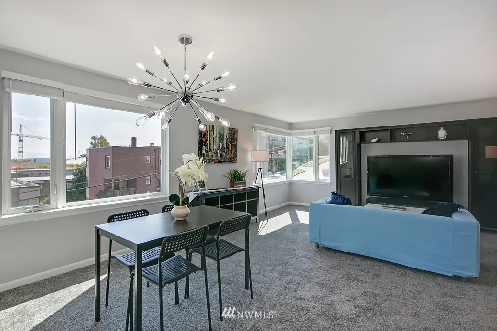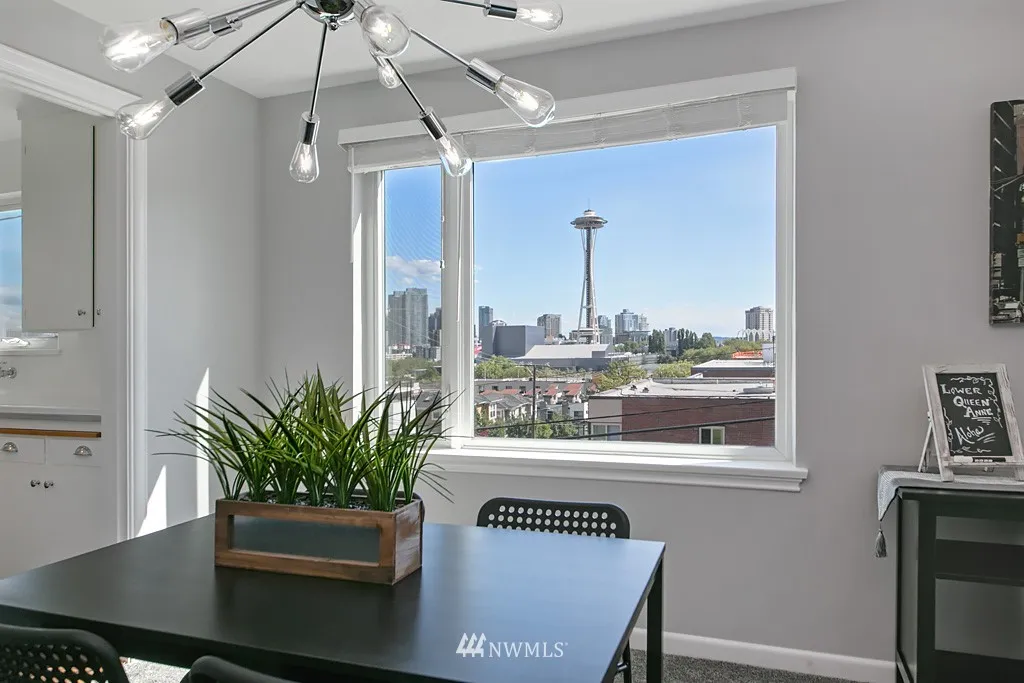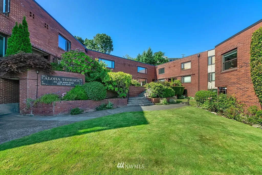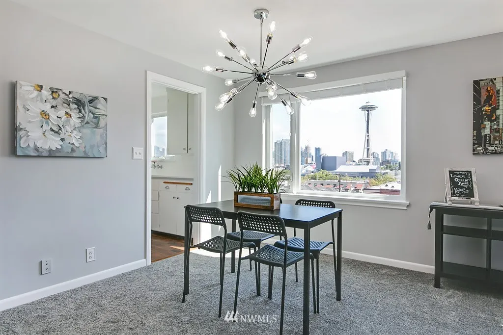 Great deal on this spectacular co-op perched on the south slope of Queen Anne, dues include property tax, heat and hot water! Soak in the stunning city and space needle views from this refreshed top floor, corner unit with one shared wall and a private entry. This location can't be beat, steps to the monorail, anything you need is right out your front door; catch a game, see the opera or experience Bumbershoot! Well-managed Aloha Terrace has bike storage, laundry room & park like courtyard.