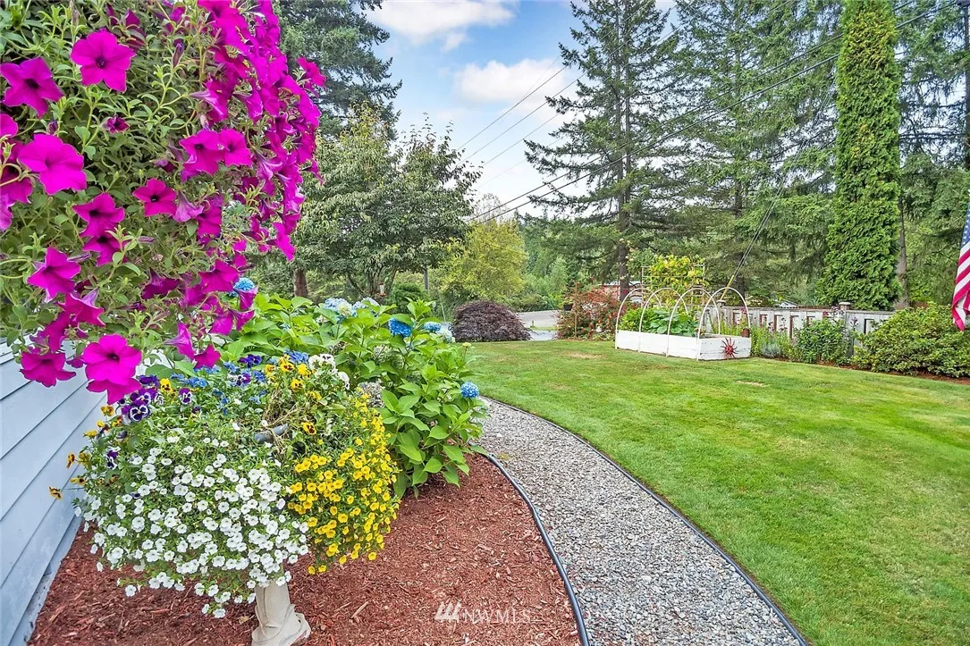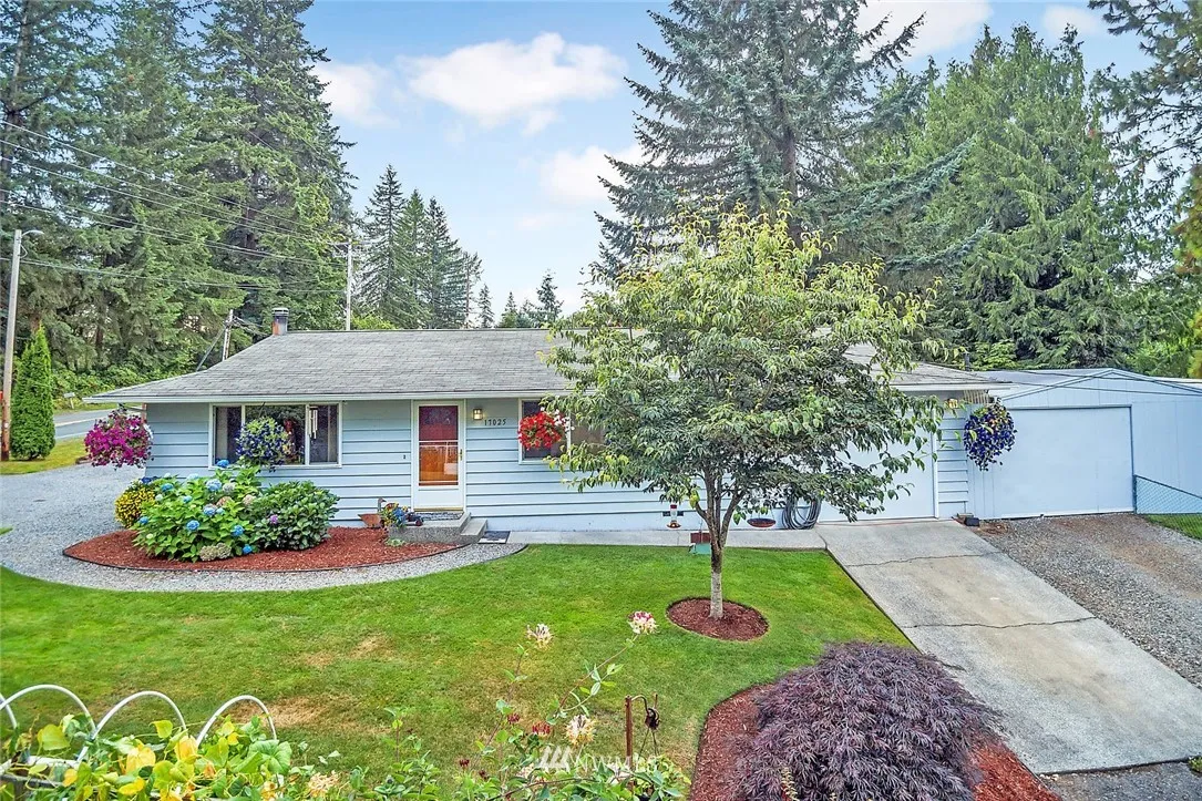 Located in desirable Three Lakes area of Snohomish! Lovely 3 Bedroom Rambler on large corner lot! Light & Bright Kitchen w/eating area. Master bedroom w/slider access to backyard. Original hardwood floors throughout living room, hallway & bedrooms. One car attached garage *PLUS* Huge 18x40 Shop/Building [Room for 4 Cars]! Corner lot features tons of parking with access from both roads. Fully fenced, front & back. Gorgeous landscaping & garden space. Near County Parks! Snohomish School District!