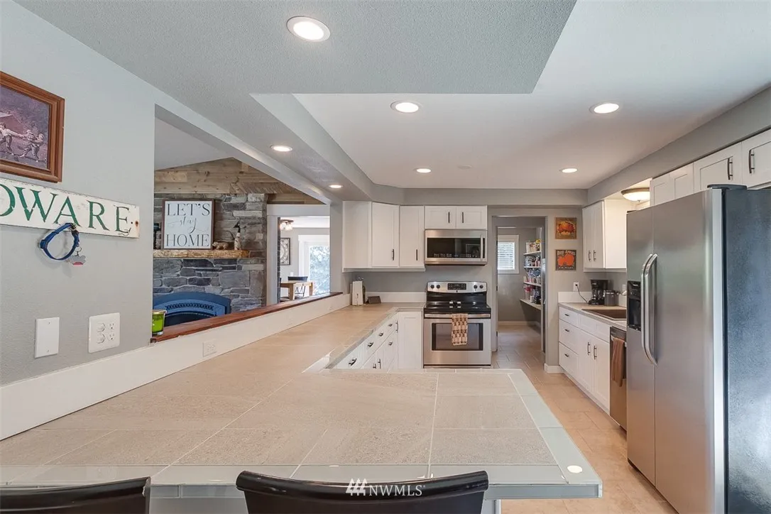 NEWLY UPDATED 3 bdrm Camano Island Home! Fantastic north end location. Views of Skagit Bay, Mount Baker, Cascade Mtns, farmland. New kitchen - cabinets, ss appliances, tile, TONS of cupboard space! NEW luxury vinyl plank flooring, fresh paint, new windows, deck, fixtures, bathrooms, custom barn door. Raised ceiling to make vaulted in living room creates a very open feel. Walk in pantry, new wet bar! New back patio for entertaining! Updated garden/storage shed. Breathtaking sunrises!!!