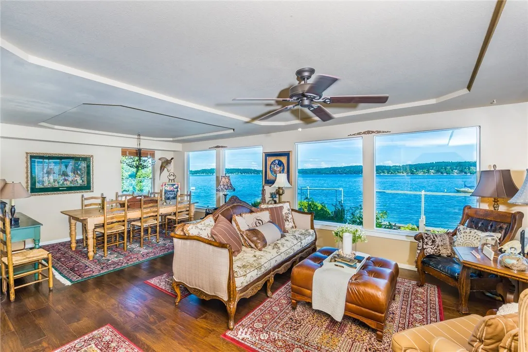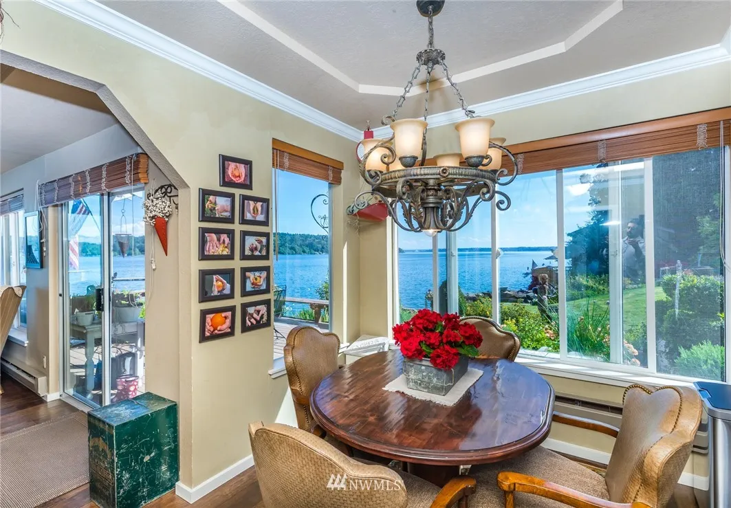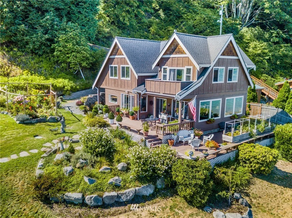 Soak in panoramic views from both levels of this picturesque, beachfront home. Expansive, lush landscaping offers fenced gardening, firepit, water features, & gentle, grassy slope to 150’ of low-bank waterfront. Extensive 2010 remodel crafted the luxurious master suite, soaring ceilings of upper level family room & matched the home to the natural beauty of its surroundings. Enjoy the still serenity of this ocean retreat, just minutes from shopping/amenities. Shared floating dock. See 3D tour!