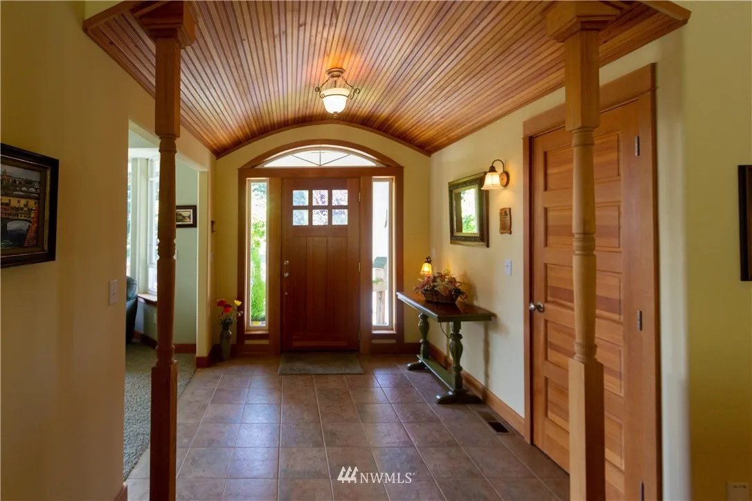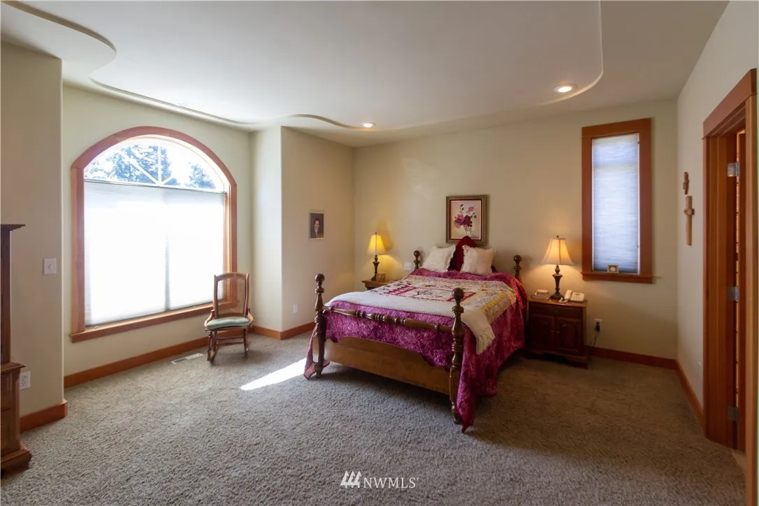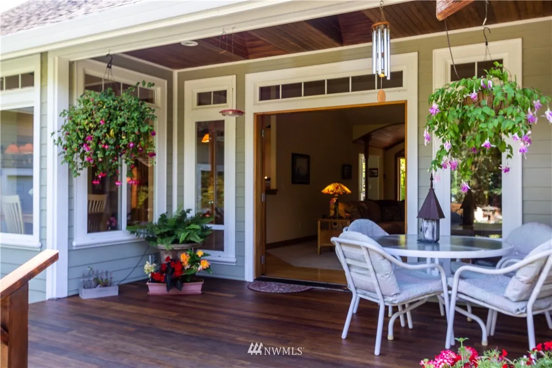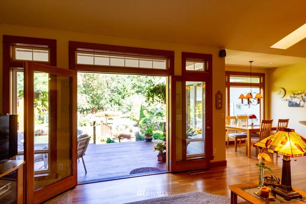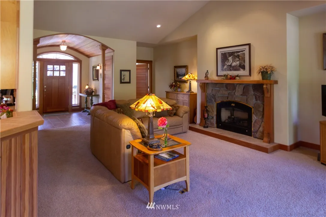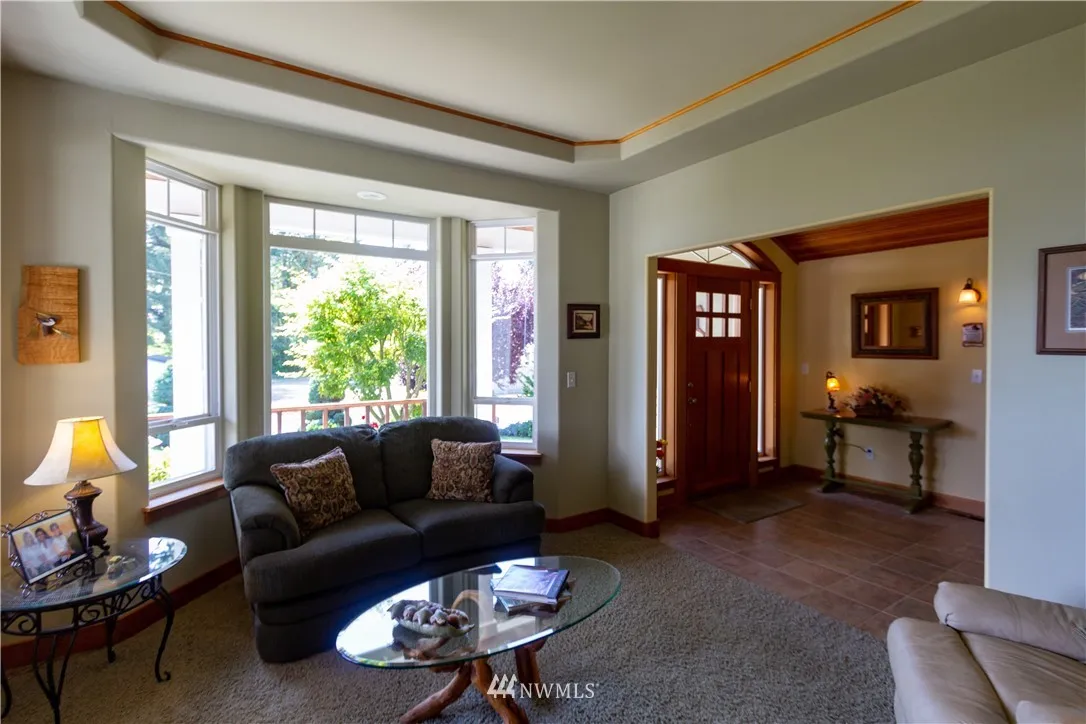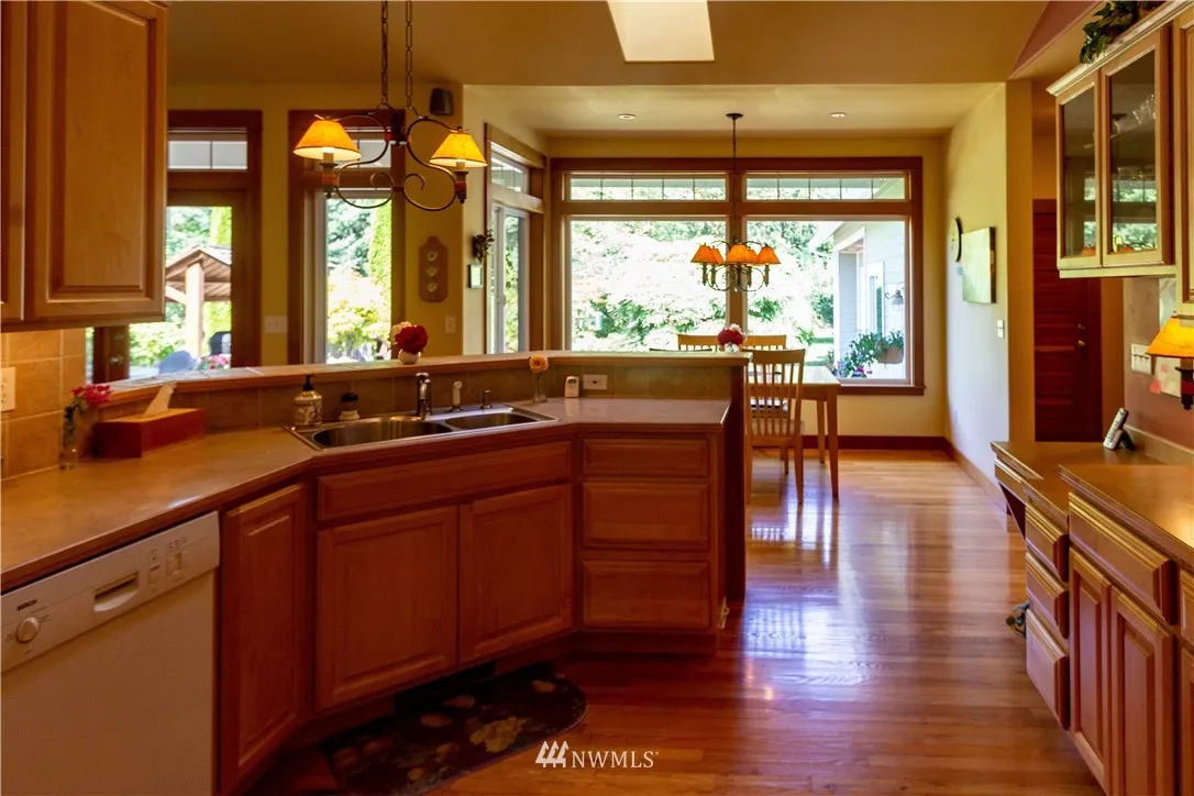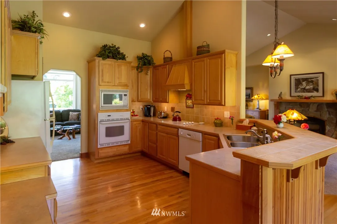 Beautifully kept custom with 3 bed rm. main floor living. Many cust. features. 9 ft & vaulted ceilings, custom windows, decor lighting, wood floors, master w/walk in, glass blk shower, 2 sinks, lg utility rm with cabs .upstairs bonus rm plumbed for wet bar, lg. heated shop/hobby rm. lg 2 car garage Ht Pump, new oven and glass cook top, Sprinklers, outside lighting, covered deck, fruit trees, water fall, Mt Rainier and water View, green belt in bk Yard, com beach access. Close shopping.