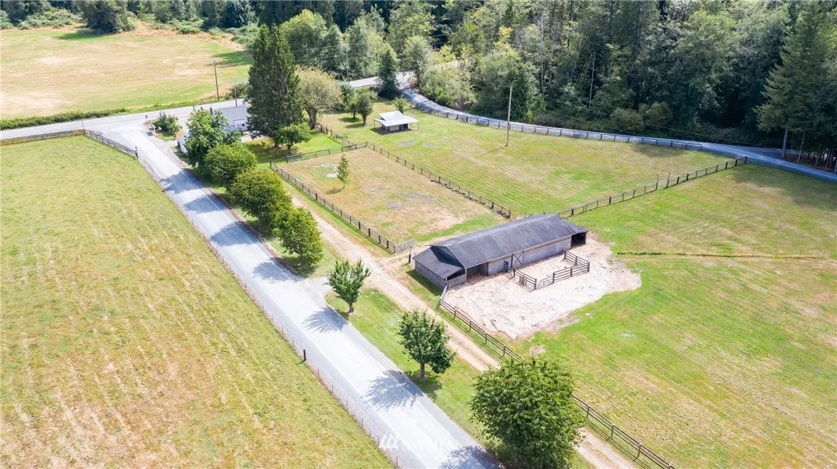 TWO HOMES on 6.8 acres ready for your horses! Main home nestled in the woods at end of private drive. Fenced pastures, 1,200 s/f barn w/3 stables and loafing area.The main home offers one level, 2204 s/f, hardwood floors, attached 2 car gar, surrounded by gorgeous trees and natural landscaping. The second home has 2 bedrooms and a full upper level for additional living space or storage. A detached garage, shop, outbuildings. Beautiful fruit trees line the driveway leading to the main home.