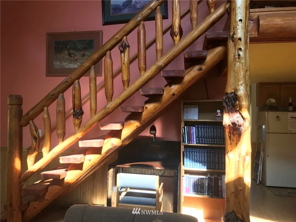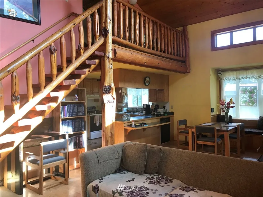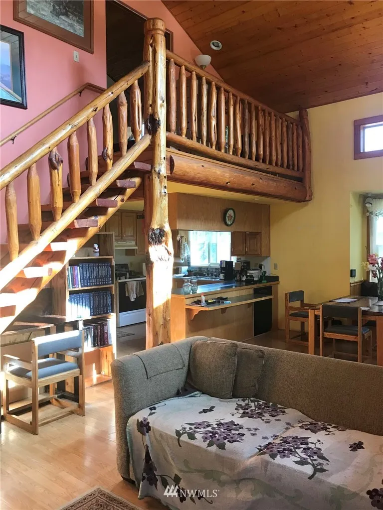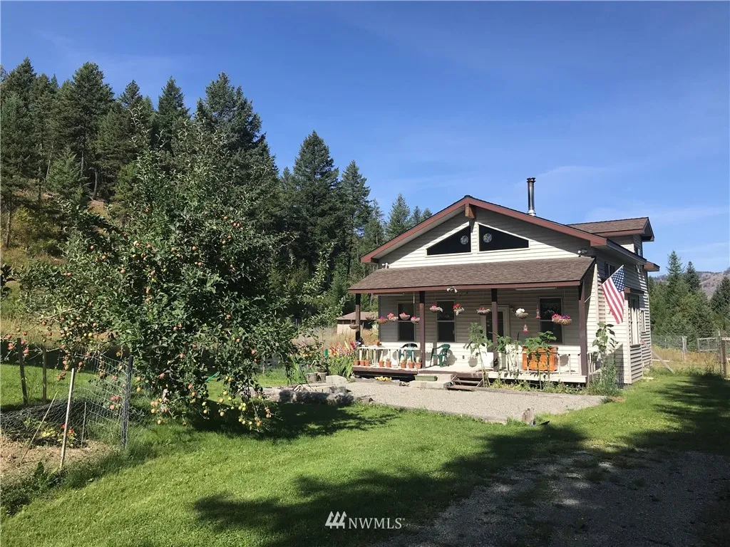 Beautiful custom cabin featuring hand hewed log staircase, vaulted ceilings, warm cozy wood stove, adorable custom kitchen & spacious private master suite w/private deck. Stroll through your mature garden with apple & cherry trees for your baking delight! But don't miss the huge 60x40 shop! With a 5 ton hoist & trolley & welded steel frame construction. You can park 6 "normal" cars or 1 massive log truck in here! Has a tool room & an office if you are looking to run your own truck business!