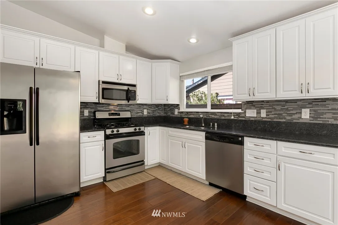 Don't miss this sweet rambler tastefully updated & move-in ready! Cozy up to your gas fireplace on fall nights in your spacious living area! Light & bright kitchen features granite counter tops, beautiful tile backsplash, stainless steel appliances & dining area w/sliding door to back deck. Master features double closets & master bath w/gorgeous tiled shower. Enjoy one-level living! Newer roof, trex deck & fenced backyard - no neighbors behind you! Great location, close to schools, Boeing & I-5.