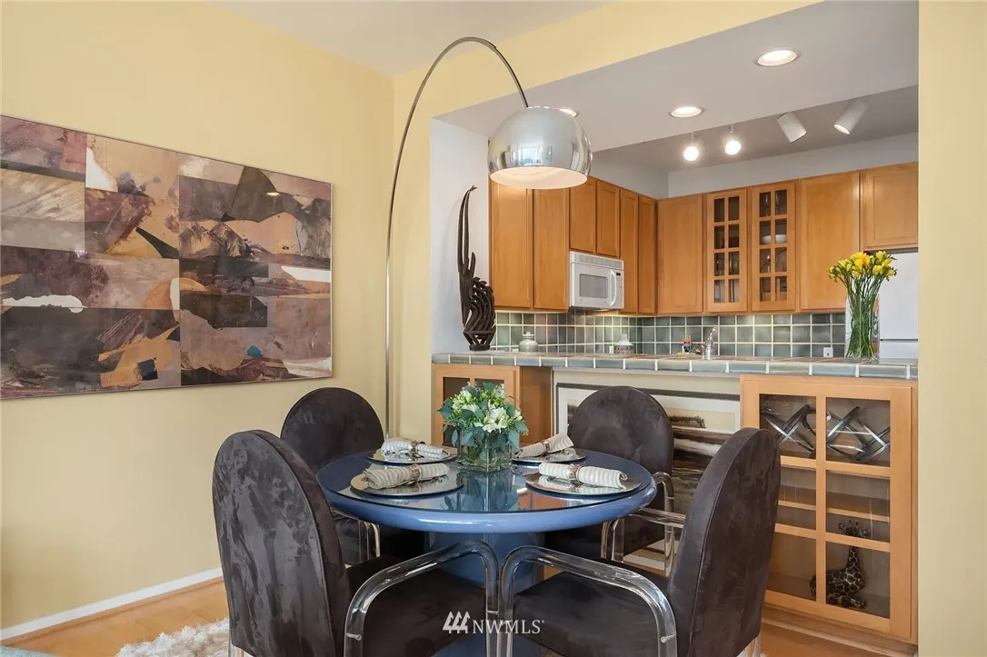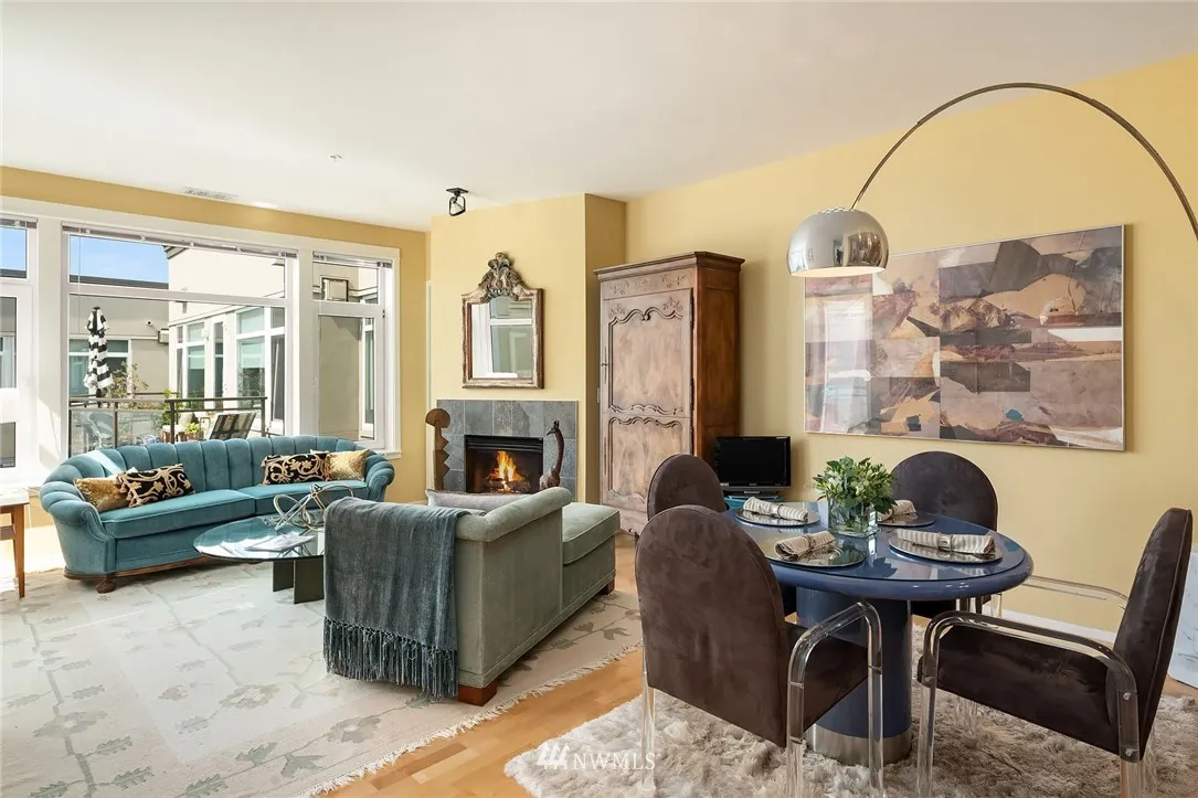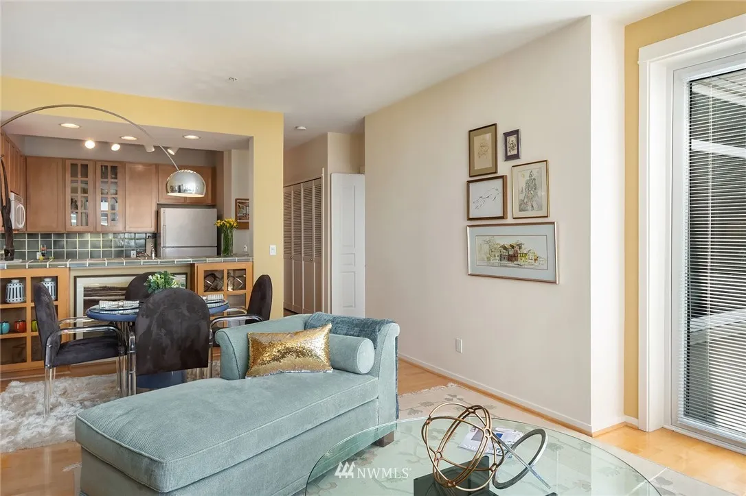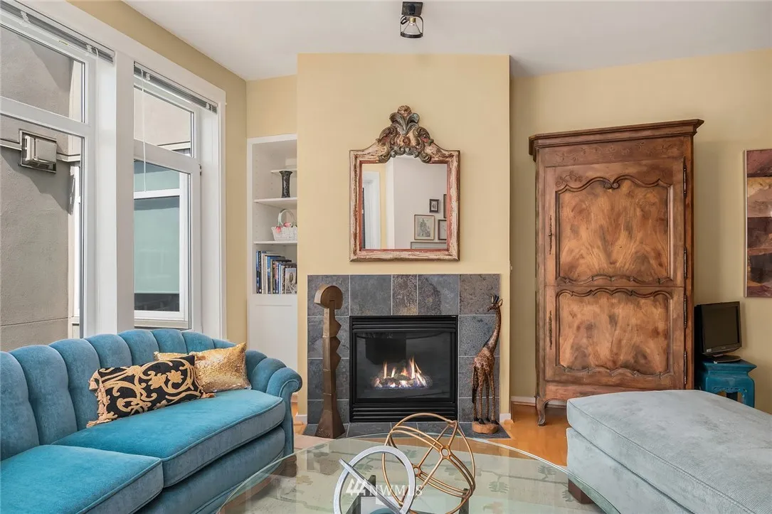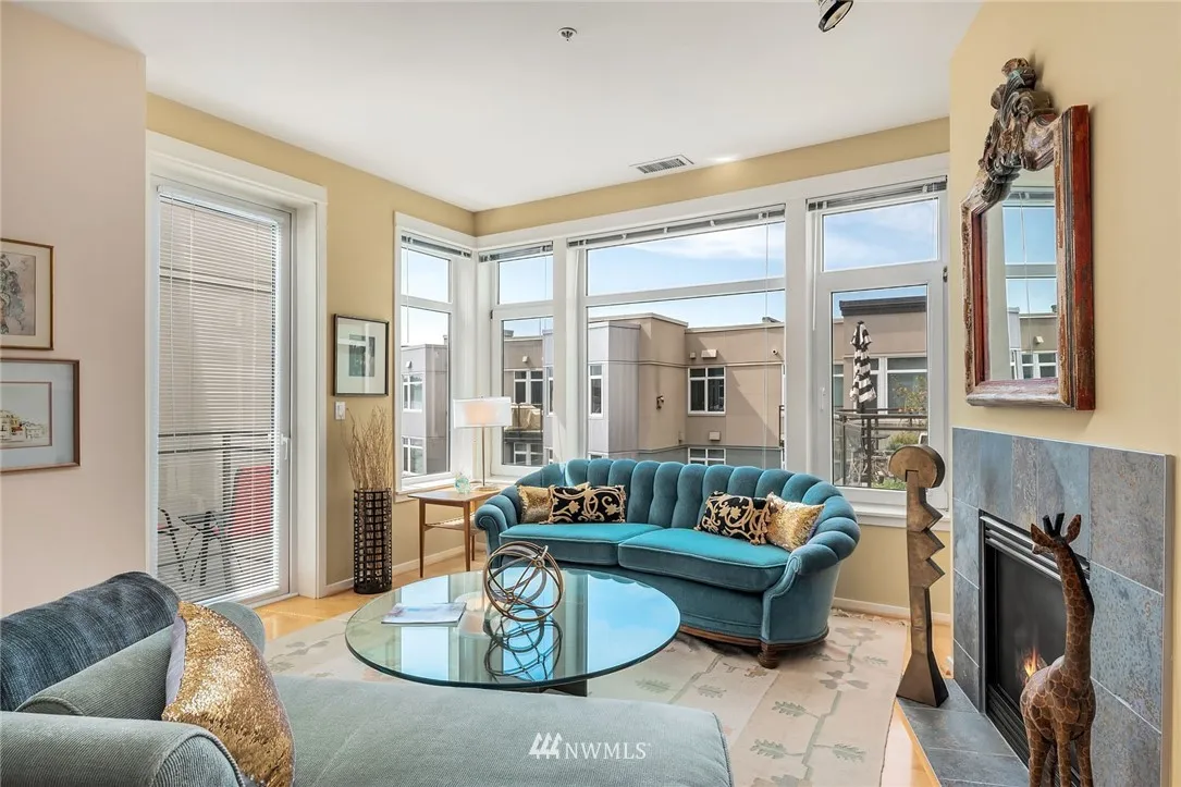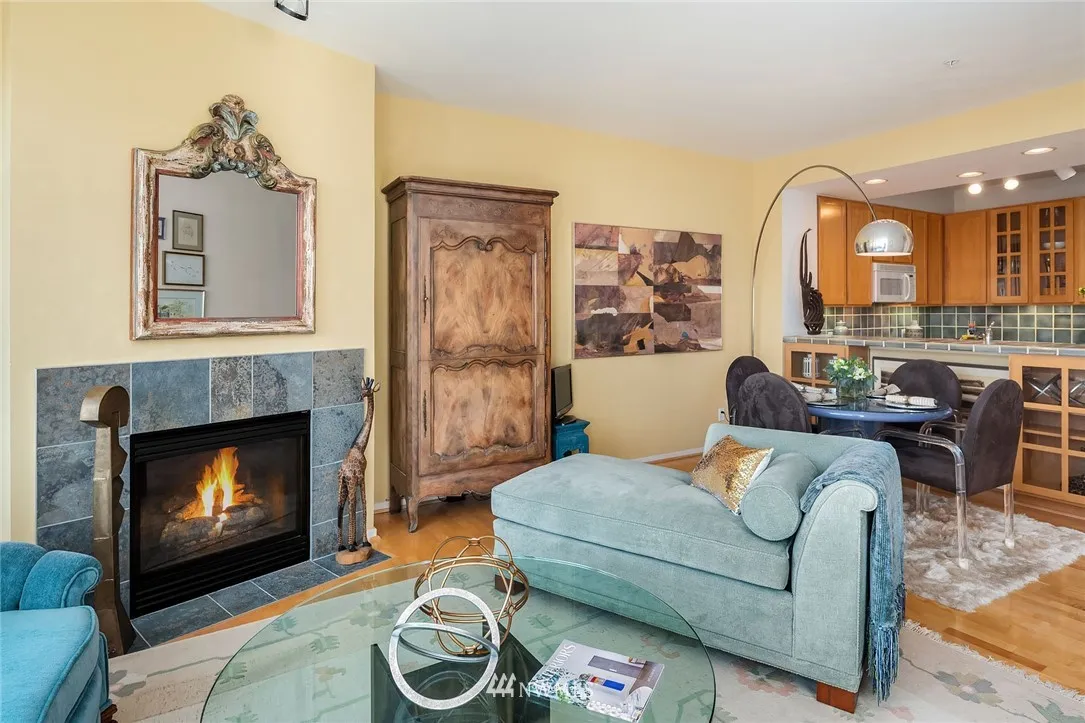 New price on this rarely avail top flr 1BR+Den home! Beautifully maintd w/cstm built-in's. Gracious open living area w/gas FP & fabulous kitchn w/gas cookg & cntrspc. Den cld double as a guest ste. Priv deck w/partial snd views. Luxury amen incl concierge, exer rm, party rm, spa & rooftop deck w/sweepg views of Elliott Bay! Outstanding loctn - just steps to PPMkt, Myrtle Edwards Pk, dining & shoppg. Sec prkg & stor too. Pets okay & no rental cap!
