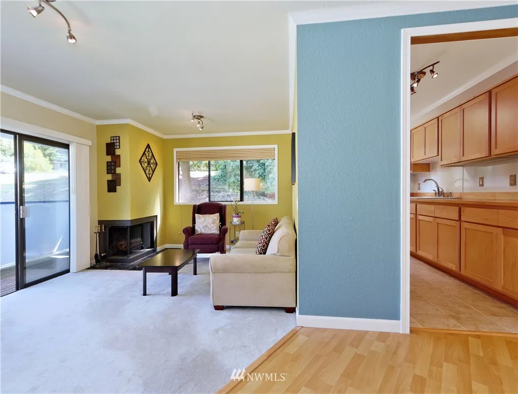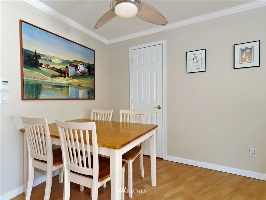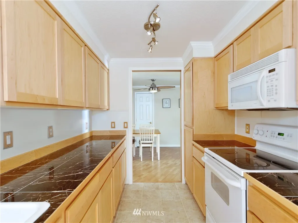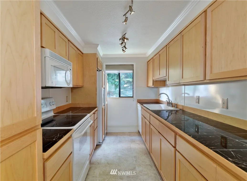 SUPER CLEAN TOP FLOOR END UNIT, remodeled 2006, 2 Bedroom 939 Sq Ft, spacious loft, private deck, fresh interior paint, Italian marble kitchen countertops, maple cabinets, vaulted ceilings, crown moulding accented by custom lighting, all appliances stay, new blinds, new hot H20 tank, HOA $255/M, 2 assigned parking, some visitors parking, GREAT LOCATION, mins walk to stores, Library, banks, daycare, restaurants, close to bus(#252,255,257), express bus to Seattle weekdays. Great schools.