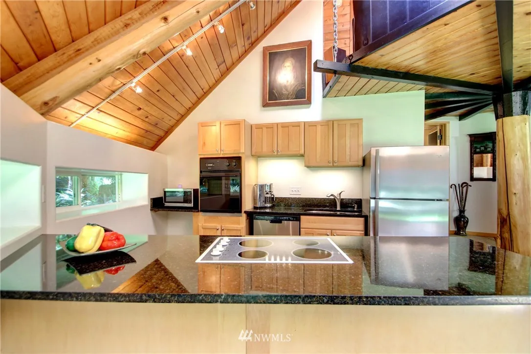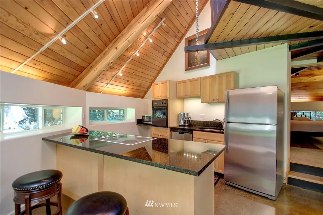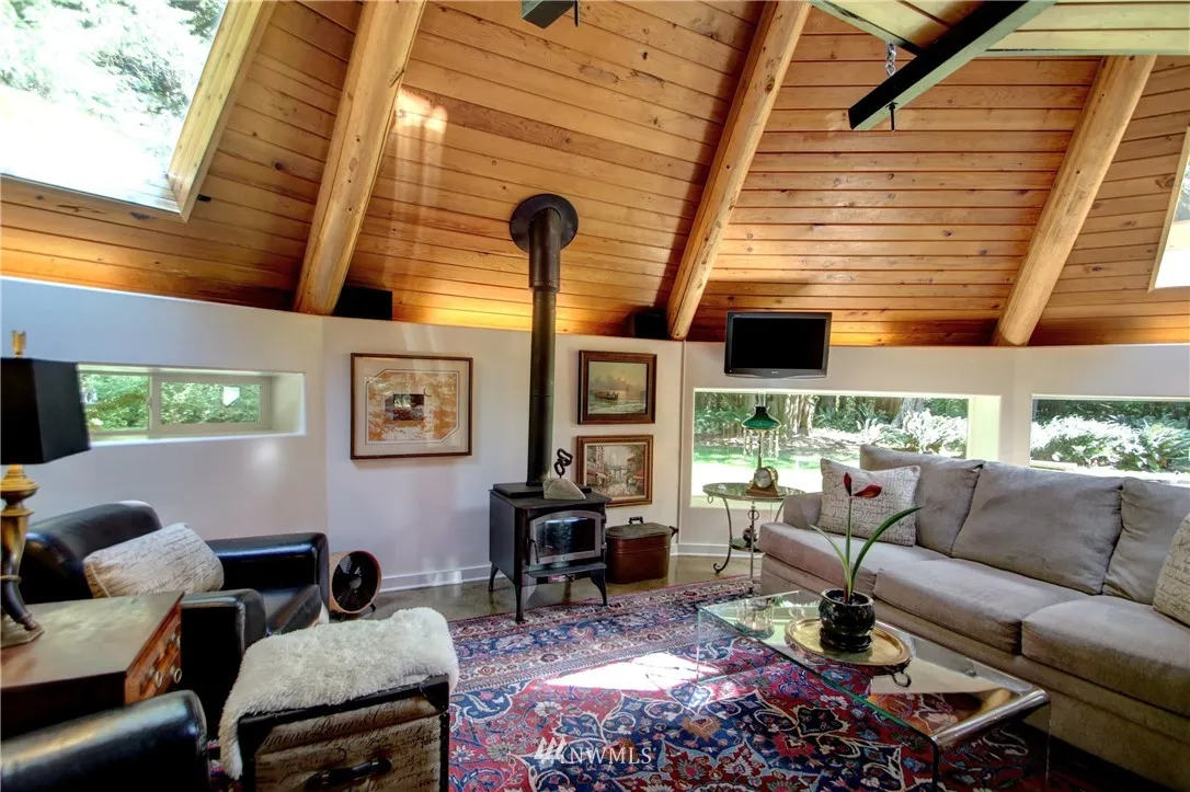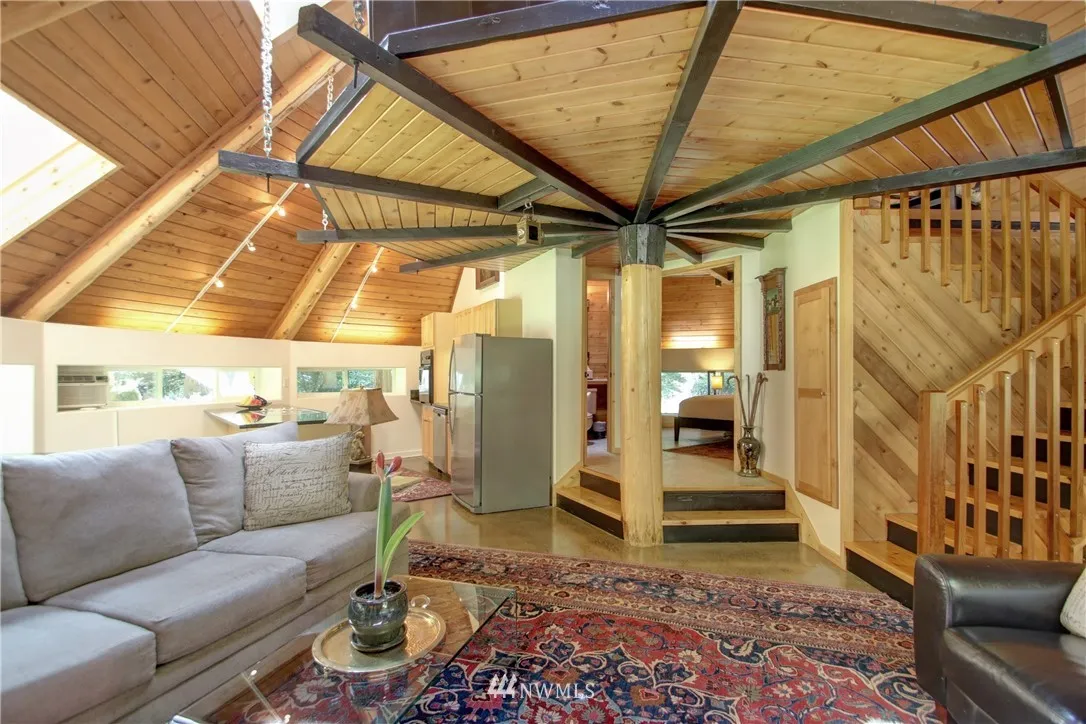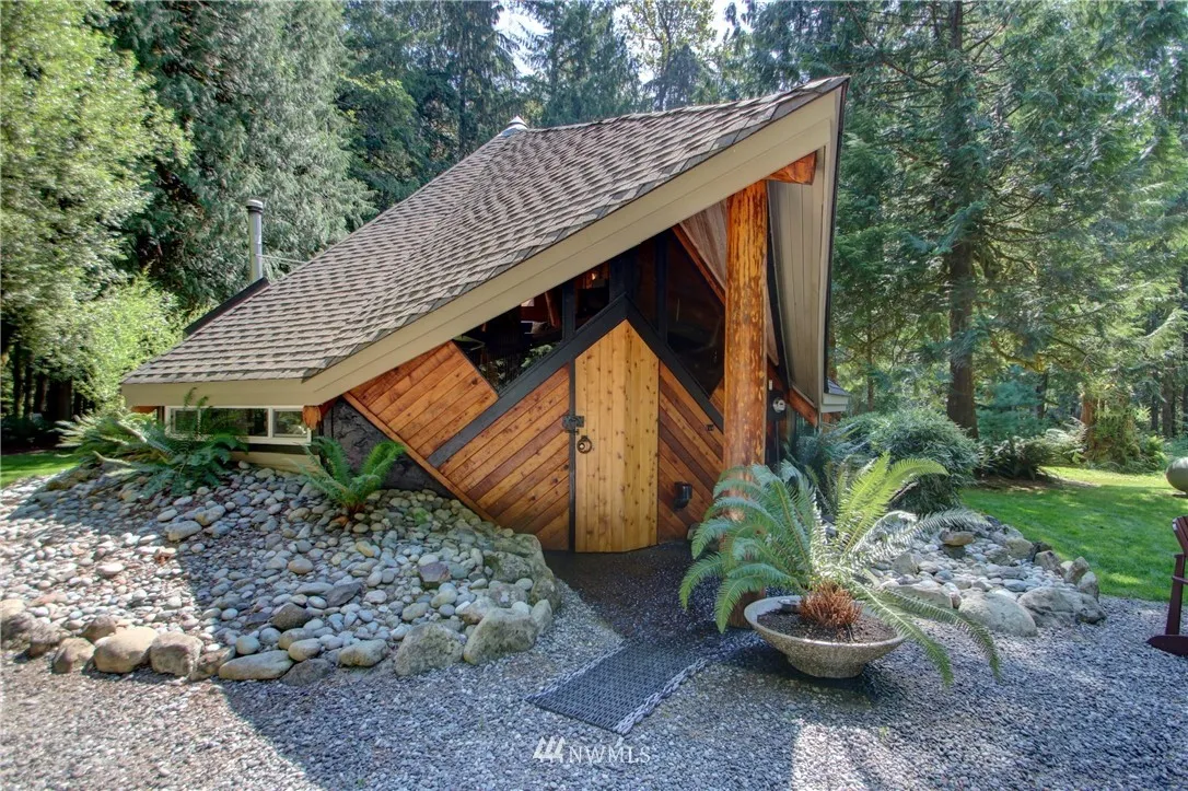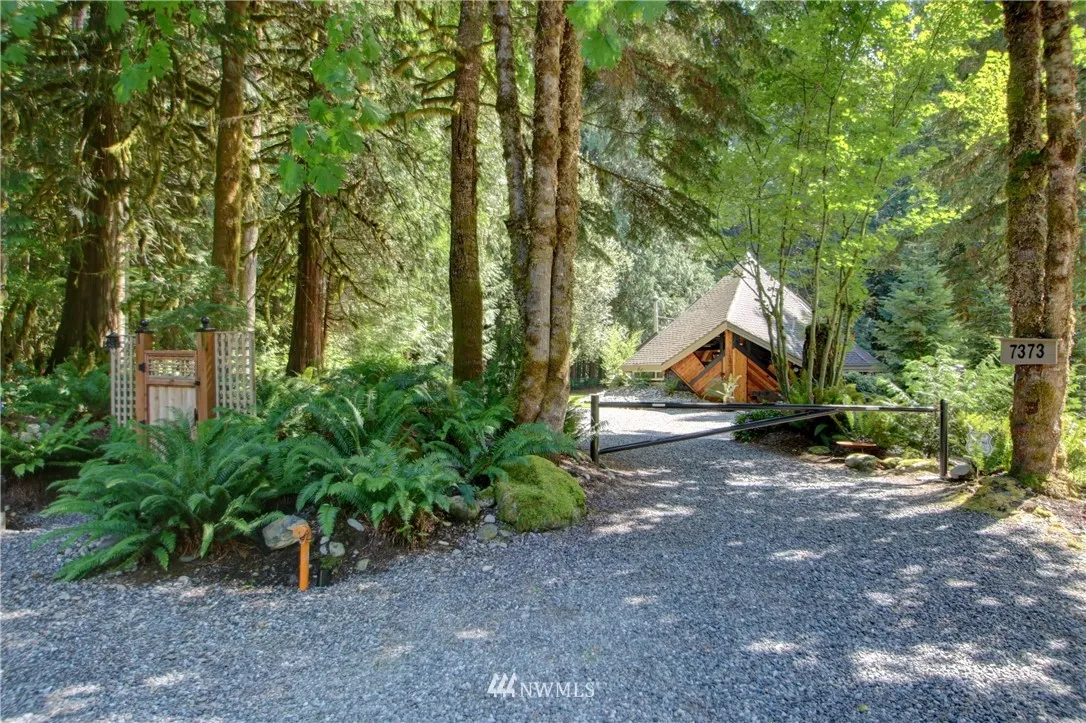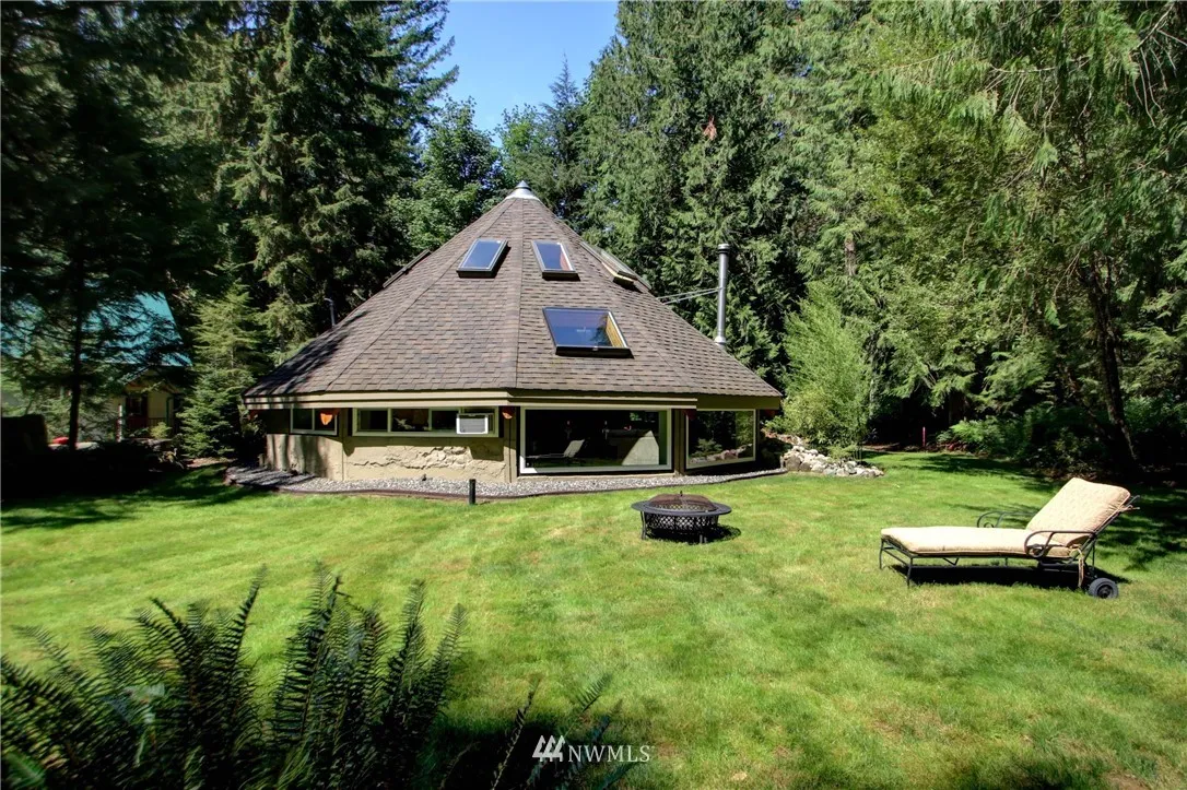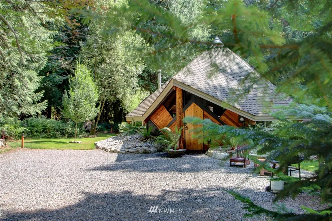 Magical dodecagon (12 sided) one of a kind private home surrounded by forest & amazing landscaping with gated driveway.Property is 17,760 sq. ft., plus backs to trust land.Features include radiant floor heat, black granite kitchen counter tops, lots of log & tongue & groove wood accents, 7 skylights, loft, jetted master bath tub.Windows face forest, you feel like you are in the forest! Furniture negotiable. Sunny yard is landscaped with possible garden space. Short walk to river & trails. Enjoy!