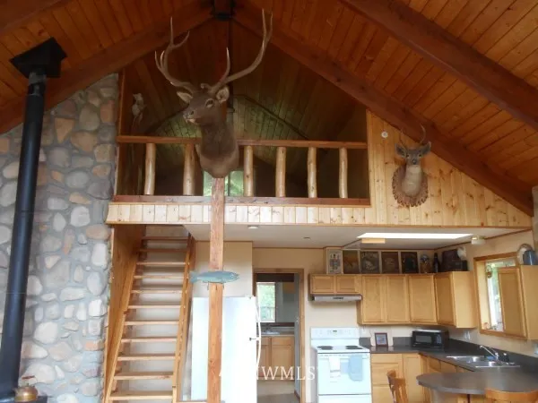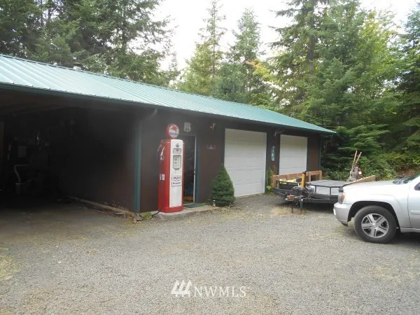 This beautiful Chalet style home features a spectacular wide open view of the surrounding forests and hills through the nearly totaly windowed front of the house. Live like you are in the wildes of Montana yet minutes from town. The garage/shop is 24X36 with two doors and a shop area completely finished and heated with a great wood stove so you can work on projects in the winter in total comfort. Attached to the garage is another 3 stall carport also 24X36.